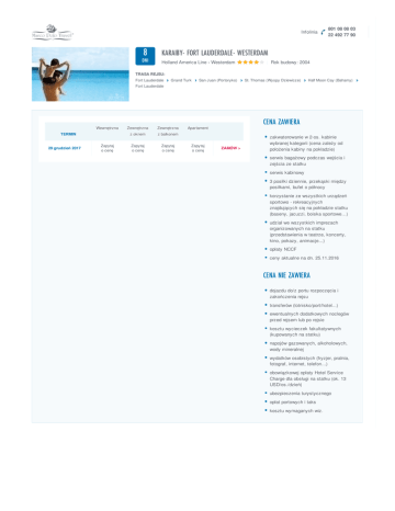 Infolinia 8 KARAIBY- FORT LAUDERDALE- WESTERDAM DNI Holland America Line - Westerdam 801 08 08 03 22 492 77 90 | Rok budowy: 2004 TRASA REJSU: Fort Lauderdale Grand Turk San Juan (Portoryko) St. Thomas (Wyspy Dziewicze) Half Moon Cay (Bahamy) Fort Lauderdale Wewnętrzna TERMIN 29 grudzień 2017 Zapytaj o cenę Zewnętrzna Zewnętrzna z oknem z balkonem Zapytaj o cenę Zapytaj o cenę CENA ZAWIERA Apartament Zapytaj o cenę ZAMÓW > zakwaterowanie w 2-os. kabinie wybranej kategorii (cena zależy od położenia kabiny na pokładzie) serwis bagażowy podczas wejścia i zejścia ze statku serwis kabinowy 3 posiłki dziennie, przekąski między posiłkami, bufet o północy korzystanie ze wszystkich urządzeń sportowo - rekreacyjnych znajdujących się na pokładzie statku (baseny, jacuzzi, boiska sportowe…) udział we wszystkich imprezach organizowanych na statku (przedstawienia w teatrze, koncerty, kino, pokazy, animacje...) opłaty NCCF ceny aktualne na dn. 25.11.2016 CENA NIE ZAWIERA dojazdu do/z portu rozpoczęcia i zakończenia rejsu transferów (lotnisko/port/hotel...) ewentualnych dodatkowych noclegów przed rejsem lub po rejsie kosztu wycieczek fakultatywnych (kupowanych na statku) napojów gazowanych, alkoholowych, wody mineralnej wydatków osobistych (fryzjer, pralnia, fotograf, internet, telefon...) obowiązkowej opłaty Hotel Service Charge dla obsługi na statku (ok. 13 USD/os./dzień) ubezpieczenia turystycznego opłat portowych i taks kosztu wymaganych wiz.
