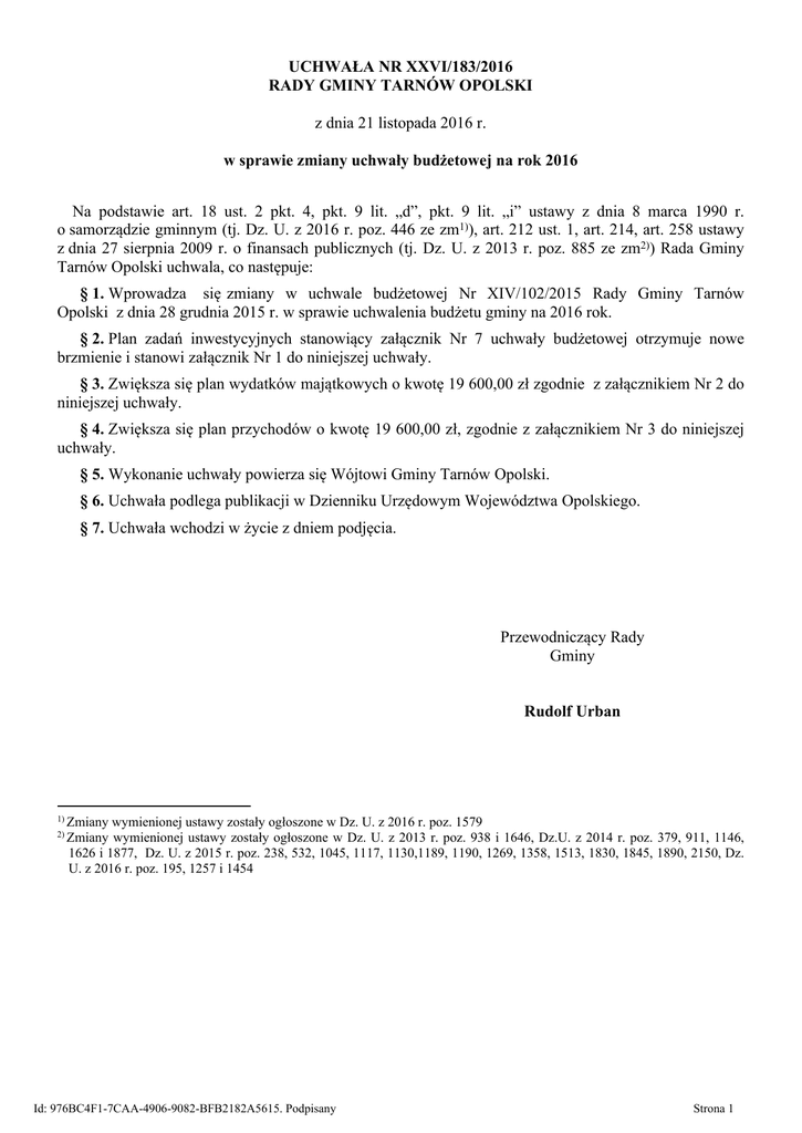 UCHWAŁA NR XXVI/183/2016 RADY GMINY TARNÓW OPOLSKI z dnia 21 listopada 2016 r. w sprawie zmiany uchwały budżetowej na rok 2016 Na podstawie art. 18 ust. 2 pkt. 4, pkt. 9 lit. „d”, pkt. 9 lit. „i” ustawy z dnia 8 marca 1990 r. o samorządzie gminnym (tj. Dz. U. z 2016 r. poz. 446 ze zm1)), art. 212 ust. 1, art. 214, art. 258 ustawy z dnia 27 sierpnia 2009 r. o finansach publicznych (tj. Dz. U. z 2013 r. poz. 885 ze zm2)) Rada Gminy Tarnów Opolski uchwala, co następuje: § 1. Wprowadza się zmiany w uchwale budżetowej Nr XIV/102/2015 Rady Gminy Tarnów Opolski z dnia 28 grudnia 2015 r. w sprawie uchwalenia budżetu gminy na 2016 rok. § 2. Plan zadań inwestycyjnych stanowiący załącznik Nr 7 uchwały budżetowej otrzymuje nowe brzmienie i stanowi załącznik Nr 1 do niniejszej uchwały. § 3. Zwiększa się plan wydatków majątkowych o kwotę 19 600,00 zł zgodnie z załącznikiem Nr 2 do niniejszej uchwały. § 4. Zwiększa się plan przychodów o kwotę 19 600,00 zł, zgodnie z załącznikiem Nr 3 do niniejszej uchwały. § 5. Wykonanie uchwały powierza się Wójtowi Gminy Tarnów Opolski. § 6. Uchwała podlega publikacji w Dzienniku Urzędowym Województwa Opolskiego. § 7. Uchwała wchodzi w życie z dniem podjęcia. Przewodniczący Rady Gminy Rudolf Urban 1) Zmiany wymienionej ustawy zostały ogłoszone w Dz. U. z 2016 r. poz. 1579 wymienionej ustawy zostały ogłoszone w Dz. U. z 2013 r. poz. 938 i 1646, Dz.U. z 2014 r. poz. 379, 911, 1146, 1626 i 1877, Dz. U. z 2015 r. poz. 238, 532, 1045, 1117, 1130,1189, 1190, 1269, 1358, 1513, 1830, 1845, 1890, 2150, Dz. U. z 2016 r. poz. 195, 1257 i 1454 2) Zmiany Id: 976BC4F1-7CAA-4906-9082-BFB2182A5615. Podpisany Strona 1 Załącznik Nr 1 do Uchwały Nr XXVI/183/2016 Rady Gminy Tarnów Opolski z dnia 21 listopada 2016 r. PLAN ZADAŃ INWESTYCYJNYCH NA ROK 2016 L.P. 1 DZIAŁ 900 ROZDZIAŁ NAZWA ZADANIA 90001 Budowa kanalizacji sanitarnej w miejscowości Nakło, Tarnów Opolski, Miedziana wraz z przebudową oczyszczalni ścieków w Kosorowicach 2 900 90001 3 630 63095 4 5 921 801 92195 80101 Wykup sieci wodociągowokanalizacyjnej do działki nr 642/241 w miejscowości Kąty Opolskie Ścieżka pieszo-rowerowa (projekt) Montaż instalacji gazowej w budynku przy boisku sportowym na Osiedlu Zakładowym w Tarnowie Opolskim Termomodernizacja budynku Szkoły Podstawowej w Tarnowie Opolskim (projekt) Id: 976BC4F1-7CAA-4906-9082-BFB2182A5615. Podpisany WYDATEK w zł UZASADNIENIE REALIZACJI 700 000,00 Rozwiązywanie problemów gospodarki ściekowej na terenie gminy w miejscowościach: Nakło, Miedziana oraz Tarnów Opolski 62 000,00 Rozwiązywanie problemów gospodarki wodnej i kanalizacyjnej 94 000,00 Poprawa bezpieczeństwa mieszkańców gminy 20 000,00 Racjonalizacja zużycia energii 33 800,00 Racjonalizacja zużycia energii i ograniczenie emisji zanieczyszczeń Strona 2 6 801 80114 Zakup programu SIGMA do obsługi jednostek oświatowych 7 900 90015 Projekt i wykonanie 3 punktów oświetleniowych na ul. Łącznej w Kosorowicach 8 750 75023 Zakup programu do rejestracji VAT-u 9 10 11 12 13 750 700 900 921 900 7 300,00 Zwiększenie nadzoru nad jednostkami oświatowymi 23 000,00 Poprawa bezpieczeństwa na drogach gminnych przez ich prawidłowe oświetlenie 3 600,00 Usprawnienie pracy w urzędzie 75023 Modernizacja przejętego budynku PKP w Tarnowie Opolskim 112 300,00 Poprawa stanu technicznego budynków użyteczności publicznej 70005 Przejęcie gruntów pod drogi w Tarnowie Opolskim, Walidrogach i Nakle 40 000,00 _ 90095 Wykonanie sieci wodociągowej w Tarnowie Opolskim i Kątach Opolskich 70 000,00 Rozwiązywanie problemów gospodarki wodnej 20 000,00 Poprawa stanu technicznego budynków użyteczności publicznej 40 000,00 zł Rozwiązywanie problemów gospodarki wodnej 92195 Modernizacja instalacji elektrycznej w budynku świetlicy wiejskiej w Kątach Opolskich 90095 Id: 976BC4F1-7CAA-4906-9082-BFB2182A5615. Podpisany Wykonanie sieci wodociągowej w Walidrogach Strona 3 14 15 16 17 18 926 600 600 600 900 Budowa boiska sportowego w Nakle – etap I 92601 60016 Przebudowa drogi powiatowej nr 1712 O na odcinku Tarnów Opolski – Kosorowice 60016 Modernizacja ul. Pasiecznej w Tarnowie Opolskim (projekt i wykonanie) 60016 Modernizacja ul. Sosnowej w Tarnowie Opolskim (projekt i wykonanie) 90015 Projekt 3 punktów oświetleniowych na ul. Poziomkowej i 1 punktu na ul. Malinowej w Miedzianej 95 000,00 Poprawa warunków socjalno-bytowych mieszkańców 80 000,00 Poprawa stanu technicznego i bezpieczeństwa na drogach powiatowych 75 400,00 Poprawa stanu technicznego i bezpieczeństwa na drogach gminnych 65 200,00 Poprawa stanu technicznego i bezpieczeństwa na drogach gminnych 5 000,00 Poprawa bezpieczeństwa na drogach gminnych przez ich prawidłowe oświetlenie 3 400,00 Rozwiązywanie problemów gospodarki kanalizacyjnej 19 900 90001 Projekt budowy sieci kanalizacyjnej na ul. Dębowej w Tarnowie Opolskim 20 700 70005 Nabycie działki nr 464/1 obręb Kosorowice 15 000,00 - 21 921 92195 Plac zabaw w Przyworach 22 000,00 Poprawa warunków socjalno-bytowych mieszkańców Id: 976BC4F1-7CAA-4906-9082-BFB2182A5615. Podpisany Strona 4 22 23 24 754 921 600 75412 Zakup sani lodowych wraz z wyposażeniem – OSP Przywory 92195 Budowa grilla w Walidrogach (boisko) 60016 Odprowadzenie wód opadowych – przyłącze deszczowe ul. Klimasa – droga powiatowa nr 1712 O w Tarnowie Opolskim 6 300,00 Poprawa bezpieczeństwa na ternie gminy 6 000,00 Poprawa warunków socjalno-bytowych mieszkańców 6 000,00 Poprawa stanu technicznego i bezpieczeństwa na drogach powiatowych 18 000,00 - Usprawnienie pracy w placówce 25 801 80103 Zakup pieca CO do budynku oddziału przedszkolnego w Kątach Opolskich 26 801 80110 Zakup kserokopiarki do Gimnazjum w Tarnowie Opolskim 5 500,00 RAZEM 1 628 800,00 Id: 976BC4F1-7CAA-4906-9082-BFB2182A5615. Podpisany Strona 5 Załącznik Nr 2 do Uchwały Nr XXVI/183/2016 Rady Gminy Tarnów Opolski z dnia 21 listopada 2016 r. Zestawien