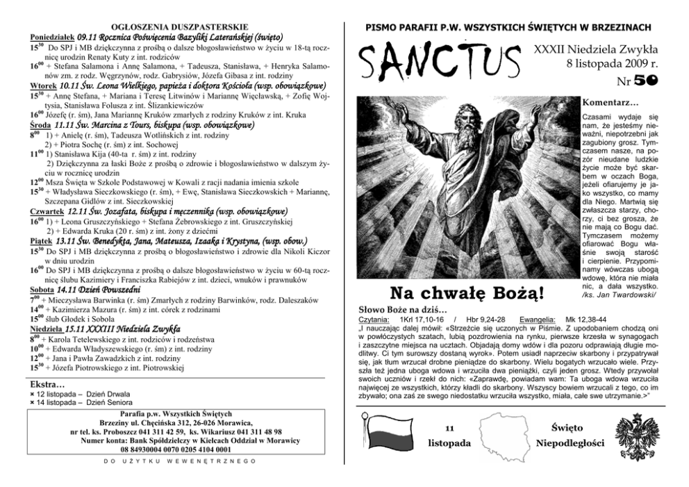OGŁOSZENIA DUSZPASTERSKIE Poniedziałek 09.11 Rocznica Poświęcenia Bazyliki Laterańskiej (święto) 1530 Do SPJ i MB dziękczynna z prośbą o dalsze błogosławieństwo w życiu w 18-tą rocznicę urodzin Renaty Kuty z int. rodziców 1600 + Stefana Salamona i Annę Salamona, + Tadeusza, Stanisława, + Henryka Salamonów zm. z rodz. Węgrzynów, rodz. Gabrysiów, Józefa Gibasa z int. rodziny Wtorek 10.11 Św. Leona Wielkiego, papieża i doktora Kościoła (wsp. obowiązkowe) 1530 + Annę Stefana, + Mariana i Teresę Litwinów i Mariannę Więcławską, + Zofię Wojtysia, Stanisława Folusza z int. Ślizankiewiczów 1600 Józefę (r. śm), Jana Mariannę Kruków zmarłych z rodziny Kruków z int. Kruka Środa 11.11 Św. Marcina z Tours, biskupa (wsp. obowiązkowe) 800 1) + Anielę (r. śm), Tadeusza Wotlińskich z int. rodziny 2) + Piotra Sochę (r. śm) z int. Sochowej 1100 1) Stanisława Kija (40-ta r. śm) z int. rodziny 2) Dziękczynna za łaski Boże z prośbą o zdrowie i błogosławieństwo w dalszym życiu w rocznicę urodzin 1200 Msza Święta w Szkole Podstawowej w Kowali z racji nadania imienia szkole 1530 + Władysława Sieczkowskiego (r. śm), + Ewę, Stanisława Sieczkowskich + Mariannę, Szczepana Gidlów z int. Sieczkowskiej Czwartek 12.11 Św. Jozafata, biskupa i męczennika (wsp. obowiązkowe) 1600 1) + Leona Gruszczyńskiego + Stefana Żebrowskiego z int. Gruszczyńskiej 2) + Edwarda Kruka (20 r. śm) z int. żony z dziećmi Piątek 13.11 Św. Benedykta, Jana, Mateusza, Izaaka i Krystyna, (wsp. obo obow.) w.) 1530 Do SPJ i MB dziękczynna z prośbą o błogosławieństwo i zdrowie dla Nikoli Kiczor w dniu urodzin 1600 Do SPJ i MB dziękczynna z prośbą o dalsze błogosławieństwo w życiu w 60-tą rocznicę ślubu Kazimiery i Franciszka Rabiejów z int. dzieci, wnuków i prawnuków Sobota 14.11 Dzień Powszedni 700 + Mieczysława Barwinka (r. śm) Zmarłych z rodziny Barwinków, rodz. Daleszaków 1400 + Kazimierza Mazura (r. śm) z int. córek z rodzinami 1500 ślub Głodek i Sobola Niedziela 15.11 XXXIII Niedziela Zwykła 800 + Karola Tetelewskiego z int. rodziców i rodzeństwa 1000 + Edwarda Władyszewskiego (r. śm) z int. rodziny 1200 + Jana i Pawła Zawadzkich z int. rodziny 1530 + Józefa Piotrowskiego z int. Piotrowskiej Ekstra… × 12 listopada – Dzień Drwala × 14 listopada – Dzień Seniora Parafia p.w. Wszystkich Świętych Brzeziny ul. Chęcińska 312, 26-026 Morawica, nr tel. ks. Proboszcz 041 311 42 59, ks. Wikariusz 041 311 48 98 Numer konta: Bank Spółdzielczy w Kielcach Oddział w Morawicy 08 84930004 0070 0205 4104 0001 D O U Ż Y T K U W E W E N Ę T R Z N E G O PISMO PARAFII P.W. WSZYSTKICH ŚWIĘTYCH W BRZEZINACH SANC SANCTUS XXXII Niedziela Zwykła 8 listopada 2009 r. Nr 50 Komentarz… Na chwałę Bożą! Czasami wydaje się nam, że jesteśmy nieważni, niepotrzebni jak zagubiony grosz. Tymczasem nasze, na pozór nieudane ludzkie życie może być skarbem w oczach Boga, jeżeli ofiarujemy je jako wszystko, co mamy dla Niego. Martwią się zwłaszcza starzy, chorzy, ci bez grosza, że nie mają co Bogu dać. Tymczasem możemy ofiarować Bogu właśnie swoją starość i cierpienie. Przypominamy wówczas ubogą wdowę, która nie miała nic, a dała wszystko. /ks. Jan Twardowski/ Słowo Boże na dziś… Czytania: 1Krl 17,10-16 / Hbr 9,24-28 Ewangelia: Mk 12,38-44 „I nauczając dalej mówił: «Strzeżcie się uczonych w Piśmie. Z upodobaniem chodzą oni w powłóczystych szatach, lubią pozdrowienia na rynku, pierwsze krzesła w synagogach i zaszczytne miejsca na ucztach. Objadają domy wdów i dla pozoru odprawiają długie modlitwy. Ci tym surowszy dostaną wyrok». Potem usiadł naprzeciw skarbony i przypatrywał się, jak tłum wrzucał drobne pieniądze do skarbony. Wielu bogatych wrzucało wiele. Przyszła też jedna uboga wdowa i wrzuciła dwa pieniążki, czyli jeden grosz. Wtedy przywołał swoich uczniów i rzekł do nich: «Zaprawdę, powiadam wam: Ta uboga wdowa wrzuciła najwięcej ze wszystkich, którzy kładli do skarbony. Wszyscy bowiem wrzucali z tego, co im zbywało; ona zaś ze swego niedostatku wrzuciła wszystko, miała, całe swe utrzymanie.>” 11 listopada Święto Niepodległości A w parafii… Boży człowiek… - św. Marcin z Tours (11 listopada) ▪ 29 października pan konserwator Zbigniew Wojtasik dokonał odbioru renowacji ołtarzy bocznych z naszego kościoła. Wykonanie prac ocenił jako dobre – bez uwag. ▪ W ubiegłą niedzielę przeżywaliśmy odpust parafialny. Homilie na mszach św. głosił o. Tomasz – franciszkanin z Chęcin. Po sumie tradycyjnie odbyła się procesja na cmentarz z modlitwami za zmarłych. ▪ 11 listopada przypada Święto Niepodległości. W tym dniu dziękujemy Panu Bogu za dar wolności, a także wspominamy wszystkich, którzy o nią walczyli. Uczcijmy to święto uczestnictwem w Eucharystii i wywieszeniem przed domem polskiej flagi. Marcin urodził się w 316/317? r. w Sabarii, na terenie dzisiejszych Węgier. Mając 15 lat wstąpił do armii Konstancjusza II. Żebrakowi proszącemu o jałmużnę u bram miasta Amiens oddał połowę swej opończy. Następnej nocy ukazał mu się Chrystus odziany w ten płaszcz i mówiący do aniołów: To Marcin okrył mnie swoim płaszczem. Pod wpływem tego wydarzenia przyjął chrzest i opuścił wojsko, uważając, że wojowanie kłóci się z zasadami wiary. Mi swoich rodziców, których doprowadził do chrześcijaństwa. Następnie udał się do św. Hilarego, biskupa Poitiers, stając się jego uczniem. Został akolitą. Po pewnym czasie osiadł jako pustelnik na wysepce Gallinaria w pobliżu Genui, gromadząc wokół siebie wielu uczniów. W 361 r. założył pierwszy klasztor w Galii - w Liguge. Dziesięć lat później, mimo jego sprzeciwu, lud wybrał go biskupem Tours. Klasztory, które zakładał, łączyły koncepcję życia mniszego z pracą misyjną. Sam odbył wiele wypraw misyjnych. Zmarł 8 listopada 397 r. Mod