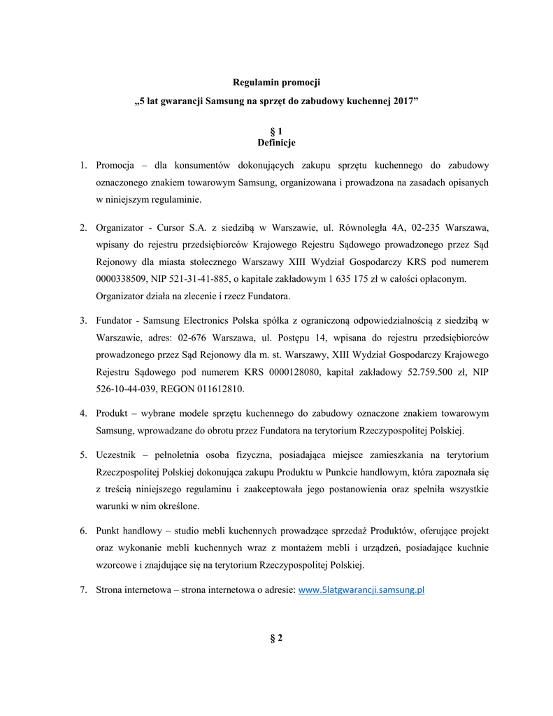 Regulamin promocji „5 lat gwarancji Samsung na sprzęt do zabudowy kuchennej 2017” §1 Definicje 1. Promocja – dla konsumentów dokonujących zakupu sprzętu kuchennego do zabudowy oznaczonego znakiem towarowym Samsung, organizowana i prowadzona na zasadach opisanych w niniejszym regulaminie. 2. Organizator - Cursor S.A. z siedzibą w Warszawie, ul. Równoległa 4A, 02-235 Warszawa, wpisany do rejestru przedsiębiorców Krajowego Rejestru Sądowego prowadzonego przez Sąd Rejonowy dla miasta stołecznego Warszawy XIII Wydział Gospodarczy KRS pod numerem 0000338509, NIP 521-31-41-885, o kapitale zakładowym 1 635 175 zł w całości opłaconym. Organizator działa na zlecenie i rzecz Fundatora. 3. Fundator - Samsung Electronics Polska spółka z ograniczoną odpowiedzialnością z siedzibą w Warszawie, adres: 02-676 Warszawa, ul. Postępu 14, wpisana do rejestru przedsiębiorców prowadzonego przez Sąd Rejonowy dla m. st. Warszawy, XIII Wydział Gospodarczy Krajowego Rejestru Sądowego pod numerem KRS 0000128080, kapitał zakładowy 52.759.500 zł, NIP 526-10-44-039, REGON 011612810. 4. Produkt – wybrane modele sprzętu kuchennego do zabudowy oznaczone znakiem towarowym Samsung, wprowadzane do obrotu przez Fundatora na terytorium Rzeczypospolitej Polskiej. 5. Uczestnik – pełnoletnia osoba fizyczna, posiadająca miejsce zamieszkania na terytorium Rzeczpospolitej Polskiej dokonująca zakupu Produktu w Punkcie handlowym, która zapoznała się z treścią niniejszego regulaminu i zaakceptowała jego postanowienia oraz spełniła wszystkie warunki w nim określone. 6. Punkt handlowy – studio mebli kuchennych prowadzące sprzedaż Produktów, oferujące projekt oraz wykonanie mebli kuchennych wraz z montażem mebli i urządzeń, posiadające kuchnie wzorcowe i znajdujące się na terytorium Rzeczypospolitej Polskiej. 7. Strona internetowa – strona internetowa o adresie: www.5latgwarancji.samsung.pl §2 Zasady Promocji 1. Niniejszy regulamin (dalej jako: „Regulamin Promocji”) określa: cel Promocji, warunki uczestnictwa w Promocji, czas trwania Promocji, sposób informowania o Promocji i jej warunkach, sposób składania skarg i wniosków związanych z Promocją. 2. Promocja prowadzona jest na terytorium Rzeczypospolitej Polskiej w okresie od dnia 01.02.2017 r., godz. 00:01 do dnia 30.06.2017 r., godz. 23:59:59 (termin zakupu Produktu w Promocji) decyduje data i godzina wysłania zamówienia na serwer. 3. W Promocji uwzględniane będą także zgłoszenia na produkty zakupione w okresie od 01.01.2017 do 31.01.2017. Zgłoszenia na produkty zakupione w tym terminie powinny być zarejestrowane w terminie maksymalnie do 28 lutego 2017r. 4. W Promocji nie mogą uczestniczyć osoby będące pracownikami Organizatora oraz Fundatora, a także członkowie rodzin tych pracowników. Za członków rodziny uznaje się małżonka, wstępnych, zstępnych, rodzeństwo oraz osoby pozostające w stosunku przysposobienia. 5. Promocja nie łączy się z innymi promocjami ogłaszanymi przez Organizatora i Fundatora. §3 Zasady uczestnictwa w Promocji 1. Każdy Uczestnik, który w okresie trwania Promocji dokona zakupu Produktu w Punkcie handlowym, a następnie zarejestruje zakup zgodnie z postanowieniami niniejszego Regulaminu, uzyska prawo do 5-letniej gwarancji na zakupiony Produkt. 2. Rejestracja zakupu Produktu powinna być dokonana w terminie 30 dni od daty zakupu Produktu widniejącej na paragonie lub fakturze dokumentującej zakup Produktu, nie później jednak jak do 30 lipca 2017r. 3. Szczegółowe zestawienie Produktów Samsung objętych Promocją, poprzez wskazanie ich modeli zawiera Załącznik nr 1 do niniejszego Regulaminu. 4. Celem uzyskania certyfikatu Uczestnik powinien: 1) dokonać zakupu Produktu w okresie trwania Promocji, 2) przesłać za pośrednictwem Strony internetowej, prawidłowo wypełniony formularz zgłoszenia wraz z dołączonym skanem dowodu zakupu dokumentującego nabycie Produktu w Punkcie handlowym. Dowód zakupu powinien zawierać pełną nazwę Produktu (numer modelu), pod rygorem nieważności zgłoszenia. Zgłoszenie z dowodem zakupu, który nie zawiera pełnej nazwy Produktu zostanie odrzucone, jeśli Uczestnik nie potwierdzi Organizatorowi właściwego numeru modelu. 5. Data i godzina zakupu Produktu, widniejąca na skanie dołączonego dowodu zakupu Produktu nie może być późniejsza niż data rejestracji formularza zgłoszeniowego za pośrednictwem Strony internetowej. 6. Zakres i warunki gwarancji potwierdzone zostaną przez Organizatora w formie certyfikatu gwarancji przesłanego Uczestnikowi za pośrednictwem poczty elektronicznej w postaci dokumentu .pdf na wskazany przez Uczestnika adres mailowy. Certyfikat gwarancji zostanie wysłany Uczestnikowi w terminie 30 dni od daty rejestracji. 7. Wartość świadczenia jest zwolniona z podatku dochodowego od osób fizycznych na podstawie art. 21 ust. 1 pkt 68a ustawy z dnia 26 lipca 1991 r. o podatku dochodowym od osób fizycznych (t.j. Dz. U. z 2010 r., Nr 51, poz. 307). 8. Organizator dokona weryfikacji zgłoszeń nadsyłanych przez Uczestników w ciągu 7 dni roboczych od daty wpłynięcia zgłoszenia na serwer obsługujący ruch zgłoszeń dokonywanych za pośrednictwem Strony internetowej. Organizatorowi przysługuje w szczególności prawo zażądania okazania oryginału dowodu nabycia dokumentującego zakup Produktu, jak również potwierdzania faktu zakupu w Punkcie handlowym m.in. w sytuacji gdy na załączonej kserokopii dowodu zakupu widnieje niepełny model Produktu. Organizatorowi przysługuje prawo zażądania okazania dodatkowych potwierdzeń (np. zdjęć) dla numeru seryjnego zakupionego urządzenia w przypadku gdy przedstawiony przez Uczestnika numer seryjny okaże się nieprawidłowy. 9. Organizator nie przewiduje możliwości zamiany certyfikatu w Promocji na ekwiwalent pieniężny lub na inne nagrody. §4 Obowiązywanie certyfikatów 1. Przedstawione warunki dla reklamacji na podsta