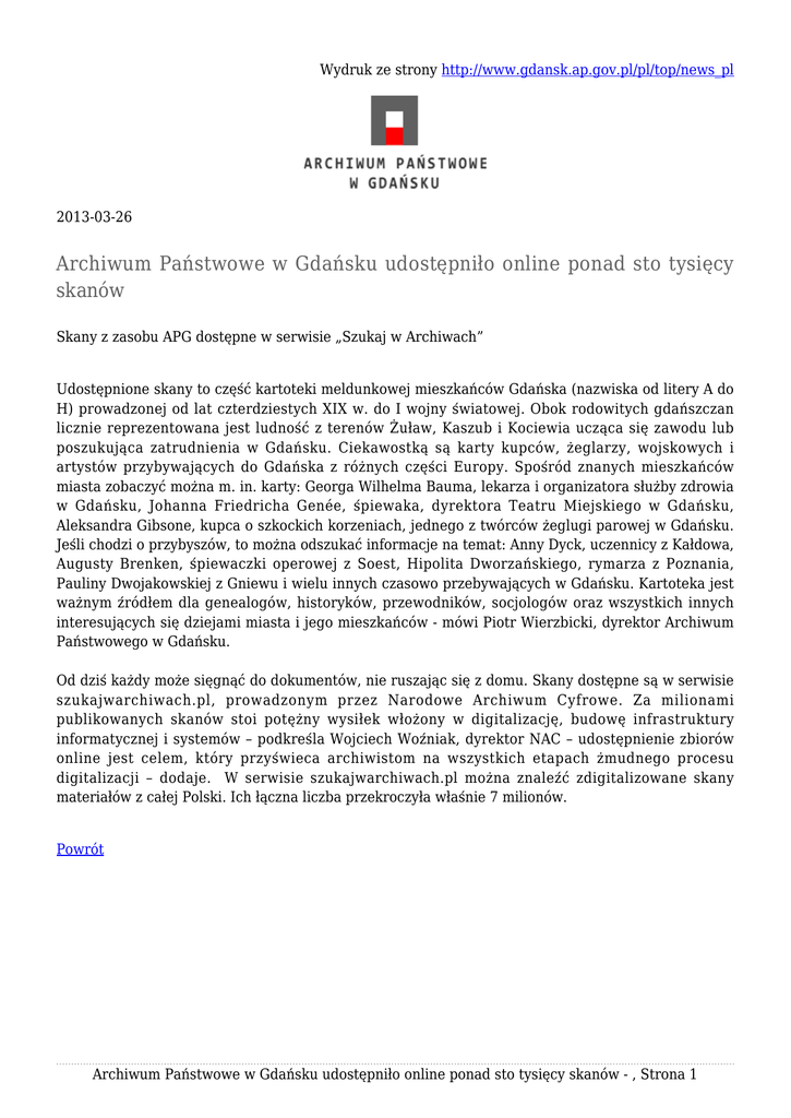 Wydruk ze strony http://www.gdansk.ap.gov.pl/pl/top/news_pl 2013-03-26 Archiwum Państwowe w Gdańsku udostępniło online ponad sto tysięcy skanów Skany z zasobu APG dostępne w serwisie „Szukaj w Archiwach” Udostępnione skany to część kartoteki meldunkowej mieszkańców Gdańska (nazwiska od litery A do H) prowadzonej od lat czterdziestych XIX w. do I wojny światowej. Obok rodowitych gdańszczan licznie reprezentowana jest ludność z terenów Żuław, Kaszub i Kociewia ucząca się zawodu lub poszukująca zatrudnienia w Gdańsku. Ciekawostką są karty kupców, żeglarzy, wojskowych i artystów przybywających do Gdańska z różnych części Europy. Spośród znanych mieszkańców miasta zobaczyć można m. in. karty: Georga Wilhelma Bauma, lekarza i organizatora służby zdrowia w Gdańsku, Johanna Friedricha Genée, śpiewaka, dyrektora Teatru Miejskiego w Gdańsku, Aleksandra Gibsone, kupca o szkockich korzeniach, jednego z twórców żeglugi parowej w Gdańsku. Jeśli chodzi o przybyszów, to można odszukać informacje na temat: Anny Dyck, uczennicy z Kałdowa, Augusty Brenken, śpiewaczki operowej z Soest, Hipolita Dworzańskiego, rymarza z Poznania, Pauliny Dwojakowskiej z Gniewu i wielu innych czasowo przebywających w Gdańsku. Kartoteka jest ważnym źródłem dla genealogów, historyków, przewodników, socjologów oraz wszystkich innych interesujących się dziejami miasta i jego mieszkańców - mówi Piotr Wierzbicki, dyrektor Archiwum Państwowego w Gdańsku. Od dziś każdy może sięgnąć do dokumentów, nie ruszając się z domu. Skany dostępne są w serwisie szukajwarchiwach.pl, prowadzonym przez Narodowe Archiwum Cyfrowe. Za milionami publikowanych skanów stoi potężny wysiłek włożony w digitalizację, budowę infrastruktury informatycznej i systemów – podkreśla Wojciech Woźniak, dyrektor NAC – udostępnienie zbiorów online jest celem, który przyświeca archiwistom na wszystkich etapach żmudnego procesu digitalizacji – dodaje. W serwisie szukajwarchiwach.pl można znaleźć zdigitalizowane skany materiałów z całej Polski. Ich łączna liczba przekroczyła właśnie 7 milionów. Powrót Archiwum Państwowe w Gdańsku udostępniło online ponad sto tysięcy skanów - , Strona 1