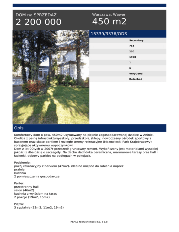 DOM na SPRZEDAŻ 2 200 000 Warszawa, Wawer 450 m2 15339/3376/ODS Secondary 754 250 1990 1 6 VeryGood Detached Opis Komfortowy dom o pow. 450m2 usytuowany na pięknie zagospodarowanej działce w Aninie. Okolica z pełną infrastrukturą-szkoły, przedszkola, sklepy, nowoczesny ośrodek sportowy z basenem oraz skate parkiem i rozległe tereny rekreacyjne (Mazowiecki Park Krajobrazowy) sprzyjające aktywnemu wypoczynkowi. Dom z lat 90tych w 2007r przeszedł gruntowny remont. Wykończony jest materiałami wysokiej jakości z dbałością o szczegóły. Na dachu dachówka ceramiczna, marmurowe tarasy oraz hall i łazienki, dębowy parkiet na podłogach w pokojach. Podziemie: pokój rekreacyjny z barkiem (47m2)- idealne miejsce do robienia imprez pralnia kuchnia 2 pomieszczenia gospodarcze Parter: przestronny hall salon (46m2) kuchnia z wyjściem na taras 2 pokoje (19m2, 15m2) Piętro: 3 sypialnie (22m2, 11m2, 19m2) REALS Nieruchomości Sp. z o.o. łazienka (11m2) z wyjściem na taras Poddasze: garderoba, łazienka, pokój (30m2) W podziemiu budynku znajduje się garaż na 2 samochody z podgrzewanym podjazdem, co z pewnością jest doskonałym rozwiązaniem w trakcie mrozów a przed budynkiem znajduje się parking na 5 samochodów. Polecam i zapraszam na prezentację. To doskonała propozycja dla ceniących komfort oraz miejsca pełne zieleni z doskonałą komunikacją do centrum miasta. Idealne również na siedzibę firmy. Centrala Kamilla Baranowska tel. 884 999 452 tel. 22 829 92 10 email: [email protected] REALS Nieruchomości Sp. z o.o. Powered by TCPDF (www.tcpdf.org)