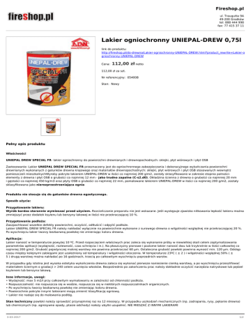 Fireshop.pl ul. Traugutta 9A 49-200 Grodków tel: 888 444 998 fax: 77 415 37 11 Lakier ogniochronny UNIEPAL-DREW 0,75l link do produktu: http://fireshop.pl/do-drewna/Lakier-ogniochronny-UNIEPAL-DREW.html?product_rewrite=Lakier-o gniochronny-UNIEPAL-DREW Cena: 112,00 zł netto 112,00 zł za szt. Nr referencyjny: 054008 Stan: Nowy Pełny opis produktu Właściwości UNIEPAL DREW SPECIAL FR- lakier ogniochronny do powierzchni drewnianych i drewnopochodnych: sklejki, płyt wiórowych i płyt OSB Zastosowanie: Lakier UNIEPAL DREW SPECIAL FR przeznaczony jest do ogniochronnego zabezpieczania i dekoracyjnego wykańczania powierzchni drewnianych wykonanych z gatunków drewna krajowego oraz materiałów drewnopochodnych: sklejki, płyt wiórowych i płyt OSB stosowanych wewnątrz pomieszczeń mieszkalnychWyroby pokryte lakierem UNIEPAL-DREW w ilości co najmniej 200 g/m2, zostały sklasyfikowane w zakresie stopnia palności: elementy z drewna i płyt OSB o grubości co najmniej 12 mm - jako trudno zapalne (C-s2.d0). Okładzina ścienna z drewna o grubości co najmniej 20 mm i gęstości co najmniej 450 kg/m3 oraz płyty OSB o grubości co najmniej 22 mm, pomalowane lakierem UNIEPAL-DREW w ilości co najmniej 200 g/m2, zostały sklasyfikowana jako nierozprzestrzeniająca ognia Produktu nie stosuje się do gatunków drewna egzotycznego. Sposób użycia: Przygotowanie lakieru: Wyrób bardzo starannie wymieszać przed użyciem. Rozcieńczanie preparatu nie jest wskazane. Jeśli występuje zjawisko nitkowania lepkość lakieru można zmniejszyć przez dodatek ksylenu lub benzyny lakowej w ilości nie przekraczającej 10 %. Przygotowanie podłoża: Zaszpachlować wszelkie defekty powierzchni, oczyścić, odtłuścić i odpylić podłoże. Lakier UNIEPAL DREW SPECIAL FR należy nakładać wyłącznie na powierzchnie wykonane z surowego drewna o wilgotności względnej nie przekraczającej 20 %. Po wyschnięciu lakier tworzy bezbarwną powłokę nie zmieniając koloru drewna. Aplikacja: Lakier nanosić w temperaturze powyżej 10 ºC. Przed rozpoczęciem właściwych prac zaleca się wykonanie próby w niewielkiej skali celem zoptymalizowania parametrów aplikacji (wydajność, rozlewność, czas schnięcia i in.). Na płaszczyzny pionowe i poziome lakier nanosić dwu lub trzykrotnie w ilości całkowitej co najmniej 200 g/m2. Grubość pojedynczej mokrej warstwy nie powinna przekraczać 60 μm. Ostateczna grubość powłoki powinna wynosić min. 120 μm. Odstęp czasu między kolejnymi zabiegami jest uzależniony od temperatury i wilgotności otoczenia. W temperaturze 23ºC ( ± 2 ) i wilgotności względnej 50% ( ± 5 ) drugą warstwę można nakładać po 16 godzinach, trzecią po całkowitym wyschnięciu poprzednich warstw. W przypadku gdy istotna jest wysoka estetyka wykończenia drewna zaleca się wykonać pierwsze naniesienie cienką warstwą, a po wyschnięciu przeszlifować materiałem ściernym o gradacji > 240 celem usunięcia włosków. Bezpośrednio po zakończeniu prac należy dokładnie oczyścić narzędzia natryskowe lub pędzel ksylenem lub benzyna lakową. Inne informacje, uwagi: • Wydajność: max 5 m2/l przy całkowitym wymalowaniu w zależności od chłonności podłoża. • Rozpuszczalność: nie rozpuszcza się w wodzie, rozpuszcza się w niektórych rozpuszczalnikach organicznych. • Po wyschnięciu tworzy bezbarwną powłokę nie zmieniając koloru drewna. • Powierzchnie pokryte innymi lakierami mogą zmienić klasyfikację ogniową. • Lakier nie nadaje się do malowania podłóg. Stan techniczny powłoki należy sprawdzić przynajmniej raz na 12 miesięcy. W przypadku uszkodzeń mechanicznych (np. zadrapania, rysy, pękanie drewna) lub chemicznych (np. agresywne opady, ptasie odchody) należy ubytki uzupełnić. NIE MIESZAĆ Z INNYMI LAKIERAMI 3-03-2017 1/2 Powiązane produkty Lakier ogniochron... 80,00 zł 3-03-2017 Lakier ogniochron... 145,00 zł 2/2