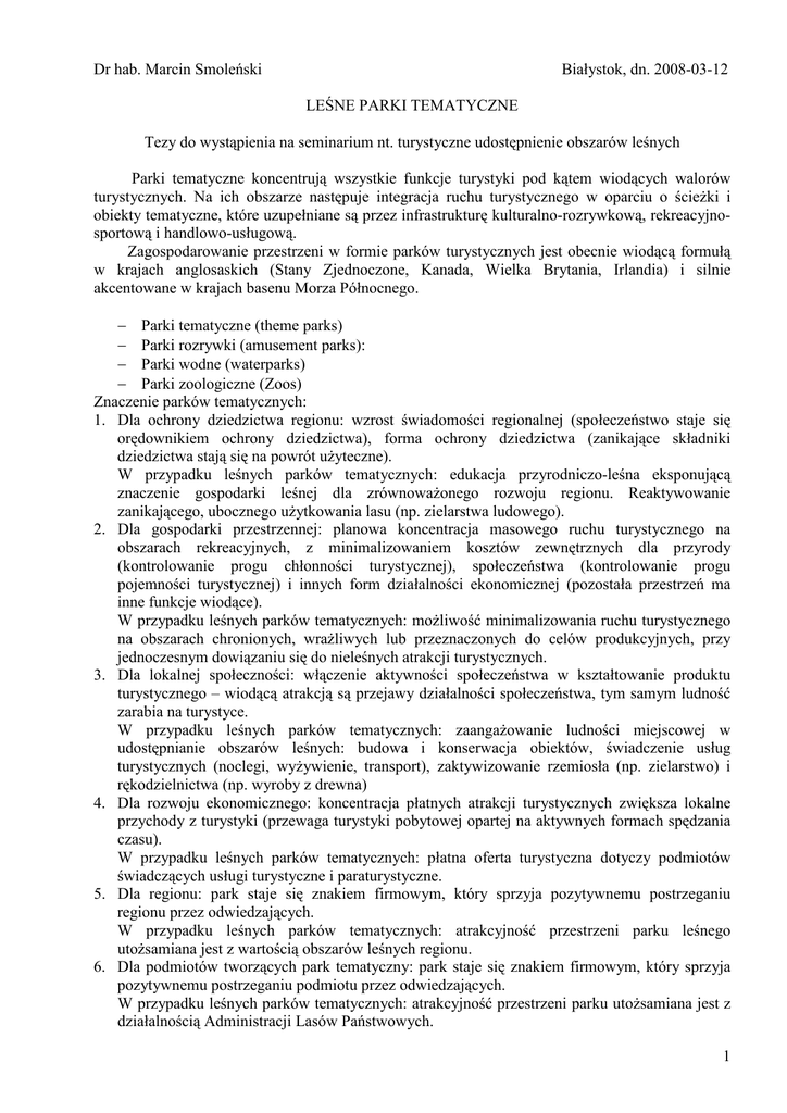 Dr hab. Marcin Smoleński Białystok, dn. 2008-03-12 LEŚNE PARKI TEMATYCZNE Tezy do wystąpienia na seminarium nt. turystyczne udostępnienie obszarów leśnych Parki tematyczne koncentrują wszystkie funkcje turystyki pod kątem wiodących walorów turystycznych. Na ich obszarze następuje integracja ruchu turystycznego w oparciu o ścieŜki i obiekty tematyczne, które uzupełniane są przez infrastrukturę kulturalno-rozrywkową, rekreacyjnosportową i handlowo-usługową. Zagospodarowanie przestrzeni w formie parków turystycznych jest obecnie wiodącą formułą w krajach anglosaskich (Stany Zjednoczone, Kanada, Wielka Brytania, Irlandia) i silnie akcentowane w krajach basenu Morza Północnego. − Parki tematyczne (theme parks) − Parki rozrywki (amusement parks): − Parki wodne (waterparks) − Parki zoologiczne (Zoos) Znaczenie parków tematycznych: 1. Dla ochrony dziedzictwa regionu: wzrost świadomości regionalnej (społeczeństwo staje się orędownikiem ochrony dziedzictwa), forma ochrony dziedzictwa (zanikające składniki dziedzictwa stają się na powrót uŜyteczne). W przypadku leśnych parków tematycznych: edukacja przyrodniczo-leśna eksponującą znaczenie gospodarki leśnej dla zrównowaŜonego rozwoju regionu. Reaktywowanie zanikającego, ubocznego uŜytkowania lasu (np. zielarstwa ludowego). 2. Dla gospodarki przestrzennej: planowa koncentracja masowego ruchu turystycznego na obszarach rekreacyjnych, z minimalizowaniem kosztów zewnętrznych dla przyrody (kontrolowanie progu chłonności turystycznej), społeczeństwa (kontrolowanie progu pojemności turystycznej) i innych form działalności ekonomicznej (pozostała przestrzeń ma inne funkcje wiodące). W przypadku leśnych parków tematycznych: moŜliwość minimalizowania ruchu turystycznego na obszarach chronionych, wraŜliwych lub przeznaczonych do celów produkcyjnych, przy jednoczesnym dowiązaniu się do nieleśnych atrakcji turystycznych. 3. Dla lokalnej społeczności: włączenie aktywności społeczeństwa w kształtowanie produktu turystycznego – wiodącą atrakcją są przejawy działalności społeczeństwa, tym samym ludność zarabia na turystyce. W przypadku leśnych parków tematycznych: zaangaŜowanie ludności miejscowej w udostępnianie obszarów leśnych: budowa i konserwacja obiektów, świadczenie usług turystycznych (noclegi, wyŜywienie, transport), zaktywizowanie rzemiosła (np. zielarstwo) i rękodzielnictwa (np. wyroby z drewna) 4. Dla rozwoju ekonomicznego: koncentracja płatnych atrakcji turystycznych zwiększa lokalne przychody z turystyki (przewaga turystyki pobytowej opartej na aktywnych formach spędzania czasu). W przypadku leśnych parków tematycznych: płatna oferta turystyczna dotyczy podmiotów świadczących usługi turystyczne i paraturystyczne. 5. Dla regionu: park staje się znakiem firmowym, który sprzyja pozytywnemu postrzeganiu regionu przez odwiedzających. W przypadku leśnych parków tematycznych: atrakcyjność przestrzeni parku leśnego utoŜsamiana jest z wartością obszarów leśnych regionu. 6. Dla podmiotów tworzących park tematyczny: park staje się znakiem firmowym, który sprzyja pozytywnemu postrzeganiu podmiotu przez odwiedzających. W przypadku leśnych parków tematycznych: atrakcyjność przestrzeni parku utoŜsamiana jest z działalnością Administracji Lasów Państwowych. 1 Cel podstawowy parków tematycznych: − wykorzystanie walorów krajoznawczych dla turystyki masowej: zastosowanie wszelkich dostępnych form interpretacji dla ułatwienia zwiedzającym docenienia atrakcji krajoznawczych. W przypadku leśnych parków tematycznych: ułatwienie mieszkańcom miast zrozumienia unikalności i uŜyteczności ekosystemów leśnych. Główny odbiorca parków tematycznych − rodzinne grupy turystów: atrakcje powinny być dostępne dla wszystkich grup wiekowych (inaczej czas wolny spędza 10-cio latek a inaczej 60-cio latek). W przypadku leśnych parków tematycznych: udostępnienie walorów leśnych w formie rekreacji rodzinnej z przystępnym zinterpretowaniem znaczenia ekosystemów leśnych i współczesnej gospodarki leśnej. Parki tematyczne słuŜą: − realizacji oczekiwań krajoznawczych, rekreacyjnych i rozrywkowych. Motywem wiodącym przyjazdu jest obcowanie z przejawami dziedzictwa regionu, niemniej obcowanie to opiera się na aktywnych formach spędzania czasu, które zawierają w sobie elementy rekreacji (regeneracja zdrowia fizycznego) i rozrywki (regeneracja zdrowia psychicznego). W przypadku leśnych parków tematycznych eksponowane jest dziedzictwo leśne: wpływ lasu na rozwój cywilizacyjny, kulturotwórcza rola lasu, znaczenie ochrony zasobów leśnych, historia uŜytkowania lasów. Parki tematyczne lokowane są przede wszystkim w sąsiedztwie aglomeracji miejskich – odbiorcą są grupy rodzinne z duŜych metropolii. Parki tematyczne regionów metropolitalnych nastawione są przede wszystkim na: − realizację oczekiwań rekreacyjnych i rozrywkowych z silnym zaakcentowaniem funkcji krajoznawczych. PrzewaŜą wycieczkowicze i turyści weekendowi, których oczekiwania dotyczą głównie regeneracji zdrowia po tygodniu intensywnej pracy. Natomiast funkcje krajoznawcze zazwyczaj sprowadzają się do wizualizacji harmonii krajobrazowej. Parki tematyczne regionów peryferyjnych nastawione są przede wszystkim na: − realizację oczekiwań krajoznawczych z silnym zaakcentowaniem funkcji rekreacyjnych i rozrywkowych. PrzewaŜają turyści z zewnątrz, nastawieni na poznanie odwiedzanego regionu. Oczekują pozytywnych przeŜyć związanych z obcowaniem z odrębną kulturą i przyrodą. Oczekują inspiracji. Równie waŜne jest regeneracja zdrowia, czyli moŜliwość korzystania z obszarów i obiektów rekreacyjno-rozrywkowych. Priorytetowym celem infrastruktury rekreacyjno-rozrywkowej w parkach tematycznych regionów peryferyjnych jest przygotowanie turysty do pozytywnego odbioru atrakcji krajoznawczych (przyrodniczych i k