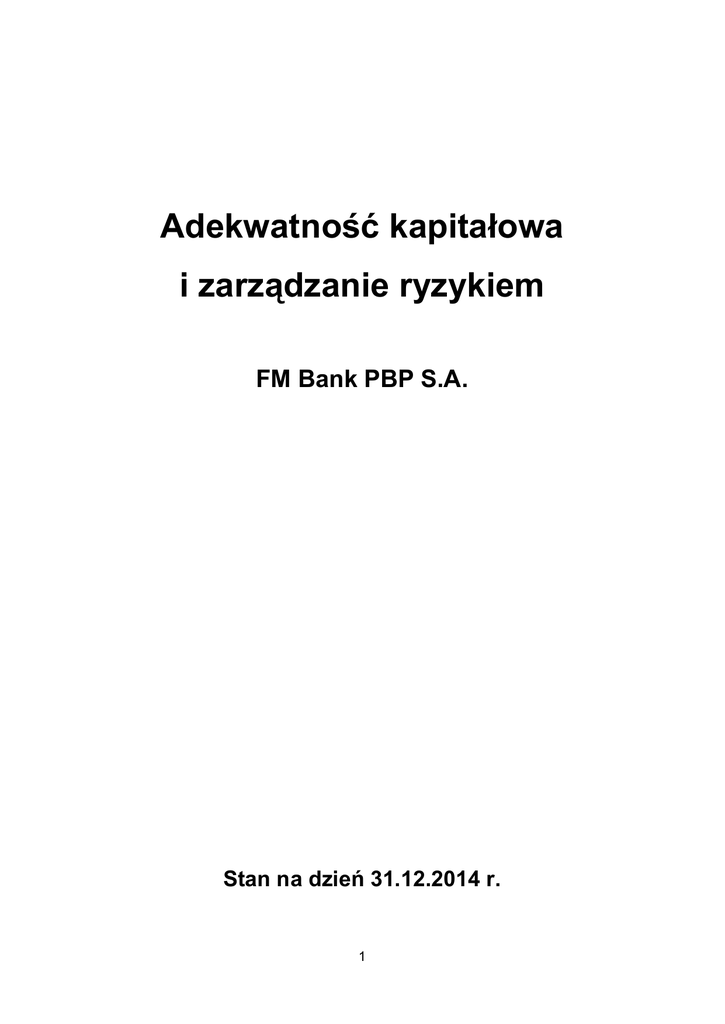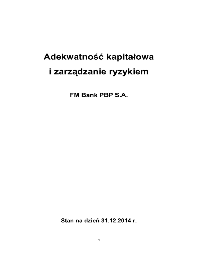 Adekwatność kapitałowa i zarządzanie ryzykiem FM Bank PBP S.A. Stan na dzień 31.12.2014 r. 1 SPIS TREŚCI I. INFORMACJE O BANKU ......................................................................................................................... 5 II. FUNDUSZE WŁASNE ................................................................................................................................ 5 III. ZARZĄDZANIE RYZYKIEM ................................................................................................................. 14 IV. REGULACYJNE WYMOGI KAPITAŁOWE ........................................................................................ 29 V. KAPITAŁ WEWNĘTRZNY ..................................................................................................................... 35 VI. INFORMACJE UZUPEŁNIAJĄCE ........................................................................................................ 37 VII. INFORMACJE DOTYCZĄCE POLITYKI ZMIENNYCH SKŁADNIKÓW WYNAGRODZEŃ OSÓB ZAJMUJĄCYCH STANOWISKA KIEROWNICZE ......................................................................... 48 2 Wstęp Raport „Adekwatność kapitałowa i zarządzanie ryzykiem – FM Bank PBP S.A.” (zwany dalej „Raportem”) został przygotowany zgodnie z wymogami Rozporządzenia CRR, Rekomendacji M Komisji Nadzoru Finansowego dotyczącej zarządzania ryzykiem operacyjnym w bankach, a także zasadami wyrażonymi w „Polityce Informacyjnej FM Bank PBP S.A.” Niniejszy Raport przedstawia informacje dotyczące strategii oraz procesów Banku odnośnie zarządzania ryzykiem, struktury kapitałów Banku oraz jego adekwatności kapitałowej. Informacje w raporcie przedstawione są w ujęciu jednostkowym, według stanu na dzień 31 grudnia 2014 r. Słownik: Ekspozycja kredytowa – suma wierzytelności pieniężnych i zobowiązań pozabilansowych Banku wynikająca z tytułu transakcji kredytowych; Kapitał ekonomiczny (EC) – oszacowana przez Bank kwota, niezbędna do pokrycia wszystkich zidentyfikowanych, istotnych rodzajów ryzyka występujących w działalności Banku oraz zmian otoczenia gospodarczego, uwzględniająca przewidywany poziom ryzyka zgodnie z procedurą wewnętrzną „Proces oceny adekwatności kapitału wewnętrznego (ICAAP)”; Kapitał regulacyjny (RC) – kwota całkowitego wymogu kapitałowego ustalona jako suma wymogów kapitałowych z tytułu poszczególnych rodzajów ryzyka oraz wymogów kapitałowych z tytułu przekroczenia limitów i naruszenia innych norm określonych w ustawie Prawo bankowe, obliczonych zgodnie z procedurą wewnętrzną „Zasady wyznaczania wymogów kapitałowych z tytułu poszczególnych rodzajów ryzyka”; Uchwała 76/2010 KNF z późn. zm. – Uchwała Nr 76/2010 Komisji Nadzoru Finansowego z dnia 10 marca 2010 r. w sprawie zakresu i szczegółowych zasad wyznaczania wymogów kapitałowych z tytułu poszczególnych rodzajów ryzyka oraz Uchwały: 369/2010 KNF z dnia 12 października 2010r., 206/2011 z dnia 22 sierpnia 2011r. i 324/2011 z dnia 20 grudnia 2011r.; Uchwała 325/2011 KNF – Uchwała Nr 325/2011 Komisji Nadzoru Finansowego z dnia 20 grudnia 2011r. w sprawie innych pomniejszeń funduszy podstawowych, ich wysokości, zakresu i warunków pomniejszania o nie funduszy podstawowych banku, innych pozycji bilansu banku zaliczanych do funduszy uzupełniających, ich wysokości, zakresu i warunków ich zaliczania do funduszy uzupełniających banku, pomniejszeń funduszy uzupełniających, ich wysokości, zakresu i warunków pomniejszania o nie funduszy uzupełniających banku oraz zakresu i sposobu uwzględniania działania banków w holdingach w obliczaniu funduszy własnych; 3 Uchwała 386/2008 KNF z późn. zm. – Uchwała Nr 386/2008 KNF z dnia 17 grudnia 2008r. w sprawie ustalenia wiążących banki norm płynności oraz Uchwała 324/2011 z dnia 20 grudnia 2011 r.; Uchwała 387/2008 - Uchwała Komisji Nadzoru Finansowego nr 387/2008 z dnia 17 grudnia 2008 r. w sprawie określenia ocen wiarygodności kredytowej nadawanych przez zewnętrzne instytucje oceny wiarygodności kredytowej, z których bank może korzystać w celu ustalenia wymogów kapitałowych i zakresu korzystania z tych ocen oraz ich powiązania ze stopniami jakości kredytowej. Rozporządzenie CRR – Rozporządzenie Parlamentu Europejskiego i Rady (UE) nr 575/2013 z dnia 26 czerwca 2013 r. w sprawie wymogów ostrożnościowych dla instytucji kredytowych i firm inwestycyjnych, zmieniające rozporządzenie (UE) nr 648/2012; Rekomendacja M – rekomendacja Komisji Nadzoru Finansowego dotycząca zarządzania ryzykiem operacyjnym, Jeśli nie zaznaczono inaczej, wszelkie dane prezentowane są wg stanu na 31 grudnia 2014 roku w tys. zł. Ewentualne różnice w sumach i udziałach wynikają z zaokrągleń kwot do pełnych tysięcy złotych oraz zaokrągleń udziałów procentowych do jednego miejsca dziesiętnego. 4 I. Informacje o Banku Nazwa Banku: FM Bank PBP S.A. (do dnia 1 lipca 2013 roku: Polski Bank Przedsiębiorczości Spółka Akcyjna) dalej „Bank” Siedziba: ul. Domaniewska 39A 02 – 672 Warszawa Bank jest wpisany do KRS prowadzonego przez Sąd Rejonowy dla m. st. Warszawy w Warszawie, XIII Wydział Gospodarczy Krajowego Rejestru Sądowego pod numerem 0000030330. W dniu 1 lipca 2013 roku nastąpiła rejestracja w rejestrze przedsiębiorców Krajowego Rejestru Sądowego połączenia Polskiego Banku Przedsiębiorczości S.A. (dalej „PBP”) z FM Bank S.A., w wyniku którego powstał FM Bank PBP S.A. Na dzień 31 grudnia 2014 roku jednostką dominującą wobec Banku jest spółka PL Holdings S.à.r.l. (99,59% akcji), która jest podmiotem zależnym od Abris-EMP Capital Partners Limited (dalej: „ABRIS”), przez co spółka ABRIS jest ostatecznym podmiotem dominującym wobec Banku. Zgodnie ze swoją strategią Bank nie prowadzi inwestycji kapitałowych i nie posiada udziałów w innych jednostkach, tym samym nie występują jednost