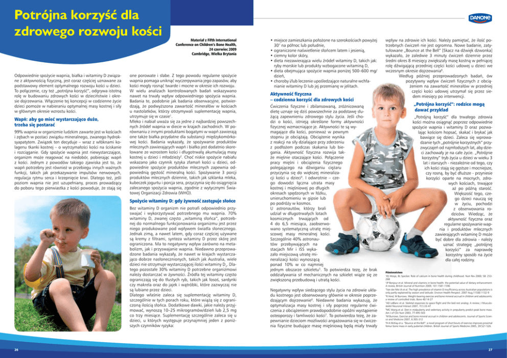 dla zdrowia Żywność Potrójna korzyść dla zdrowego rozwoju kości Odpowiednie spożycie wapnia, białka i witaminy D związane z aktywnością fizyczną, jest coraz częściej uznawane za podstawowy element optymalnego rozwoju kości u dzieci. To połączenie, czy też „potrójna korzyść”, odgrywa istotną rolę w budowaniu zdrowych kości w dzieciństwie i okresie dojrzewania. Włączenie tej koncepcji w codzienne życie dzieci pomoże w nabieraniu optymalnej masy kostnej i siły w głównym okresie wzrostu kości. Wapń: aby go mieć wystarczająco dużo, trzeba się postarać 99% wapnia w organizmie ludzkim zawarte jest w kościach i zębach w postaci związku mineralnego, zwanego hydroksyapatytem. Związek ten decyduje – wraz z włóknami kolagenu tkanki kostnej – o wytrzymałości kości na ściskanie i rozciąganie. Gdy spożycie wapnia jest niewystarczające, organizm może reagować na niedobór, pobierając wapń z kości. Jednym z powodów takiego zjawiska jest to, że wapń potrzebny jest również w przebiegu innych ważnych funkcji, takich jak przekazywanie impulsów nerwowych, regulacja rytmu serca i krzepnięcie krwi. Dlatego też, jeśli poziom wapnia nie jest uzupełniany, proces prowadzący do poboru tego pierwiastka z kości powoduje, że stają się Materiał z Fifth International Conference on Children’s Bone Health, 24 czerwiec 2009 Cambridge, Wielka Brytania one porowate i słabe. Z tego powodu regularne spożycie wapnia pomaga uniknąć wyczerpywania jego zapasów, aby kości mogły rosnąć twarde i mocne w okresie ich rozwoju. W wielu analizach kontrolowanych badań wskazywano nawet na trwały wpływ odpowiedniego spożycia wapnia. Badania te, podobnie jak badania obserwacyjne, potwierdzają, że podwyższona zawartość minerałów w kościach u nastolatków, którzy otrzymywali suplementację wapnia, utrzymuje się w czasie1. Mleko i nabiał uważa się za jedne z najbardziej powszechnych źródeł wapnia w diecie w krajach zachodnich. W porównaniu z innymi produktami bogatymi w wapń zawierają one także białka przydatne dla substancji międzykomórkowej kości. Badania wykazały, że spożywanie produktów mlecznych zawierających wapń i białko jest dodatnio skorelowane ze wzrostem kości i długotrwałą akumulacją masy kostnej u dzieci i młodzieży2. Choć niskie spożycie nabiału wskazano jako czynnik ryzyka złamań kości u dzieci, odpowiednie spożycie produktów mlecznych zapewnia odpowiednią gęstość mineralną kości. Spożywanie 3 porcji produktów mlecznych dziennie, takich jak szklanka mleka, kubeczek jogurtu i porcja sera, przyczynia się do osiągnięcia zalecanego spożycia wapnia, zgodnie z wytycznymi Światowej Organizacji Zdrowia (WHO). Spożycie witaminy D: gdy żywność zastępuje słońce Bez witaminy D organizm nie potrafi odpowiednio przyswajać i wykorzystywać potrzebnego mu wapnia. 70% witaminy D, zwanej często „witaminą słońca”, potrzebnej do normalnego funkcjonowania organizmu jest przez niego produkowane pod wpływem światła słonecznego. Jednak zimą, a nawet latem, gdy coraz częściej używane są kremy z filtrami, synteza witaminy D przez skórę jest ograniczona. Ma to negatywny wpływ zarówno na metabolizm, jak i przyswajanie wapnia. Niedawno przeprowadzone badania wykazały, że nawet w krajach wystarczająco dobrze nasłonecznionych, takich jak Australia, wiele dzieci nie otrzymuje wystarczającej ilości witaminy D3. Dlatego pozostałe 30% witaminy D potrzebne organizmowi należy dostarczać w żywności. Źródła tej witaminy często ograniczają się do tłustych ryb, takich jak łosoś, sardynki czy makrela oraz do jajek i wątróbki, które zazwyczaj nie są lubiane przez dzieci. Dlatego właśnie zaleca się suplementację witaminy D, szczególnie w tych porach roku, które wiążą się z ograniczoną ilością słońca. Dodatkowe dawki, jakie należy przyjmować, wynoszą 10–25 mikrogramów/dzień lub 2,5 mg co trzy miesiące. Suplementację szczególnie zaleca się u dzieci, u których występuje przynajmniej jeden z poniższych czynników ryzyka: 26 • miejsce zamieszkania położone na szerokościach powyżej 30° na północ lub południe, • ograniczone naświetlenie słońcem latem i jesienią, • ciemny kolor skóry, • dieta niezawierająca wielu źródeł witaminy D, takich jak: ryby morskie lub produkty wzbogacone witaminą D, • dieta obejmująca spożycie wapnia poniżej 500–600 mg/ dzień, • choroby i/lub leczenie upośledzające naturalne wchłanianie witaminy D lub jej przemianę w jelitach. Aktywność fizyczna – codzienna korzyść dla zdrowych kości Ćwiczenia fizyczne i zbilansowaną, zróżnicowaną dietę uznaje się dziś powszechnie za podstawę służącą zapewnieniu zdrowego stylu życia. Jeśli chodzi o kości, istnieją określone formy aktywności fizycznej wzmacniające je. Aktywności te są wymagające dla kości, ponieważ w pewnym stopniu je obciążają. Obciążenie wynika z reakcji na siły działające przy zderzeniu z podłożem podczas skakania lub biegania. Aktywność fizyczna rozwija także mięśnie otaczające kości. Połączenie pracy mięśni i obciążenia fizycznego polegającego na dźwiganiu ciężaru przyczynia się do większej mineralizacji kości u dzieci4. I odwrotnie – czego dowodzi łączna utrata masy kostnej i mięśniowej po długich okresach spędzonych w łóżku, unieruchomieniu w gipsie lub po podróży w kosmos. U astronautów, którzy brali udział w długotrwałych lotach kosmicznych trwających od 4 do 6,5 miesiąca, zaobserwowano systematyczną utratę miejscowej masy mineralnej kości. Szczególnie 40% astronautów przebywających na stacjach Mir i ISS wykazało miejscową utratę mineralizacji kości wynoszącą ponad 10% w co najmniej jednym obszarze szkieletu5. To potwierdza tezę, że brak oddziaływania sił mechanicznych na szkielet wiąże się ze zwiększoną przebudową i utrat