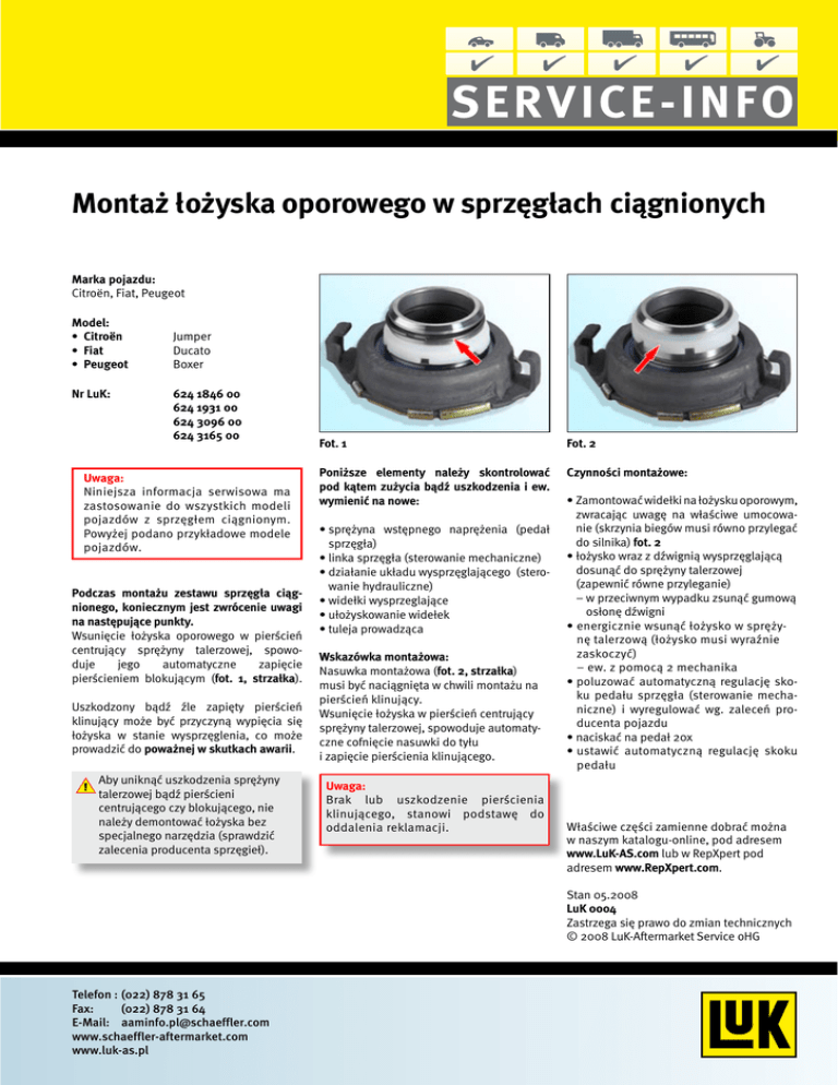Montaż łożyska oporowego w sprzęgłach ciągnionych Marka pojazdu: Citroën, Fiat, Peugeot Model: • Citroën • Fiat • Peugeot Jumper Ducato Boxer Nr LuK: 624 1846 00 624 1931 00 624 3096 00 624 3165 00 Uwaga: Niniejsza informacja serwisowa ma zastosowanie do wszystkich modeli pojazdów z sprzęgłem ciągnionym. Powyżej podano przykładowe modele pojazdów. Podczas montażu zestawu sprzęgła ciągnionego, koniecznym jest zwrócenie uwagi na następujące punkty. Wsunięcie łożyska oporowego w pierścień centrujący sprężyny talerzowej, spowoduje jego automatyczne zapięcie pierścieniem blokującym (fot. 1, strzałka). Uszkodzony bądź źle zapięty pierścień klinujący może być przyczyną wypięcia się łożyska w stanie wysprzęglenia, co może prowadzić do poważnej w skutkach awarii. by uniknąć uszkodzenia sprężyny A talerzowej bądź pierścieni centrującego czy blokującego, nie należy demontować łożyska bez specjalnego narzędzia (sprawdzić zalecenia producenta sprzęgieł). Fot. 1 Fot. 2 Poniższe elementy należy skontrolować pod kątem zużycia bądź uszkodzenia i ew. wymienić na nowe: Czynności montażowe: • sprężyna wstępnego naprężenia (pedał sprzęgła) • linka sprzęgła (sterowanie mechaniczne) • działanie układu wysprzęglającego (sterowanie hydrauliczne) • widełki wysprzeglające • ułożyskowanie widełek • tuleja prowadząca Wskazówka montażowa: Nasuwka montażowa (fot. 2, strzałka) musi być naciągnięta w chwili montażu na pierścień klinujący. Wsunięcie łożyska w pierścień centrujący sprężyny talerzowej, spowoduje automatyczne cofnięcie nasuwki do tyłu i zapięcie pierścienia klinującego. Uwaga: Brak lub uszkodzenie pierścienia klinującego, stanowi podstawę do oddalenia reklamacji. • Zamontować widełki na łożysku oporowym, zwracając uwagę na właściwe umocowanie (skrzynia biegów musi równo przylegać do silnika) fot. 2 • ł ożysko wraz z dźwignią wysprzęglającą dosunąć do sprężyny talerzowej (zapewnić równe przyleganie) – w przeciwnym wypadku zsunąć gumową osłonę dźwigni • energicznie wsunąć łożysko w sprężynę talerzową (łożysko musi wyraźnie zaskoczyć) – ew. z pomocą 2 mechanika • poluzować automatyczną regulację skoku pedału sprzęgła (sterowanie mechaniczne) i wyregulować wg. zaleceń producenta pojazdu •n aciskać na pedał 20x • ustawić automatyczną regulację skoku pedału Właściwe części zamienne dobrać można w naszym katalogu-online, pod adresem www.LuK-AS.com lub w RepXpert pod adresem www.RepXpert.com. Stan 05.2008 LuK 0004 Zastrzega się prawo do zmian technicznych © 2008 LuK-Aftermarket Service oHG Telefon :(022) 878 31 65 Fax: (022) 878 31 64 E-Mail: [email protected] www.schaeffler-aftermarket.com www.luk-as.pl
