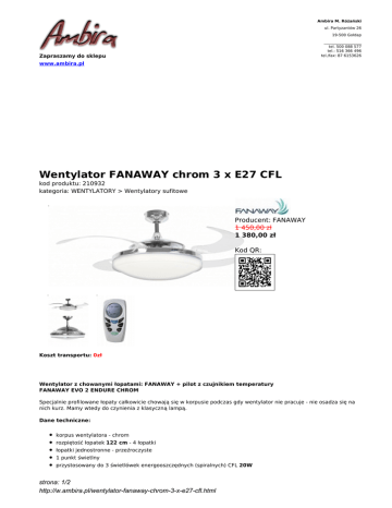 Ambira M. Różański ul. Partyzantów 26 19-500 Gołdap ___________________ tel. 500 088 577 tel.: 516 366 496 tel./fax: 87 6153626 Zapraszamy do sklepu www.ambira.pl Wentylator FANAWAY chrom 3 x E27 CFL kod produktu: 210932 kategoria: WENTYLATORY > Wentylatory sufitowe Producent: FANAWAY 1 450,00 zł 1 380,00 zł Kod QR: Koszt transportu: 0zł Wentylator z chowanymi łopatami: FANAWAY + pilot z czujnikiem temperatury FANAWAY EVO 2 ENDURE CHROM Specjalnie profilowane łopaty całkowicie chowają się w korpusie podczas gdy wentylator nie pracuje - nie osadza się na nich kurz. Mamy wtedy do czynienia z klasyczną lampą. Dane techniczne: korpus wentylatora - chrom rozpiętość łopatek 122 cm - 4 łopatki łopatki jednostronne - przeźroczyste 1 punkt świetlny przystosowany do 3 świetlówek energooszczędnych (spiralnych) CFL 20W strona: 1/2 http://w.ambira.pl/wentylator-fanaway-chrom-3-x-e27-cfl.html brak świetlówek w komplecie średnica lampy (przy złożonych łopatach) - 47,5 cm moc silnika - 55W dwa kierunki obrotów ilość mieszanego powietrza - 138,6 m3/min regulacja: pilot w komplecie wysokość wentylatora 38,5 cm waga wentylatora 10,8 kg nr katalogowy 210932 znak CE, TUV, GS gwarancja 2 lata Funkcje pilota: Możliwość ustawienia trybu pracy wentylatora: ręczny / automatyczny Pomiar temperatury w pomieszczeniu Włączenie wentylatora przy ustawionej temperaturze Ustawienie odpowiedniej prędkości w zależności od temperatury Możliwość ustawienia czasu do automatycznego wyłączenia wentylatora Możliwość ustawienia czasu do automatycznego wyłączenia oświetlenia Funkcja SLEEP – oświetlenie zgaśnie po 3 minutach Wyświetlacz: wskaźnik prędkości obrotów, wskaźnik lampy, wskaźnik wyczerpania baterii, wskaźnik trybu pracy urządzenia, wskaźnik temperatury UWAGA! Brak możliwość zastosowania przedłużki - obniżenia wentylatora względem punktu mocowania. strona: 2/2 http://w.ambira.pl/wentylator-fanaway-chrom-3-x-e27-cfl.html