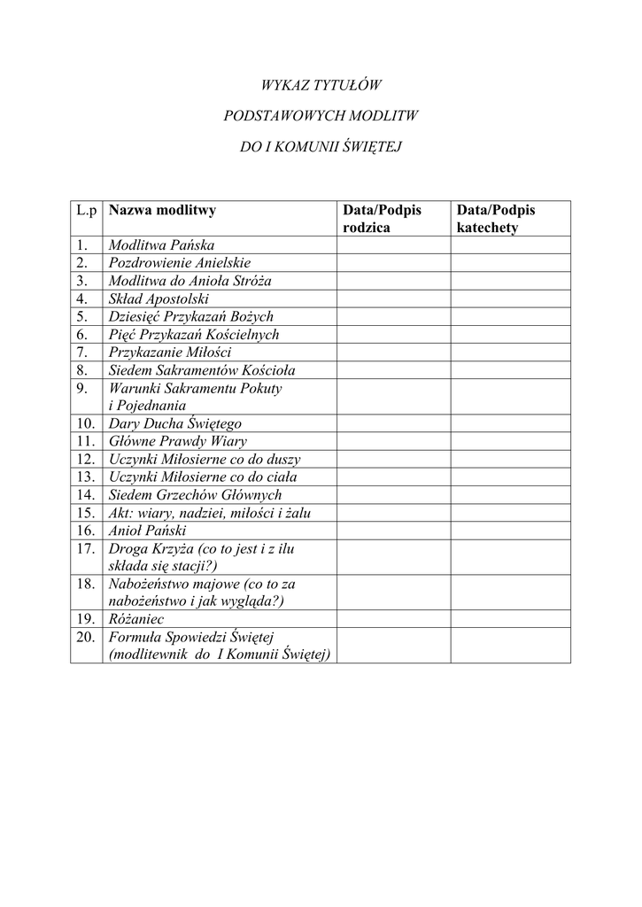 WYKAZ TYTUŁÓW PODSTAWOWYCH MODLITW DO I KOMUNII ŚWIĘTEJ L.p Nazwa modlitwy 1. 2. 3. 4. 5. 6. 7. 8. 9. 10. 11. 12. 13. 14. 15. 16. 17. 18. 19. 20. Modlitwa Pańska Pozdrowienie Anielskie Modlitwa do Anioła Stróża Skład Apostolski Dziesięć Przykazań Bożych Pięć Przykazań Kościelnych Przykazanie Miłości Siedem Sakramentów Kościoła Warunki Sakramentu Pokuty i Pojednania Dary Ducha Świętego Główne Prawdy Wiary Uczynki Miłosierne co do duszy Uczynki Miłosierne co do ciała Siedem Grzechów Głównych Akt: wiary, nadziei, miłości i żalu Anioł Pański Droga Krzyża (co to jest i z ilu składa się stacji?) Nabożeństwo majowe (co to za nabożeństwo i jak wygląda?) Różaniec Formuła Spowiedzi Świętej (modlitewnik do I Komunii Świętej) Data/Podpis rodzica Data/Podpis katechety