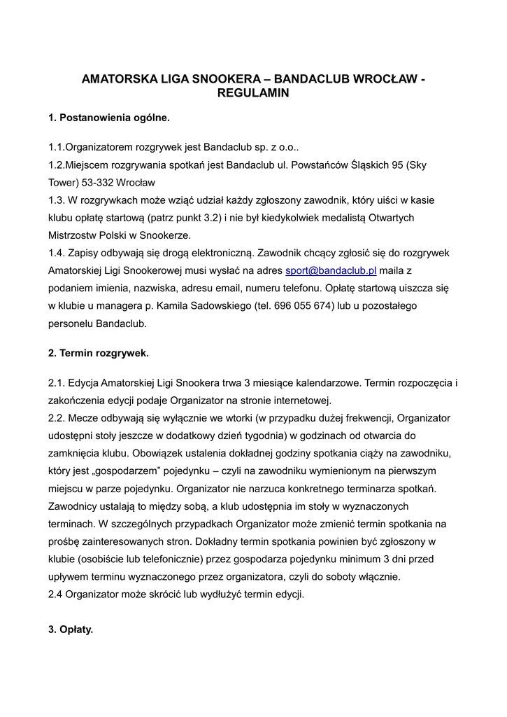 AMATORSKA LIGA SNOOKERA – BANDACLUB WROCŁAW REGULAMIN 1. Postanowienia ogólne. 1.1.Organizatorem rozgrywek jest Bandaclub sp. z o.o.. 1.2.Miejscem rozgrywania spotkań jest Bandaclub ul. Powstańców Śląskich 95 (Sky Tower) 53-332 Wrocław 1.3. W rozgrywkach może wziąć udział każdy zgłoszony zawodnik, który uiści w kasie klubu opłatę startową (patrz punkt 3.2) i nie był kiedykolwiek medalistą Otwartych Mistrzostw Polski w Snookerze. 1.4. Zapisy odbywają się drogą elektroniczną. Zawodnik chcący zgłosić się do rozgrywek Amatorskiej Ligi Snookerowej musi wysłać na adres [email protected] maila z podaniem imienia, nazwiska, adresu email, numeru telefonu. Opłatę startową uiszcza się w klubie u managera p. Kamila Sadowskiego (tel. 696 055 674) lub u pozostałego personelu Bandaclub. 2. Termin rozgrywek. 2.1. Edycja Amatorskiej Ligi Snookera trwa 3 miesiące kalendarzowe. Termin rozpoczęcia i zakończenia edycji podaje Organizator na stronie internetowej. 2.2. Mecze odbywają się wyłącznie we wtorki (w przypadku dużej frekwencji, Organizator udostępni stoły jeszcze w dodatkowy dzień tygodnia) w godzinach od otwarcia do zamknięcia klubu. Obowiązek ustalenia dokładnej godziny spotkania ciąży na zawodniku, który jest „gospodarzem” pojedynku – czyli na zawodniku wymienionym na pierwszym miejscu w parze pojedynku. Organizator nie narzuca konkretnego terminarza spotkań. Zawodnicy ustalają to między sobą, a klub udostępnia im stoły w wyznaczonych terminach. W szczególnych przypadkach Organizator może zmienić termin spotkania na prośbę zainteresowanych stron. Dokładny termin spotkania powinien być zgłoszony w klubie (osobiście lub telefonicznie) przez gospodarza pojedynku minimum 3 dni przed upływem terminu wyznaczonego przez organizatora, czyli do soboty włącznie. 2.4 Organizator może skrócić lub wydłużyć termin edycji. 3. Opłaty. 3.1. Amatorska Liga Snookera jest płatna. 3.2. Jednorazowa opłata startowa za całą edycję ligi (3 miesiące) wynosi 100 zł. 3.3. Opłata za wynajem stołów na czas rozgrywania pojedynków naliczana będzie opłata według cennika klubowego. Kwota ta rozdzielona jest na dwóch zawodników. Nie ma możliwości rozliczania stołów za pomocą karnetów. 3.4. Mecze rozgrywane w wyniku przeniesienia ich na inny termin w czasie niemieszczącym się w wytycznych Organizatora wymagają opłaty dodatkowej za stół według cennika obowiązującego w klubie. 3.5 W przypadku gdy zawodnik w lidze przegra dwa mecze lub więcej przez walk-over, nie będzie brał udziału w podziale nagród 4. Konstrukcja Ligi, punktacja, i kryteria klasyfikacji końcowej 4.1. Mecze rozgrywane są systemem BEST OF 3 oraz systemem każdy z każdym, bez rundy rewanżowej. 4.2. Punktacja: Punktacja wyglądać będzie następująco: zwycięstwo 2 pkt, przegrana 0 pkt, Po upływie 15 minut od umówionej godziny spotkania w sytuacji, gdy jedna ze stron się nie stawi na meczu przyznawana jest kara frejma dla zawodnika spóźniającego się. Po upływie 30 minut od umówionej godziny spotkania zawodnik nieobecny przegrywa spotkanie walkowerem. W przypadku, gdy nie pojawi się żadna ze stron walkower jest przyznawany dla osoby zajmującej wyższą pozycje w tabeli. W tabeli wyników walk-over będzie wpisywany wynikiem 2-0 na korzyść obecnego. 4.3. O kolejności w tabeli decyduje: · Liczba punktów · Bezpośredni pojedynek · Bilans frejmów w bezpośrednich pojedynkach · Bilans frejmów we wszystkich pojedynkach ligi · Liczba oddanych walkowerów · Najwyższe brejki uzyskane w tej edycji Ligi · Dogrywka – dodatkowy mecz 4.4. Zwycięzcą Ligi zostaje osoba zajmująca pierwsze miejsce w tabeli 5. Organizacja zawodów 5.1. Organizator przygotowuje stół i sprzęt do gry dla zawodników na godzinę określoną w terminarzu rozgrywek, ustaloną pomiędzy zawodnikami i zgłoszoną do organizatora. 5.2. Mecze rozgrywane są bilami turniejowymi firmy Aramith. 5.3. Każdy z zawodników dysponuje 5 minutami czasu bezpośrednio przed spotkaniem, w czasie których może przeprowadzić rozgrzewkę. 5.4. Baza kontaktowa zawodników znajduje się w klubie oraz jest wysyłana na adres email podany przy zgłoszeniu przez zawodnika. 5.5. Przełożenie spotkania zostaje ustalone przez zawodników i powinno być zgłoszone do organizatora minimum 3 dni przed upływem pierwotnego terminu wyznaczonego przez organizatora, czyli do soboty włącznie. 6. Obowiązki organizatora i zawodników 6.1. Organizator zobowiązuje się: · przygotować sprzęt do gry na określony termin · informować o jakichkolwiek zmianach w terminach i godzinach rozgrywania ligi 6.2. Zawodnik zobowiązuje się: · przestrzegać Regulaminu Ligi · jeżeli występuje w roli gospodarza (patrz punkt 2.2) umówienia dokładnego terminu pojedynku z przeciwnikiem lub zgłoszenie do organizatora ewentualnych problemów minimum 3 dni przed terminem rozegrania meczu, tj. do soboty włącznie (w przypadku rozgrywania meczu w wyznaczonym przez organizatora terminie) · dbać o powierzony sprzęt · zgłaszać zmianę terminu gry co najmniej 3 dni przed terminem rozegrania meczu, tj. do soboty włącznie (w przypadku rozgrywania meczu w wyznaczonym przez organizatora terminie) · zachowywać się przy stole zgodnie z tradycjami gry w snookera 6.3. Zawodnik, który z przyczyn obiektywnych nie może rozgrywać swoich spotkań zgodnie z terminarzem, zobowiązany jest do podania Organizatorowi planowanego terminu nieobecności i planu rozegrania spotkań zaległych. 6.4. Możliwe jest rozgrywanie spotkań awansem w przypadku planowanej nieobecności. 6.5. Mecz nie rozegrany w terminie wyznaczonym przez organizatora i przełożony na prośbę zawodnika, musi być rozegrany najpóźniej w ciągu następnych 7 dni lub awansem w ciągu 7 dni poprzedzających początkowy termin. W przypadku przeniesienia terminu spotkania odpowiedzialność za umówienie i rozegranie meczu przechodzi n
