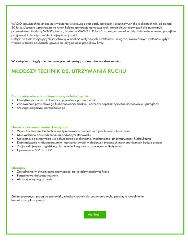 WAGO, powszechnie znane ze stworzenia światowego standardu połączeń sprężynowych dla elektrotechniki, od ponad 20 lat z sukcesem wprowadza na rynek kolejne generacje nowoczesnych, oryginalnych rozwiązań dla automatyki przemysłowej. Produkty WAGO, także „Made by WAGO in Poland” są rozpoznawalne dzięki nieszablonowemu podejściu, przyjazności dla użytkownika i najwyższej jakości. Dołącz do ludzi znajdujących satysfakcję w analizie nietypowych problemów i integracji różnorodnych systemów, gdyż właśnie w takich obszarach ujawnia się oryginalność produktów firmy. W związku z ciągłym rozwojem poszukujemy pracownika na stanowisko: MŁODSZY TECHNIK DS. UTRZYMANIA RUCHU Do obowiązków zatrudnionej osoby należeć będzie: • Identyfikacja, analiza i likwidacja pojawiających się awarii • Zapewnienie prawidłowego funkcjonowania maszyn i narzędzi poprzez cykliczne konserwacje i przeglądy • Obsługa magazynu narzędziowego Nasze oczekiwania wobec kandydata: • Wykształcenie średnie techniczne (preferowane: technikum o profilu mechatronicznym) • Mile widziane doświadczenie na podobnym stanowisku • Umiejętność posługiwania się dokumentacją elektryczną, mechaniczną, pneumatyczną i hydrauliczną • Doświadczenie w diagnozowaniu i usuwaniu awarii w złożonych systemach mechatronicznych będzie atutem • Znajomość języka angielskiego lub niemieckiego na poziomie komunikatywnym • Uprawnienia SEP do 1 KV Oferujmy: • Zatrudnienie w dynamicznie rozwijającej się, międzynarodowej firmie • Perspektywę dalszego rozwoju • Atrakcyjne wynagrodzenie Zainteresowanych pracą na stanowisku młodszy technik ds. utrzymania ruchu prosimy o wypełnienie formularza aplikacyjnego.