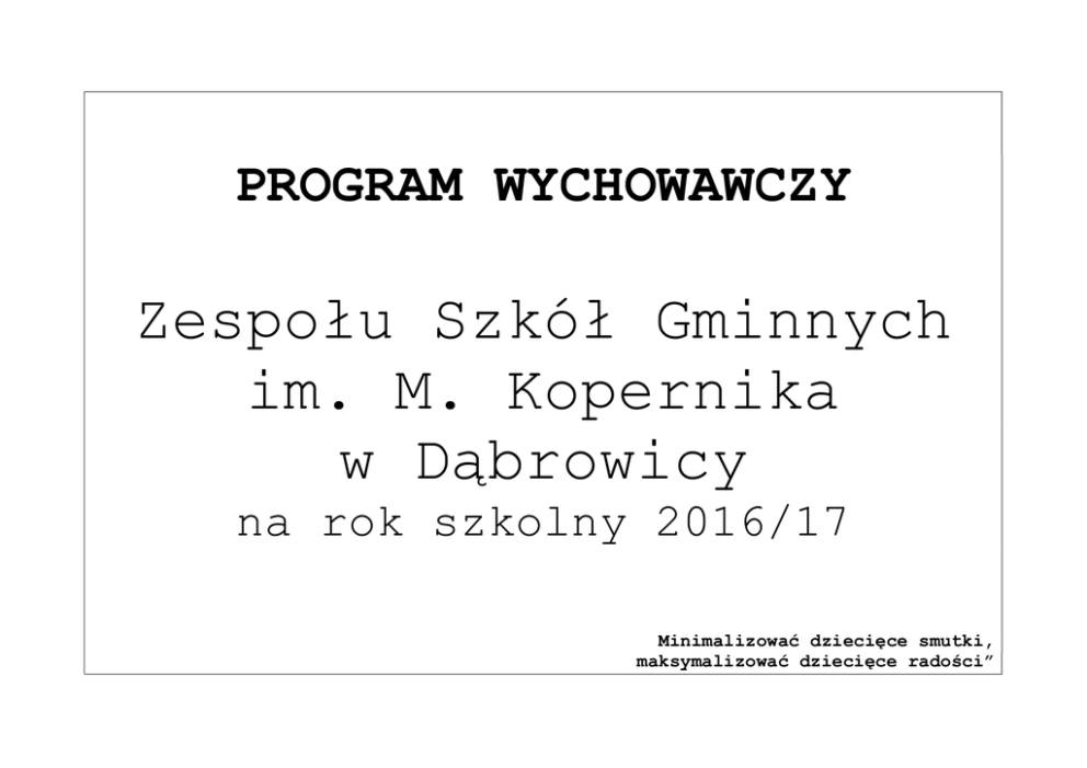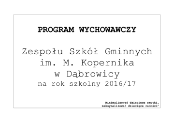 PROGRAM WYCHOWAWCZY Zespołu Szkół Gminnych im. M. Kopernika w Dąbrowicy na rok szkolny 2016/17 Minimalizować dziecięce smutki, maksymalizować dziecięce radości” 1. PODSTAWOWE AKTY PRAWNE: – Powszechna Deklaracja Praw Człowieka z 10 grudnia 1948 r. – Europejska Konwencja o Ochronie Praw Człowieka i Podstawowych Wolności z 4 listopada 1950 r. – Deklaracja Praw Dziecka z 1959 r. – Konwencja o Prawach Dziecka Narodów Zjednoczonych z 20 listopada 1989 r. – Konstytucja Rzeczypospolitej Polskiej z 1997 r. (art. 48, 53, 70) – Ustawa o systemie oświaty z 7.09.1991 r. (art. 1, 5, 33, 34a, 40) – Ustawa z 26.01.1982 r. Karta Nauczyciela (art. 6) – Program Polityki Prorodzinnej Państwa z 17.11.1998 r. – Rozporządzenie Ministra Edukacji Narodowej z dnia 21 maja 2001 r. w sprawie ramowych statutów publicznego przedszkola oraz publicznych szkół. – Rozporządzenie Ministra Edukacji Narodowej z dnia 27 sierpnia 2012 r. w sprawie podstawy programowej wychowania przedszkolnego oraz kształcenia ogólnego w poszczególnych typach szkół – Statut szkoły – Podstawa Programowa kształcenia ogólnego. 2.WARTOŚCI WYCHOWAWCZE : - poszanowanie wartości i godności ludzkiej - aktywne działania na rzecz klasy, szkoły - uczciwość, szczerość - prawdomówność - sprawiedliwość - szacunek do języka, kultury historii i tradycji narodowej - wrażliwość na piękno przyrody ojczystej - ogólnoludzkie normy i wartości religijne - doskonalenie własnej osoby - kierowanie się własnym sumieniem - pomoc potrzebującym - umiejętność współżycia w rodzinie i społeczności - rzetelność i odpowiedzialność - zdrowy styl życia - wykształcenie i nauka - inicjatywa własna. MODEL ABSOLWENTA, uczeń będzie: sprawnie posługiwał się językiem polskim, umiał korzystać z różnych źródeł informacji, umiał zdobywać, przetwarzać i wykorzystywać wiedzę, umiał korzystać z nowoczesnych technologii komunikacyjnych; przygotowany do dalszej nauki, rozwijał swoje talenty, myślał samodzielnie, twórczo i krytycznie, umiał realizować własne plany i marzenia; miał świadomość potrzeby nieustannego rozwoju i kształcenia, był świadomy, że każdemu kreatywnemu działaniu powinien towarzyszyć wysiłek i był gotów go podejmować. dobrze funkcjonował w swoim otoczeniu, czuł się członkiem społeczności lokalnej, obywatelem Polski i Europy, był ciekawy świata; znał i szanował tradycje rodziny, szkoły i narodu, wykazywał chęć poznania ojczystego kraju i jego zwyczajów; odpowiedzialny, prawy i uczciwy, wyrażał siebie w sposób akceptowany społecznie, wywiązywał się z powierzonych zadań w sposób zadowalający siebie i innych, starał się przewidzieć skutki swoich działań i gotów był ponieść konsekwencje swoich czynów, umiał rozróżniać dobre i złe zachowanie; umiał współpracować w grupie, działał zgodnie z obowiązującymi w niej zasadami, miał poczucie współodpowiedzialności; tolerancyjny wobec odrębności innych, w tym wobec cudzoziemców, osób starszych czy niepełnosprawnych; umiał zachować się kulturalnie, znał zasady dobrego wychowania, używał form grzecznościowych; potrafił budować przyjazne relacje z rówieśnikami, umiał nazywać swoje emocje, umiał nad nimi panować, pokojowo rozwiązywał konflikty, umiał dyskutować, był wrażliwy na potrzeby innych; dbał o zdrowie własne i innych, kształtował właściwe nawyki żywieniowe i higieny, znał zagrożenia wypływające z zażywania alkoholu, nikotyny i innych używek; stosował się do zasad ekologii, segregował odpady, dbał o czystość otoczenia; dbał o swój wygląd, ubierał się schludnie i odpowiednio do czasu i miejsca; bezpiecznie poruszał się po drogach, posiadał Kartę Rowerową. uczestniczył w rożnych formach kultury, był przygotowany do odbioru mass mediów; umiał analizować docierające do niego informacje, był krytyczny wobec programów telewizyjnych, filmów, czasopism, książek, znał mechanizmy działania reklamy; aktywny fizycznie i artystycznie, uprawiał sport, w miarę swoich możliwości śpiewał, grał na instrumencie, rysował. PRIORYTETY SZKOŁY - wzmacnianie bezpieczeństwa dzieci i młodzieży, - rozwijanie kompetencji , -edukacja matematyczna i przyrodnicza. 5 .ZAŁOŻENIA PROGRAMU Szkolny Program Wychowawczy Szkoły Podstawowej Dąbrowicy jest dokumentem pozwalającym scalać oddziaływania wychowawcze szkoły i środowiska uczniów. Stanowi wytyczne do pracy wychowawczej skierowane do dyrekcji szkoły, pedagoga szkolnego, wychowawców klas, nauczycieli przedmiotów, Samorządu Uczniowskiego, pracowników administracyjnych szkoły, oraz organizacji i instytucji wspomagających pracę szkoły, przy współudziale rodziców i z uwzględnieniem ich oczekiwań dydaktyczno –wychowawczych. Realizacja założeń programowych wpłynie na spójność i wielokierunkowość oddziaływań wychowawczych skierowanych do uczniów szkoły. 6.CEL GŁÓWNY; Wzmacnianie poczucia bezpieczeństwa uczniów, kształtowanie przyjaznej postawy wobec szkoły.Upowszechnianie czytelnictwa, rozwijanie kompetencji czytelniczych wśród dzieci i młodzieży.Rozwijanie kompetencji informatycznych dzieci i młodzieży w szkołach i placówkach.Kształtowanie postaw. Wychowanie do wartości 7. Cele szczegółowe: 1. Kształtowanie wszechstronnego rozwoju osobowego (w wymiarze intelektualnym, psychicznym, społecznym, zdrowotnym, estetycznym, moralnym, duchowym). 2. Rozwijanie w sobie dociekliwości poznawczej, ukierunkowanej na poszukiwanie prawdy, dobra i piękna w świecie. 3. Budzenie świadomości, życiowej użyteczności zarówno poszczególnych przedmiotów szkolnych, jak i całej edukacji na danym etapie. 4. Rozwijanie samodzielności w dążeniu do dobra w jego wymiarze indywidualnym i społecznym, godząc umiejętnie dążenie do dobra własnego z dobrem innych, odpowiedzialności za siebie i odpowiedzialności za inn