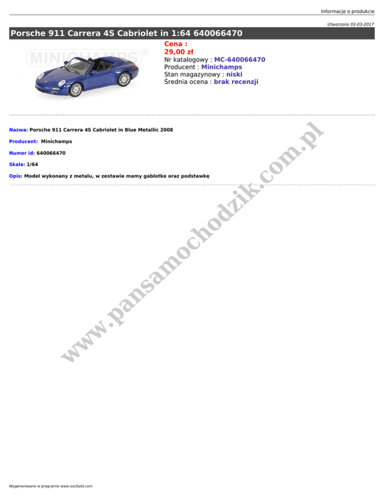 Informacje o produkcie Utworzono 03-03-2017 Porsche 911 Carrera 4S Cabriolet in 1:64 640066470 Cena : 29,00 zł Nr katalogowy : MC-640066470 Producent : Minichamps Stan magazynowy : niski Średnia ocena : brak recenzji .p l Nazwa: Porsche 911 Carrera 4S Cabriolet in Blue Metallic 2008 Skala: 1/64 w w w .p an sa m oc ho dz ik Opis: Model wykonany z metalu, w zestawie mamy gablotke oraz podstawkę .c Numer id: 640066470 om Producent: Minichamps Wygenerowano w programie www.oscGold.com