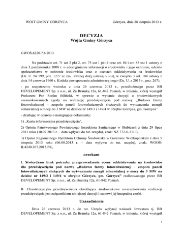 WÓJT GMINY GÓRZYCA Górzyca, dnia 28 sierpnia 2013 r. DECYZJA Wójta Gminy Górzyca GWOŚ.6220.7.6.2013 Na podstawie art. 71 ust 2 pkt 2, art. 75 ust 1 pkt 4 oraz art. 84 i art. 85 ust 1 ustawy z dnia 3 października 2008 r. o udostępnianiu informacji o środowisku i jego ochronie, udziale społeczeństwa w ochronie środowiska oraz o ocenach oddziaływania na środowisko (Dz. U. Nr 199, poz. 1227 ze zm., zwanej dalej ustawą o ooś), w związku z art. 104 ustawy z dnia 14 czerwca 1960 r. Kodeks postępowania administracyjnego (Dz. U. z 2013 r., poz. 267), - po rozpatrzeniu wniosku z dnia 26 czerwca 2013 r., przedłożonego przez BB DEVELOPEMENT Sp. z o.o., ul. Za Bramką 12a, 61-842 Poznań, w imieniu, której wystąpił Prokurent Pan Stefan Biliński, w sprawie o wydanie decyzji o środowiskowych uwarunkowaniach zgody na realizację przedsięwzięcia pod nazwą: „Budowa farmy fotowoltaicznej – zespołu paneli fotowoltaicznych służących do wytwarzania energii odnawialnej o mocy do 3 MW na działce nr 149/3 i 149/4 w obrębie Górzyca, gm. Górzyca” - działając w oparciu o następujące dokumenty: 1) „Karta informacyjna przedsięwzięcia", 2) Opinia Państwowego Powiatowego Inspektora Sanitarnego w Słubicach z dnia 29 lipca 2013 roku (30.07.2013 r. – data wpływu do tut. urzędu), znak: NZ 772-6-21/13, 3) Opinia Regionalnego Dyrektora Ochrony Środowiska w Gorzowie Wielkopolskim z dnia 5 sierpnia 2013 roku (06.08.2013 r. – data wpływu do tut. urzędu), znak: WOOŚII.4240.307.2013.PK, orzekam I. Stwierdzam brak potrzeby przeprowadzenia oceny oddziaływania na środowisko dla przedsięwzięcia pod nazwą „Budowa farmy fotowoltaicznej – zespołu paneli fotowoltaicznych służących do wytwarzania energii odnawialnej o mocy do 3 MW na działce nr 149/3 i 149/4 w obrębie Górzyca, gm. Górzyca” realizowanego przez BB DEVELOPEMENT Sp. z o.o., ul. Za Bramką 12a, 61-842 Poznań. II. Charakterystyka przedsięwzięcia określająca środowiskowe uwarunkowania realizacji przedsięwzięcia jest załącznikiem niniejszej decyzji i stanowi jej integralną część. Uzasadnienie Dnia 26 czerwca 2013 r. do tut. Urzędu wpłynął wniosek Inwestora tj. BB DEVELOPEMENT Sp. z o.o., ul. Za Bramką 12a, 61-842 Poznań, w imieniu, której wystąpił 1 Prokurent Pan Stefan Biliński, o wydanie decyzji o środowiskowych uwarunkowaniach zgody na realizacje przedsięwzięcia pod nazwą: Budowa farmy fotowoltaicznej – zespołu paneli fotowoltaicznych służących do wytwarzania energii odnawialnej o mocy do 3 MW na działce nr 149/3 i 149/4 w obrębie Górzyca, gm. Górzyca. Po stwierdzeniu kompletności wniosku organ wszczął postępowanie administracyjne w przedmiotowej sprawie, o czym powiadomił strony postępowania pismem z dnia 24 lipca 2013 roku (znak: GWOS.6220.7.1.2013). Planowana farma fotowoltaiczna zlokalizowana będzie na działce nr 149/3 i 149/4 w obrębie 1-Górzyca. Obecnie działka nr 149/3 i 149/4 o powierzchni 6,51 ha stanowi teren zakrzewiony (Lz) i w niewielkim zakresie nieużytek (0,14 ha). Teren analizowanego przedsięwzięcia nie jest objęty miejscowym planem zagospodarowania przestrzennego Gminy Górzyca. Najbliższa zabudowa mieszkaniowa znajduje się po zachodniej stronie terenu planowanego przedsięwzięcia w odległości około 600 m. Na terenie działki nr 149/3 i 149/4 przewiduje się wykonanie farmy fotowoltaicznej, która składać się będzie z szeregowo ustawionych konstrukcji stalowych, w odstępach około 4 m, na których zainstalowane będą panele fotowoltaiczne połączone w zespoły po 20-32 panele. Moc jednego panelu to 250W. Konstrukcja paneli fotowoltaicznych oparta będzie na stalowych palach wbijanych w ziemię. Grunt pod panelami i między nimi obsiany zostanie trawą. Na terenie elektrowni wydzielone zostaną drogi komunikacyjne gruntowe. Dla potrzeb obsługi farmy przewiduje się zainstalowanie kontenera, którego część pełnić będzie funkcję biurowo-socjalną, a druga magazynową oraz kontenera dla inwertera centralnego. Poprzez inwerter farma połączona zostanie z krajową siecią energetyczną, przebiegającą w pobliżu. Uwzględniając szczegółowe kryteria zawarte w Rozporządzeniu Rady Ministrów z dnia 9 listopada 2010 r. w sprawie przedsięwzięć mogących znacząco oddziaływać na środowisko (Dz. U. Nr 213, poz. 1397 ze m.) zakwalifikowano planowaną inwestycję do przedsięwzięć mogących potencjalnie znacząco oddziaływać na środowisko ujętych w § 3 ust. 1 pkt 52 lit. b: „zabudowa przemysłowa , w tym zabudowa systemami fotowoltaicznymi, lub magazynowa, wraz z towarzyszącą jej infrastrukturą, o powierzchni zabudowy nie mniejszej niż (…) 1 ha na obszarach innych niż wymienione w lit. A - przy czym przez powierzchnię zabudowy rozumie się powierzchnię terenu zajętą przez obiekty budowlane oraz pozostałą powierzchnię przeznaczoną do przekształcenia w wyniku realizacji przedsięwzięcia;”. Dla przedsięwzięć mogących potencjalnie znacząco oddziaływać na środowisko, zgodnie z art. 71 ust. 2, pkt 2 w/cyt. ustawy, wymagane jest uzyskanie decyzji o środowiskowych uwarunkowaniach przed wydaniem decyzji wymienionych w art. 72 ust 1 ustawy o ooś. W myśl art. 71 ust. 2 pkt 2 ustawy o ooś uzyskanie decyzji o środowiskowych uwarunkowaniach jest wymagane dla planowanych przedsięwzięć mogących potencjalnie znacząco oddziaływać na środowisko.. Zgodnie z art. 75 ust. 1 pkt 4 przywoływanej ustawy o ooś oraz wg właściwości miejscowej organem właściwym do przeprowadzenia postępowania administracyjnego w sprawie wydania decyzji o środowiskowych uwarunkowaniach dla ww. przedsięwzięcia jest Wójt Gminy Górzyca. 2 Pismami z dnia 24 lipca 2013 r. Wójt Gminy Górzyca zwrócił się z wnioskiem do Regionalnego Dyrektora Ochrony Środowiska oraz Państwowego Powiatowego Inspektora Sanitarnego o opinię w zakresie potrzeby przeprowadzania oceny oddziaływania na środowisko dla 