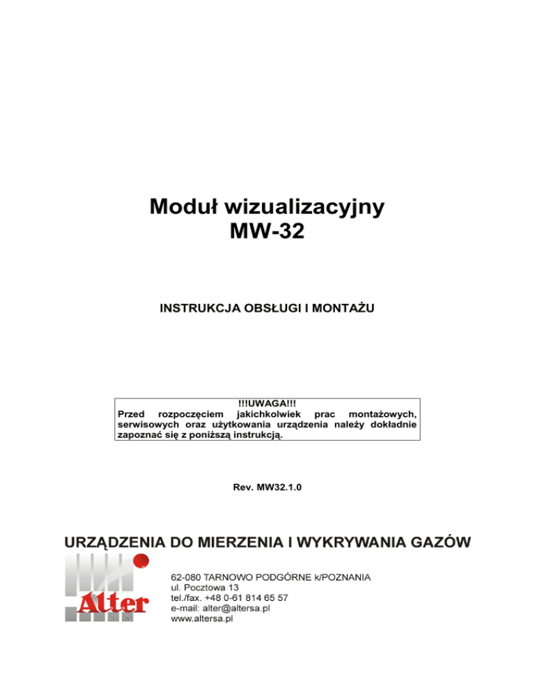 Moduł wizualizacyjny MW-32 INSTRUKCJA OBSŁUGI I MONTAŻU !!!UWAGA!!! Przed rozpoczęciem jakichkolwiek prac montażowych, serwisowych oraz użytkowania urządzenia należy dokładnie zapoznać się z poniższą instrukcją. Rev. MW32.1.0 SPIS TREŚCI OSTRZEŻENIA I ISTOTNE UWAGI ...................................................................................... 3 PRZEZNACZENIE I OGÓLNA CHARAKTERYSTYKA .......................................................... 5 OPIS FUNKCJONALNY ........................................................................................................ 6 Konfiguracja sygnalizatora akustycznego .......................................................................... 6 Sygnalizacja zasilania ........................................................................................................ 6 Sygnalizacja awarii ............................................................................................................ 7 Sygnalizacja komunikacji ................................................................................................... 7 Konfiguracja Master/Slave ................................................................................................. 7 Zwora konfiguracyjna ......................................................................................................... 7 Zaciski zasilania................................................................................................................. 7 Zaciski przekaźników ......................................................................................................... 7 Sygnalizacja stanów głowic................................................................................................ 7 Zaciski komunikacyjne ....................................................................................................... 9 KONFIGUROWANIE URZĄDZENIA ..................................................................................... 9 Konfiguracja trybu pracy (Master/Slave) ............................................................................ 9 Konfiguracja pracy sygnalizatora akustycznego ................................................................10 Tryb konfiguracyjny urządzenia ........................................................................................10 Konfiguracja parametrów wewnętrznych ...........................................................................10 MONTAŻ SYSTEMU ............................................................................................................11 Montaż modułu wizualizacyjnego ......................................................................................12 Dokonywanie połączeń .....................................................................................................13 Podłączanie zasilania do modułu ..................................................................................13 Przykład podłączania urządzeń współpracujących przez łącze RS-485 ........................14 Przykład podłączania komputera przez łącze RS-485 ...................................................15 URUCHAMIANIE SYSTEMU................................................................................................15 OBSŁUGA SYSTEMU ..........................................................................................................16 OPIS PROTOKOŁU TRANSMISJI MODUŁU MW-32 ...........................................................16 Format danych ..................................................................................................................16 Zaimplementowane funkcje ..............................................................................................17 Mapa rejestrów .................................................................................................................17 Rejestry wewnętrzne (16 bitowe) ...................................................................................17 KONTROLA OKRESOWA ....................................................................................................20 ZALECENIA I UWAGI EKSPLOATACYJNE .........................................................................20 PODSTAWOWE PARAMETRY TECHNICZNE ....................................................................21 TYPOWE AWARIE I SPOSOBY POSTĘPOWANIA .............................................................22 2 OSTRZEŻENIA I ISTOTNE UWAGI Dla zachowania pełnego bezpieczeństwa urządzenia muszą być montowane, obsługiwane i konserwowane wyłącznie przez wykwalifikowany personel oraz zgodnie z obowiązującymi przepisami. Przed podjęciem jakichkolwiek prac montażowych, serwisowych oraz użytkowania urządzeń należy dokładnie przeczytać w całości poniższą instrukcję. Urządzenie zasilane jest napięciem bezpiecznym z zewnętrznego zasilacza. Należy zwrócić uwagę na odpowiednie podłączenie zasilacza i jego bezpieczne użytkowanie, zgodnie z załączoną instrukcją obsługi zasilacza. Wyjścia przekaźnikowe przystosowane są do przełączania napięć niebezpiecznych dla życia i zdrowia. Należy zachować szczególną ostrożność podczas montażu oraz użytkowania urządzenia współpracującego z takimi napięciami. Zabrania się samodzielnego dokonywania jakichkolwiek napraw, wymiany części i podzespołów oraz zmian w urządzeniach. Urządzenia należy używać wyłącznie zgodnie z przeznaczeniem, obowiązującymi przepisami oraz zgodnie z opisami zawartymi w poniższej instrukcji, w przeciwnym razie mogą działać nieprawidłowo i nie gwarantować bezpieczeństwa. Nie należy używać uszkodzonych lub częściowo niesprawnych urządzeń. W przypadku stwierdzenia uszkodzenia, lub nieprawidłowości w pracy urządzeń należy bezwzględnie zaprzestać ich używania i skontaktować się z producentem urządzenia lub jego autoryzowanym serwisem. Niezbędne jest zapewnienie możliwości odłącz