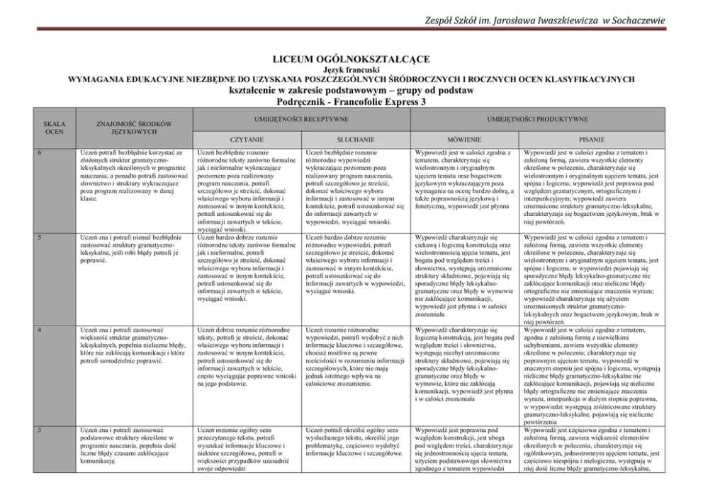 Zespół Szkół im Jarosława Iwaszkiewicza w Sochaczewie LICEUM OGÓLNOKSZTAŁC CE J zyk francuski WYMAGANIA EDUKACYJNE NIEZB DNE DO UZYSKANIA POSZCZEGÓLNYCH RÓDROCZNYCH I ROCZNYCH OCEN KLASYFIKACYJNYCH kształcenie w zakresie podstawowym – grupy od podstaw Podr cznik - Francofolie Express 3 SKALA OCEN ZNAJOMO Ć RODKÓW J ZYKOWYCH UMIźJ TNO CI RźCźPTYWNź CZYTANIE 6 Ucze potrafi bezbł dnie korzystać ze zło onych struktur gramatycznoleksykalnych okre lonych w programie nauczania, a ponadto potrafi zastosować słownictwo i struktury wykraczaj ce poza program realizowany w danej klasie. 5 Ucze zna i potrafi niemal bezbł dnie zastosować struktury gramatycznoleksykalne, je li robi bł dy potrafi je poprawić. 4 3 SŁUCHANIź UMIźJ TNO CI PRODUKTYWNź MÓWIźNIź PISANIE Ucze bezbł dnie rozumie ró norodne teksty zarówno formalne jak i nieformalne wykraczaj ce poziomem poza realizowany program nauczania, potrafi szczegółowo je stre cić, dokonać wła ciwego wyboru informacji i zastosować w innym kontek cie, potrafi ustosunkować si do informacji zawartych w tek cie, wyci gać wnioski. Ucze bardzo dobrze rozumie ró norodne teksty zarówno formalne jak i nieformalne, potrafi szczegółowo je stre cić, dokonać wła ciwego wyboru informacji i zastosować w innym kontek cie, potrafi ustosunkować si do informacji zawartych w tek cie, wyci gać wnioski. Ucze bezbł dnie rozumie ró norodne wypowiedzi wykraczaj ce poziomem poza realizowany program nauczania, potrafi szczegółowo je stre cić, dokonać wła ciwego wyboru informacji i zastosować w innym kontek cie, potrafi ustosunkować si do informacji zawartych w wypowiedzi, wyci gać wnioski. Wypowied jest w cało ci zgodna z tematem, charakteryzuje si wielostronnym i oryginalnym uj ciem tematu oraz bogactwem j zykowym wykraczaj cym poza wymagania na ocen bardzo dobr , a tak e poprawno ci j zykow i fonetyczn , wypowied jest płynna Wypowied jest w cało ci zgodna z tematem i zało on form , zawiera wszystkie elementy okre lone w poleceniu, charakteryzuje si wielostronnym i oryginalnym uj ciem tematu, jest spójna i logicznaś wypowied jest poprawna pod wzgl dem gramatycznym, ortograficznym i interpunkcyjnymś wypowied zawiera urozmaicone struktury gramatyczno-leksykalne, charakteryzuje si bogactwem j zykowym, brak w niej powtórze . Ucze bardzo dobrze rozumie ró norodne wypowiedzi, potrafi szczegółowo je stre cić, dokonać wła ciwego wyboru informacji i zastosować w innym kontek cie, potrafi ustosunkować si do informacji zawartych w wypowiedzi, wyci gać wnioski. Wypowied charakteryzuje si ciekaw i logiczn konstrukcj oraz wielostronno ci uj cia tematu, jest bogata pod wzgl dem tre ci i słownictwa, wyst puj urozmaicone struktury składniowe, pojawiaj si sporadyczne bł dy leksykalnogramatyczne oraz bł dy w wymowie nie zakłócaj ce komunikacji, wypowied jest płynna i w cało ci zrozumiała Ucze zna i potrafi zastosować wi kszo ć struktur gramatycznoleksykalnych, popełnia nieliczne bł dy, które nie zakłócaj komunikacji i które potrafi samodzielnie poprawić. Ucze dobrze rozumie ró norodne teksty, potrafi je stre cić, dokonać wła ciwego wyboru informacji i zastosować w innym kontek cie, potrafi ustosunkować si do informacji zawartych w tek cie, cz sto wyci gaj c poprawne wnioski na jego podstawie. Ucze rozumie ró norodne wypowiedzi, potrafi wydobyć z nich informacje kluczowe i szczegółowe, chocia mo liwe s pewne nie cisło ci w rozumieniu informacji szczegółowych, które nie maj jednak istotnego wpływu na cało ciowe zrozumienie. Wypowied charakteryzuje si logiczn konstrukcj , jest bogata pod wzgl dem tre ci i słownictwa, wyst puj niezbyt urozmaicone struktury składniowe, pojawiaj si sporadyczne bł dy leksykalnogramatyczne oraz bł dy w wymowie, które nie zakłócaj komunikacji, wypowied jest płynna i w cało ci zrozumiała Ucze zna i potrafi zastosować podstawowe struktury okre lone w programie nauczania, popełnia do ć liczne bł dy czasami zakłócaj ce komunikacj . Ucze rozumie ogólny sens przeczytanego tekstu, potrafi wyszukać informacje kluczowe i niektóre szczegółowe, potrafi w wi kszo ci przypadków uzasadnić swoje odpowiedzi Ucze potrafi okre lić ogólny sens wysłuchanego tekstu, okre lić jego problematyk , cz ciowo wydobyć informacje kluczowe i szczegółowe. Wypowied jest poprawna pod wzgl dem konstrukcji, jest uboga pod wzgl dem tre ci, charakteryzuje si jednostronno ci uj cia tematu, u yciem podstawowego słownictwa zgodnego z tematem wypowiedzi Wypowied jest w cało ci zgodna z tematem i zało on form , zawiera wszystkie elementy okre lone w poleceniu, charakteryzuje si wielostronnym i oryginalnym uj ciem tematu, jest spójna i logicznaś w wypowiedzi pojawiaj si sporadyczne bł dy leksykalno-gramatyczne nie zakłócaj ce komunikacji oraz nieliczne bł dy ortograficzne nie zmieniaj ce znaczenia wyrazuś wypowied charakteryzuje si u yciem urozmaiconych struktur gramatycznoleksykalnych oraz bogactwem j zykowym, brak w niej powtórze . Wypowied jest w cało ci zgodna z tematem, zgodna z zało on form z niewielkimi uchybieniami, zawiera wszystkie elementy okre lone w poleceniuś charakteryzuje si poprawnym uj ciem tematu, wypowied w znacznym stopniu jest spójna i logiczna, wyst puj nieliczne bł dy gramatyczno-leksykalne nie zakłócaj ce komunikacji, pojawiaj si nieliczne bł dy ortograficzne nie zmieniaj ce znaczenia wyrazu, interpunkcja w du ym stopniu poprawna, w wypowiedzi wyst puj zró nicowane struktury gramatyczno-leksykalne, pojawiaj si nieliczne powtórzenia Wypowied jest cz ciowo zgodna z tematem i zało on form , zawiera wi kszo ć elementów okre lonych w poleceniu, charakteryzuje si ogólnikowym, jednostronnym uj ciem tematu, jest cz ciowo niespójna i nielogiczna, wyst puj w niej do ć liczne bł dy gramatyczno-leksykalne, Zespół Szkół im Jarosława Iwaszkiewicza w Sochaczewie 2 Ucze zna i potrafi posługiwać si wybranymi podstawowymi strukturami 