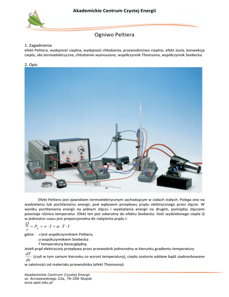 Akademickie Centrum Czystej Energii Ogniwo Peltiera 1. Zagadnienia efekt Peltiera, wydajność cieplna, wydajność chłodzenia, przewodnictwo cieplne, efekt Joula, konwekcja ciepła, siła termoelektryczna, chłodzenie wymuszone, współczynnik Thomsona, współczynnik Seebecka 2. Opis Efekt Peltiera jest zjawiskiem termoelektrycznym zachodzącym w ciałach stałych. Polega ono na wydzielaniu lub pochłanianiu energii, pod wpływem przepływu prądu elektrycznego przez złącze. W wyniku pochłaniania energii na jednym złączu i wydzielania energii na drugim, pomiędzy złączami powstaje różnica temperatur. Efekt ten jest odwrotny do efektu Seebecka. Ilość wydzielonego ciepła Q w jednostce czasu jest proporcjonalna do natężenia prądu I: Q = Pp = π ⋅ I = α ⋅ T ⋅ I t gdzie: π jest współczynnikiem Peltiera, α współczynnikiem Seebecka T temperaturą bezwzględną. Jeżeli prąd elektryczny przepływa przez przewodnik jednorodny w kierunku gradientu temperatury dT (czyli w tym samym kierunku co wzrost temperatury), ciepło zostanie oddane bądź zaabsorbowane dx w zależności od materiału przewodnika (efekt Thomsona): Akademickie Centrum Czystej Energii ul. Arciszewskiego 22a, 76-200 Słupsk acce.apsl.edu.pl Akademickie Centrum Czystej Energii PT = τ ⋅ I ⋅ dT dx gdzie τ jest współczynnikiem Thomsona. Kierunek przepływu ciepła zależy od znaku trzech wielkości: współczynnika Thomsona, kierunku przepływu prądu oraz kierunku gradientu temperatury. Rys. 1 Konstrukcja półprzewodnikowego modułu Peltiera. W praktyce kilka modułów połączonych jest szeregowo (elektrycznie) i równolegle (termicznie). Rys. 2 Schemat równowagi przepływu mocy w module Peltiera (w przypadku PT>0). Jeżeli prąd elektryczny przepływa przez przewodnik izotermiczny o rezystancji R na tym oporniku wydzieli się ciepło Joule’a: PJ = R ⋅ I 2 Ze względu na przewodność cieplną, ciepło przepływa od gorącej strony (Th) do zimnej strony (Tc): PL = λ A (Th − Tc ) d gdzie λ jest przewodnością cieplną, A polem przekroju poprzecznego, a d grubością modułu Peltiera. Zapisując ∆T = Th − Tc możemy zdolność cieplną modułu Peltiera na jego zimnej stronie (wydajność chłodzenia) zapisać w postaci: τ ⋅ I ⋅ ∆T 1 2 λ ⋅ A ⋅ ∆T − Pc = αTc I ± − I R− 2d 2 d oraz zdolność cieplną na jego gorącej stronie (wydajność grzewczą) jako: τ ⋅ I ⋅ ∆T 1 2 λ ⋅ A ⋅ ∆T + Ph = αTh I ± + I R− 2d 2 d Dostarczona moc elektryczna wynosi: τ ⋅ I ⋅ ∆T + Pel = αI∆T + RI 2 + =Up ⋅Ip 2d 3. Doświadczenie A. Wyznaczenie wydajności chłodzenia PC modułu w funkcji natężenia prądu oraz obliczenie współczynnika wydajności ηC. Po stronie zimnej (na Rys.3 strona lewa) zamontować zbiornik z wodą oraz umieścić w środku spiralę grzejną (R = 3 Ω) podłączoną do prądu przemiennego. Po stronie ciepłej (na Rys.3 strona prawa) zamontować wodny wymiennik ciepła podłączony do wodociągu. Ewentualnie można zamontować aluminiowy wymiennik ciepła (radiator cieplny) oraz nadmuch zimnego powietrza. Akademickie Centrum Czystej Energii ul. Arciszewskiego 22a, 76-200 Słupsk acce.apsl.edu.pl Akademickie Centrum Czystej Energii Rys.3 Zestawienie do wyznaczania wydajności chłodzenia. Rys. 4 Moc grzejna ogniwa w funkcji Dla różnych wartości natężenia prądu Ip ustawić moc grzejną PH = natężenia prądu roboczego. UH IH za pomocą rezystora nastawnego R w taki sposób, aby różnica temperatury między gorącą a zimną stroną wynosiła w przybliżeniu zero. W tym wypadku moc dostarczona do ogniwa odpowiada wydajności chłodzenia PC . Zmierzyć natężenie IH i napięcie UH na grzałce, natężenie Ip i napięcie Up na ogniwie oraz temperaturę po stronie gorącej (Th) oraz zimnej (Tc). Współczynnik wydajności możemy obliczyć na podstawie wzoru: ηc = Pc I ⋅U H = H Pel I p ⋅U p B. Wyznaczenie wydajności grzewczej PW modułu oraz współczynnika wydajności ηW przy stałym natężeniu i stałej temperaturze po zimnej stronie modułu. Usunąć wężownicę grzejną, nie będzie ona już potrzebna w ćwiczeniu. Odwrócić prąd roboczy tak, aby woda w zbiorniku po lewej stronie ogrzewała się. Zmierzyć wzrost temperatury wody Th w czasie przy stałym natężeniu prądu Ip przepływającego przez ogniwo Peltiera. Równocześnie mierzyć Up, Tc. Z nachylenia krzywej z Rys.5 (dla wartości początkowych krzywa ma postać prostej) możemy obliczyć wydajność grzewczą modułu Peltiera Ph = Ctot ∆Th ∆t Obliczyć pojemność cieplną bloku miedzianego CCu, wody Cw oraz zbiornika mosiężnego CBr korzystając ze wzoru: Ctot = mw ⋅ cw + mBr ⋅ cBr + mCu ⋅ cCu = 1121 gdzie mW = 0,194 kg, mBr = 0,0983 kg, mCu = 0,712 kg, J K cW = 4182 J/kg K cBr = 381 J/kg K cCu= 383 J/kg K Współczynnik wydajności można obliczyć ze wzoru: ηh = Ph Ph = Pel I p ⋅ U p Akademickie Centrum Czystej Energii ul. Arciszewskiego 22a, 76-200 Słupsk acce.apsl.edu.pl Rys.5 Temperatura gorącej strony w funkcji czasu. Akademickie Centrum Czystej Energii Wartość Up zmienia się w czasie, dlatego też należy obliczyć i podstawić do wzoru wartość średnią napięcia zarejestrowaną w przedziale, z liniowym gradientem temperatury. C. Wyznaczenie PW, ηW oraz PC, ηC z relacji temperatury i czasu po gorącej i zimnej stronie modułu. Dopasować zbiorniki wodne do obydwu stronach modułu Peltiera i napełnić je wodą o jednakowej temperaturze. Przy stałym natężeniu prądu Ip zmierzyć zmiany temperatury obydwu zbiorników tzn. Th = f(t), Tc = f(t), Ip oraz Up. Ph, PC, ηh ,ηC możemy obliczyć z nachylenia prostoliniowych początkowych odcinków krzywych ϑh=f(t) oraz ϑc=f(t) oraz znając pojemność cieplną układu. D. Zbadanie zachowania temperatury dla modułu używanego do chłodzenia, przy chłodzeniu gorącej strony powietrzem W eksperymencie instalujemy zbiornik wodnym po zimnej stronie i chłodnicą (radiator) po s