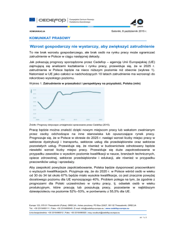 KOMUNIKACJA Saloniki, 8 październik 2015 r. KOMUNIKAT PRASOWY Wzrost gospodarczy nie wystarczy, aby zwiększyć zatrudnienie To nie brak wzrostu gospodarczego, ale brak osób na rynku pracy może ograniczać zatrudnienie w Polsce w ciągu następnej dekady. Jak pokazują prognozy sporządzone przez Cedefop – agencję Unii Europejskiej (UE) zajmującą się analizami kształcenia i rynku pracy, przewiduje się, że w 2025 r. zatrudnienie w Polsce będzie na nieco niższym poziomie niż obecnie (wykres 1). Natomiast w UE jako całości w nadchodzących 10 latach zatrudnienie ma wzrosnąć do rekordowo wysokiego poziomu. Wykres 1. Zatrudnienie w przeszłości i perspektywy na przyszłość, Polska (mln) Źródło: Prognozy dotyczące umiejętności opracowane przez Cedefop (2015). Pracę będzie można znaleźć dzięki nowym miejscom pracy lub wakatom zwalnianym przez osoby odchodzące na inne stanowiska lub opuszczające rynek pracy. Prognozuje się, że w Polsce w okresie do 2025 r. nastąpi wzrost liczby miejsc pracy w sektorze dystrybucji i transportu, sektorze usług dla przedsiębiorstw oraz sektorze pozostałych usług. Przewiduje się, że również w budownictwie odnotowany będzie niewielki wzrost liczby miejsc pracy. Przewiduje się duże zapotrzebowanie w przypadku zawodów o wysokim poziomie kwalifikacji w nauce, branżach technicznych, opiece zdrowotnej, sektorze przedsiębiorstw i edukacji, ale również w przypadku pracowników usług i sprzedaży. Aby zaspokoić powyższe zapotrzebowanie, Polska będzie dysponować pracownikami o wyższych kwalifikacjach. Przyjmuje się, że do 2020 r. w Polsce wśród osób w wieku od 30 do 34 lat około 67% będzie miało wysokie kwalifikacje, co jest znacznie powyżej docelowego poziomu dla UE wynoszącego 40%. Problem polega na tym, że zgodnie z prognozami dla Polski uczestnictwo w rynku pracy, tj. odsetek osób w wieku produkcyjnym, które pracują lub poszukują pracy, pozostanie w najbliższym dziesięcioleciu na poziomie 52%–53%, w porównaniu z 55,5% dla UE. Europe 123, 570 01 Thessaloniki (Pylea), GRECJA | Adres pocztowy: PO Box 22427, 551 02 Thessaloniki, GRECJA Tel.: +30 2310490111 | Faks: +30 2310490049 | E-mail: [email protected] | www.cedefop.europa.eu Linia bezpośrednia: +30 2310490012 | Faks: +30 2310490020 | [email protected] str. 1 z 3 Jedną z przyczyn jest starzenie się ludności Polski (wykres 2). Wraz ze starzeniem się ludności aktywnej zawodowo więcej osób przechodzi na emeryturę. W okresie do 2025 r. nastąpi znaczny spadek liczby osób w wieku od 15 do 39 lat uczestniczących w rynku pracy. Jednak oznacza to również, że znaczna liczba osób w wieku produkcyjnym pozostaje poza rynkiem pracy z takich powodów, jak obowiązki rodzinne, choroba bądź niepełnosprawność lub ponieważ stracili oni nadzieję na znalezienie pracy. Aby zwiększyć poziom zatrudnienia oraz pobudzić wzrost gospodarczy, Polska musi znaleźć sposoby przyciągnięcia na krajowy rynek pracy tych osób, wśród których wielu ma dobre kwalifikacje. Wykres 2. Zmiany w zakresie populacji w wieku produkcyjnym i ludności aktywnej zawodowo według wieku, 2013–2025, Polska (%) Źródło: Prognozy dotyczące umiejętności opracowane przez Cedefop (2015). Uwagi dla redaktorów • W opracowanych przez Cedefop prognozach dotyczących podaży umiejętności i popytu na nie w okresie do 2025 r. uwzględniono zmiany sytuacji gospodarczej na świecie do października 2014 r. W prognozach założono, że umiarkowane ożywienie gospodarcze będzie prowadziło do powolnego wzrostu zaufania w UE, przyczyniając się do wzrostu inwestycji, wydatków konsumenckich i eksportu. Inflacja utrzymuje się w docelowym przedziale, a stopy procentowe na niskim poziomie, natomiast wyższe dochody podatkowe pomagają rządom ograniczać zadłużenie. Założenia odpowiadają najnowszej prognozie Eurostatu dotyczącej ludności (Europop 2013 r.) oraz krótkoterminowej prognozie makroekonomicznej Komisji Europejskiej (z listopada 2014 r.). • Prognozy Cedefopu obejmują 28 państw członkowskich UE oraz Islandię, Norwegię i Szwajcarię. Wyniki, założenia i metodologia podlegają regularnym aktualizacjom i przeglądom prowadzonym przez ekspertów krajowych. W prognozach stosuje się zharmonizowane dane i metody umożliwiające porównania między państwami; prognozy nie zastępują prognoz krajowych. Dane dotyczące zatrudnienia odpowiadają danym zgłoszonym w rachunkach narodowych. • Prognozy dla UE i wszystkich państw członkowskich znajdują się tutaj. ### Przeczytaj komunikaty prasowe Cedefopu: http://www.cedefop.europa.eu/EN/news/press-releases.aspx Zaprenumeruj bezpłatny, elektroniczny biuletyn i noty informacyjne Cedefopu: http://www.cedefop.europa.eu/user/register Rzecznik prasowy: Rosy Voudouri Tel.: +30 2310 490012, e-mail: [email protected] str. 2 z 3 Rzecznik departamentu: Steve Bainbridge Tel.: +30 2310 490029, e-mail: [email protected] Kierownik ds. komunikacji: Gerd Oskar Bausewein Tel.: +30 2310 490288, e-mail: [email protected] O Cedefop Europejskie Centrum Rozwoju Kształcenia Zawodowego (Cedefop) jest agencją Unii Europejskiej z siedzibą w Salonikach (Grecja), wspierającą opracowywanie europejskiej polityki w dziedzinie kształcenia i szkolenia zawodowego. www.cedefop.europa.eu str. 3 z 3