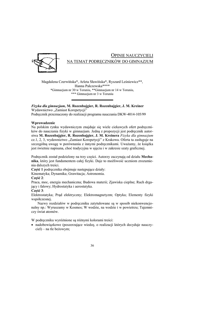 OPINIE NAUCZYCIELI NA TEMAT PODRĘCZNIKÓW DO GIMNAZJUM Magdalena Czerwińska*, Arleta Sławińska*, Ryszard Leśniewicz**, Hanna Palczewska**** *Gimnazjum nr 30 w Toruniu, **Gimnazjum nr 14 w Toruniu, *** Gimnazjum nr 3 w Toruniu Fizyka dla gimnazjum, M. Rozenbajgier, R. Rozenbajgier, J. M. Kreiner Wydawnictwo „Zamiast Korepetycji” Podręcznik przeznaczony do realizacji programu nauczania DKW-4014-105/99 Wprowadzenie Na polskim rynku wydawniczym znajduje się wiele ciekawych ofert podręczników do nauczania fizyki w gimnazjum. Jedną z propozycji jest podręcznik autorstwa M. Rozenbajgier, R. Rozenbajgier, J. M. Kreinera Fizyka dla gimnazjum cz.1, 2, 3, wydawnictwo „Zamiast Korepetycji” z Krakowa. Oferta ta zasługuje na szczególną uwagę w porównaniu z innymi podręcznikami. Uważamy, że książka jest świetnie napisana, choć tradycyjna w ujęciu i w zakresie szaty graficznej. Podręcznik został podzielony na trzy części. Autorzy zaczynają od działu Mechanika, który jest fundamentem całej fizyki. Daje to możliwość uczniom zrozumienia dalszych treści. Część 1 podręcznika obejmuje następujące działy: Kinematyka; Dynamika; Grawitacja; Astronomia. Część 2: Praca, moc, energia mechaniczna; Budowa materii; Zjawiska cieplne; Ruch drgający i falowy; Hydrostatyka i aerostatyka. Część 3: Elektrostatyka; Prąd elektryczny; Elektromagnetyzm; Optyka; Elementy fizyki współczesnej. Nazwy rozdziałów w podręczniku zatytułowane są w sposób niekonwencjonalny np.: Wyruszamy w Kosmos; W wodzie, na wodzie i w powietrzu; Tajemniczy świat atomów. W podręczniku wyróżnione są różnymi kolorami treści: nadobowiązkowe (poszerzające wiedzę, o realizacji których decyduje nauczyciel) – na tle beżowym; 36 powtórzeniowe (wiadomości z poprzednich klas oraz innych przedmiotów) – na tle zielonym; utrwalające wiedzę (to ważne) – na tle pomarańczowym; ćwiczeniowe (zadania obliczeniowe i nieobliczeniowe) – oznaczone literą Z; ciekawostki („Czy wiesz, że...”) – na tle niebieskim; przykłady rozwiązanych zadań – na tle żółtym; doświadczenia – oznaczone literą D. Na szczególną uwagę zasługują umieszczone w każdej części podręcznika „Nieregularne dodatki nadzwyczajne”. Skłaniają one ucznia do twórczego myślenia, stawiając go w sytuacjach nietypowych. Są to dodatki dla uczniów ambitnych i do wykorzystania przez nauczyciela na zajęciach dodatkowych. Podręcznik wyróżnia się niestandardowym, wielowariantowym przedstawianiem zjawisk i praw fizycznych, np. pierwszą zasadę dynamiki Newtona formułuje dwukrotnie: raz przez użycie wiadomości z zakresu oddziaływań, drugi raz w związku z wprowadzeniem pojęcia siły. Zmusza to ucznia do zastanowienia się, przed narysowaniem wektorów sił, z jakimi innymi ciałami badane ciało oddziałuje. Pozwoli mu to także przyłożyć siły do właściwego ciała, tzn. do tego, na które działają. Koncepcja ta jest przez autorów głęboko przemyślana i nie ma jej w innych podręcznikach fizyki. Podręcznik uczy poprawnego języka fizyki. Na uwagę zasługuje również fakt, że autorzy od samego początku rozróżniają wielkość wektorową i skalarną. Kończąc naukę w gimnazjum, uczniowie będą potrafili rozróżniać te wielkości. Dobrze opracowany jest model rozwiązywania zadań rachunkowych – zaprezentowano różne sposoby. Część I podręcznika podsumowano w formie grafów, pozwalającej uczniom zobaczyć logiczną strukturę i zakres opanowanego materiału. Niestety, pomysłu nie kontynuowano w części II i III. Uzupełnieniem podręcznika Fizyki dla gimnazjum są zeszyty przedmiotowo-ćwiczeniowe. Każdy paragraf zeszytu składa się z następujących części: notatki z lekcji; to ważne, czyli fizyka w pigułce (podsumowanie lekcji); fizyka wokół nas (uczy dostrzegać omawiane zjawiska w życiu codziennym); „fizyczne rachunki”, czyli rozwiązujemy zadania rachunkowe (i nie tylko); twoje laboratorium fizyczne (propozycje doświadczeń, które uczeń może wykonać w domu); „rozrywkowa” fizyka (rebusy, krzyżówki, zagadki, łamigłówki, logogryfy itp.). Ocena podstawowych funkcji podręcznika Jak podręcznik M. Rozenbajgier, R. Rozenbajgier, J. M. Kreinera spełnia funkcje określone w pracy J. Turło, zamieszczonej w tym numerze Fotonu? 37 Podręcznik nie zawiera nadmiaru wiadomości szczegółowych, podane są natomiast adresy stron internetowych, na których można znaleźć dodatkowe informacje. Opracowany został Poradnik dla nauczycieli, publikowany i przesyłany nauczycielom w częściach, które mogą być gromadzone w segregatorze. Przydatne są one zarówno młodym nauczycielom, jak i tym z dużą praktyką. Poradnik zawiera: teksty służące kształtowaniu umiejętności czytania ze zrozumieniem; propozycje wykorzystania komputera, propozycje przydziału godzin na poszczególne działy przy 4 i 5 godzinach fizyki w cyklu nauczania; rozkłady materiału przy różnych liczbach godzin; uwagi merytoryczne i metodyczne do realizacji treści fizycznych; propozycje wymagań na poszczególne oceny; testy służce ocenianiu wewnątrzszkolnemu; propozycje projektów (uwzględniają one uzdolnienia uczniów, np. dla humanistów – opowiadanie, dla artystów – plakat, rzeźba itp.); na lekcjach fizyki (konspekt lekcji); rozwiązania zadań z zeszytu przedmiotowo-ćwiczeniowego i podręcznika. Podręcznik ten nie stanowi konkurencji dla innych książek, ponieważ jest wymagający, tzn. jego treści nie są przedstawione w postaci „komiksu”, a wymaga myślenia opartego na związkach przyczynowo-skutkowych. Współpraca z Wydawnictwem układa się bardzo dobrze, gdyż jest ono otwarte na uwagi nauczycieli i systematycznie nanosi niezbędne poprawki w podręczniku i zeszycie przedmiotowo-ćwiczeniowym, co pomaga w nauczaniu fundamentalnego przedmiotu przyrodniczego – fizyki. Uwagi natury edytorskiej Ilustracje zamieszczone w podrę