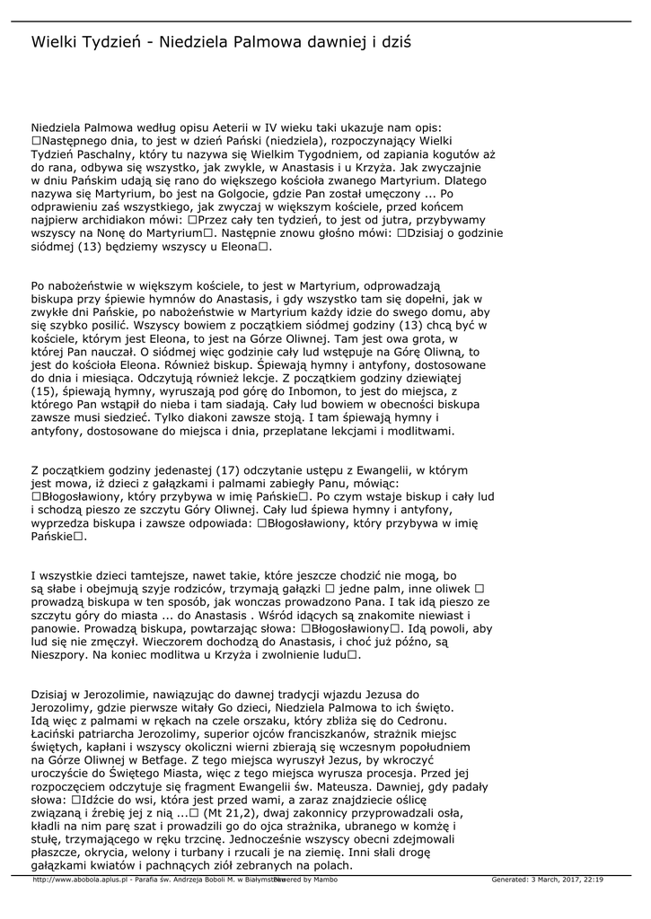 Wielki Tydzień - Niedziela Palmowa dawniej i dziś Niedziela Palmowa według opisu Aeterii w IV wieku taki ukazuje nam opis: Następnego dnia, to jest w dzień Pański (niedziela), rozpoczynający Wielki Tydzień Paschalny, który tu nazywa się Wielkim Tygodniem, od zapiania kogutów aż do rana, odbywa się wszystko, jak zwykle, w Anastasis i u Krzyża. Jak zwyczajnie w dniu Pańskim udają się rano do większego kościoła zwanego Martyrium. Dlatego nazywa się Martyrium, bo jest na Golgocie, gdzie Pan został umęczony ... Po odprawieniu zaś wszystkiego, jak zwyczaj w większym kościele, przed końcem najpierw archidiakon mówi: Przez cały ten tydzień, to jest od jutra, przybywamy wszyscy na Nonę do Martyrium. Następnie znowu głośno mówi: Dzisiaj o godzinie siódmej (13) będziemy wszyscy u Eleona. Po nabożeństwie w większym kościele, to jest w Martyrium, odprowadzają biskupa przy śpiewie hymnów do Anastasis, i gdy wszystko tam się dopełni, jak w zwykłe dni Pańskie, po nabożeństwie w Martyrium każdy idzie do swego domu, aby się szybko posilić. Wszyscy bowiem z początkiem siódmej godziny (13) chcą być w kościele, którym jest Eleona, to jest na Górze Oliwnej. Tam jest owa grota, w której Pan nauczał. O siódmej więc godzinie cały lud wstępuje na Górę Oliwną, to jest do kościoła Eleona. Również biskup. Śpiewają hymny i antyfony, dostosowane do dnia i miesiąca. Odczytują również lekcje. Z początkiem godziny dziewiątej (15), śpiewają hymny, wyruszają pod górę do Inbomon, to jest do miejsca, z którego Pan wstąpił do nieba i tam siadają. Cały lud bowiem w obecności biskupa zawsze musi siedzieć. Tylko diakoni zawsze stoją. I tam śpiewają hymny i antyfony, dostosowane do miejsca i dnia, przeplatane lekcjami i modlitwami. Z początkiem godziny jedenastej (17) odczytanie ustępu z Ewangelii, w którym jest mowa, iż dzieci z gałązkami i palmami zabiegły Panu, mówiąc: Błogosławiony, który przybywa w imię Pańskie. Po czym wstaje biskup i cały lud i schodzą pieszo ze szczytu Góry Oliwnej. Cały lud śpiewa hymny i antyfony, wyprzedza biskupa i zawsze odpowiada: Błogosławiony, który przybywa w imię Pańskie. I wszystkie dzieci tamtejsze, nawet takie, które jeszcze chodzić nie mogą, bo są słabe i obejmują szyje rodziców, trzymają gałązki jedne palm, inne oliwek prowadzą biskupa w ten sposób, jak wonczas prowadzono Pana. I tak idą pieszo ze szczytu góry do miasta ... do Anastasis . Wśród idących są znakomite niewiast i panowie. Prowadzą biskupa, powtarzając słowa: Błogosławiony. Idą powoli, aby lud się nie zmęczył. Wieczorem dochodzą do Anastasis, i choć już późno, są Nieszpory. Na koniec modlitwa u Krzyża i zwolnienie ludu. Dzisiaj w Jerozolimie, nawiązując do dawnej tradycji wjazdu Jezusa do Jerozolimy, gdzie pierwsze witały Go dzieci, Niedziela Palmowa to ich święto. Idą więc z palmami w rękach na czele orszaku, który zbliża się do Cedronu. Łaciński patriarcha Jerozolimy, superior ojców franciszkanów, strażnik miejsc świętych, kapłani i wszyscy okoliczni wierni zbierają się wczesnym popołudniem na Górze Oliwnej w Betfage. Z tego miejsca wyruszył Jezus, by wkroczyć uroczyście do Świętego Miasta, więc z tego miejsca wyrusza procesja. Przed jej rozpoczęciem odczytuje się fragment Ewangelii św. Mateusza. Dawniej, gdy padały słowa: Idźcie do wsi, która jest przed wami, a zaraz znajdziecie oślicę związaną i źrebię jej z nią ... (Mt 21,2), dwaj zakonnicy przyprowadzali osła, kładli na nim parę szat i prowadzili go do ojca strażnika, ubranego w komżę i stułę, trzymającego w ręku trzcinę. Jednocześnie wszyscy obecni zdejmowali płaszcze, okrycia, welony i turbany i rzucali je na ziemię. Inni słali drogę gałązkami kwiatów i pachnących ziół zebranych na polach. http://www.abobola.aplus.pl - Parafia św. Andrzeja Boboli M. w Białymstoku Powered by Mambo Generated: 3 March, 2017, 22:19 Dziś procesja zatrzymuje się na w miejscu Dominus Flevit (Jezus zapłakał), na zboczach Góry Oliwnej, tam, gdzie Jezus płakał nad Jerozolimą, przepowiadając jej zagładę. Panorama z tego miejsca jest zachwycająca. Przed oczami roztacza się całe miasto z bramą, która wjechał Chrystus na pierwszym miejscu. Dzisiaj to przejście jest zamurowane. Na jego miejscu wznosi się podwójna arkada Złotych Drzwi, które zostaną otwarte, jak się mówi, dopiero na przyjście Jezusa na Sąd Ostateczny. Procesja okrąża więc esplandę Świątyni, gdzie wznosi się Meczet Omara. Przez bramę św. Szczepana poprzez uliczki Starego Miasta dociera na pole Hosanna. Obrzędy liturgiczne Niedzieli Palmowej w Polsce są również bardzo uroczyste. Kapłan w czerwonej kapie udaje się w towarzystwie ministrantów przed kościół. Tam czekają wierni z palmami. Wchodzi do kościoła z pieśnią: Hosanna Synowi Dawidowemu! Błogosławiony, który idzie w imię Pańskie.... Czasami celebrans idzie z zakrystii wprost do ołtarza, a wierni są w kościele. Kapłan krótko przemawia, nawiązując do Niedzieli Palmowej, poświęca palmy i kropi je wodą święconą. Następnie czyta Ewangelię o wjeździe Pana Jezusa do Jerozolimy. Następnie wygłasza homilię na temat święta. Uroczystość Niedzieli Palmowej rozpoczyna się procesją. Na jej czele idzie ministrant z ogniem (kadzielnicą) i drugi ministrant z krzyżem, przy którym stoją po bokach dwaj ministranci z zapalonymi świecami. W czasie procesji śpiewa się pieśń: Króluj nam Chryste lub podobną. Po wejściu do kościoła celebrans całuje ołtarz i okadza go, po czym śpiewa kolektę dnia. Następnie jest Msza święta. Najwymowniejszą treścią Niedzieli Palmowej jest modlitwa, w czasie której kapłan poświęca palmy oraz kolekta. Wprowadzają one nas w nastrój Wielkiego Tygodnia. Wielu jednak z nas zastanawia się, dlaczego jest w nich mowa o Męce Pana Jezusa. Pamiętamy przecież, 