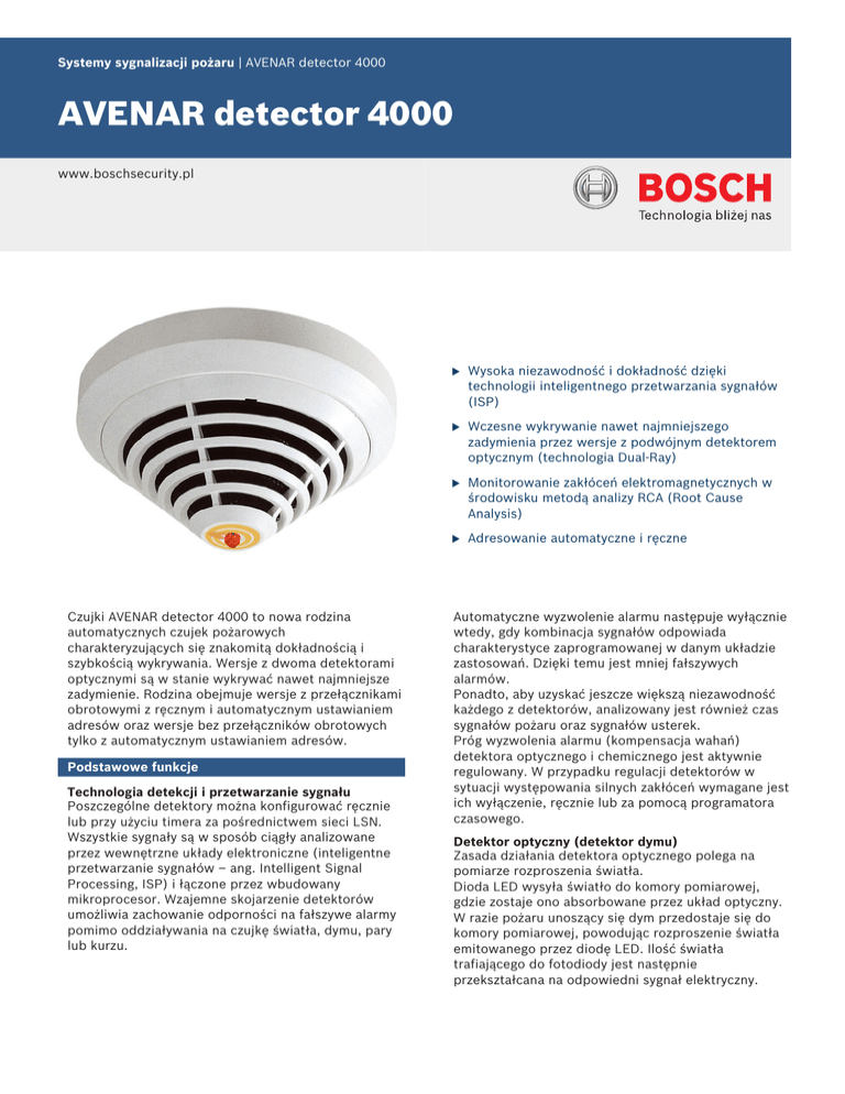 Systemy sygnalizacji pożaru | AVENAR detector 4000 AVENAR detector 4000 www.boschsecurity.pl Czujki AVENAR detector 4000 to nowa rodzina automatycznych czujek pożarowych charakteryzujących się znakomitą dokładnością i szybkością wykrywania. Wersje z dwoma detektorami optycznymi są w stanie wykrywać nawet najmniejsze zadymienie. Rodzina obejmuje wersje z przełącznikami obrotowymi z ręcznym i automatycznym ustawianiem adresów oraz wersje bez przełączników obrotowych tylko z automatycznym ustawianiem adresów. Podstawowe funkcje Technologia detekcji i przetwarzanie sygnału Poszczególne detektory można konfigurować ręcznie lub przy użyciu timera za pośrednictwem sieci LSN. Wszystkie sygnały są w sposób ciągły analizowane przez wewnętrzne układy elektroniczne (inteligentne przetwarzanie sygnałów – ang. Intelligent Signal Processing, ISP) i łączone przez wbudowany mikroprocesor. Wzajemne skojarzenie detektorów umożliwia zachowanie odporności na fałszywe alarmy pomimo oddziaływania na czujkę światła, dymu, pary lub kurzu. u Wysoka niezawodność i dokładność dzięki technologii inteligentnego przetwarzania sygnałów (ISP) u Wczesne wykrywanie nawet najmniejszego zadymienia przez wersje z podwójnym detektorem optycznym (technologia Dual-Ray) u Monitorowanie zakłóceń elektromagnetycznych w środowisku metodą analizy RCA (Root Cause Analysis) u Adresowanie automatyczne i ręczne Automatyczne wyzwolenie alarmu następuje wyłącznie wtedy, gdy kombinacja sygnałów odpowiada charakterystyce zaprogramowanej w danym układzie zastosowań. Dzięki temu jest mniej fałszywych alarmów. Ponadto, aby uzyskać jeszcze większą niezawodność każdego z detektorów, analizowany jest również czas sygnałów pożaru oraz sygnałów usterek. Próg wyzwolenia alarmu (kompensacja wahań) detektora optycznego i chemicznego jest aktywnie regulowany. W przypadku regulacji detektorów w sytuacji występowania silnych zakłóceń wymagane jest ich wyłączenie, ręcznie lub za pomocą programatora czasowego. Detektor optyczny (detektor dymu) Zasada działania detektora optycznego polega na pomiarze rozproszenia światła. Dioda LED wysyła światło do komory pomiarowej, gdzie zostaje ono absorbowane przez układ optyczny. W razie pożaru unoszący się dym przedostaje się do komory pomiarowej, powodując rozproszenie światła emitowanego przez diodę LED. Ilość światła trafiającego do fotodiody jest następnie przekształcana na odpowiedni sygnał elektryczny. 2 | AVENAR detector 4000 Wersje z podwójnym detektorem optycznym wykorzystują dwa detektory optyczne o różnej długości fali. Technologia Dual Ray działa dzięki wykorzystaniu podczerwonego i niebieskiego światła diod LED, co umożliwia wysoki poziom niezawodności wykrywania niewielkiego zadymienia (wykrywanie w warunkach TF1 i TF9). Detektor termiczny (detektor temperatury) Rolę detektora termicznego pełni termistor, z którego w regularnych odstępach czasu dokonywany jest pomiar napięcia zależnego od temperatury przez konwerter analogowo-cyfrowy. Zależnie od klasy czujki, detektory termiczne powodują uruchomienie alarmu w przypadku przekroczenia temperatury 54°C lub 69°C (czujki nadmiarowe) lub wzrostu temperatury o określoną wartość w danym czasie (czujki różnicowe). Detektor chemiczny (detektor tlenku węgla) Główne zadanie detektora chemicznego polega na wykrywaniu powstającego w wyniku spalania tlenku węgla (CO), jak również wodoru (H) i tlenku azotu (NO). Wartość sygnału detektora jest proporcjonalna do stężenia gazu. Detektor chemiczny dostarcza dodatkowych informacji pozwalających skutecznie eliminować fałszywe alarmy. Żywotność detektora chemicznego jest ograniczona, dlatego detektor C wyłącza się automatycznie najpóźniej po 6 latach pracy. Czujka będzie działać nadal jako czujka wielosensorowa z podwójnym detektorem optycznym i detektorem termicznym. Zaleca się jednak niezwłoczną wymianę czujki, aby móc korzystać z większej niezawodności wykrywania z detektorem C. Charakterystyka sieci LSN improved Czujka AVENAR detector 4000 oferuje wszystkie cechy technologii LSN improved: • Elastyczne struktury sieciowe, w tym T-tapping bez użycia dodatkowych elementów (T-tapping nie jest jednak możliwy dla czujek bez przełączników obrotowych umożliwiających adresowanie ręczne). • Nawet do 254 elementów sieci LSN improved w każdej pętli lub odgałęzieniu • Automatyczne lub ręczne adresowanie czujek, z automatycznym wykrywaniem lub bez niego • Zasilanie dołączonych elementów przez szynę LSN • Możliwość stosowania nieekranowanych kabli sygnalizacji pożarowej • Maks. długość kabla 3000 m (przy LSN 1500 A) • Zgodność wsteczna z już istniejącymi systemami sieci LSN i centralami sygnalizacji pożaru • Monitorowanie zakłóceń elektromagnetycznych w środowisku metodą szybkiej analizy RCA (wartości EMC są wyświetlane na centrali) Dodatkowo czujki tej rodziny oferują wszystkie dowiedzione zalety technologii LSN. Za pomocą oprogramowania centrali można zmienić charakterystykę wykrywania, zależnie od monitorowanego pomieszczenia. Każda skonfigurowana czujka może dostarczać następujące dane: • • • • Numer seryjny Poziom zabrudzenia elementów optycznych Czas pracy Bieżące wartości analogowe – Wartości systemu optycznego: bieżąca zmierzona wartość detektora rozproszenia światła, zakres pomiaru jest liniowy i wskazuje stopień zabrudzenia, od lekkiego do dużego. – Zabrudzenie: wartość pokazuje wzrost bieżącej wartości zabrudzenia w stosunku do sytuacji wyjściowej. – Wartość CO: bieżąca zmierzona wartość (maks. 550). Czujka posiada funkcję automonitorowania. Centrala sygnalizacji pożaru wyświetla następujące błędy: • Informacje o awarii w przypadku awarii układu elektronicznego czujki • Poziom zabrudzenia podczas pracy (tryb ciągły) • Informa