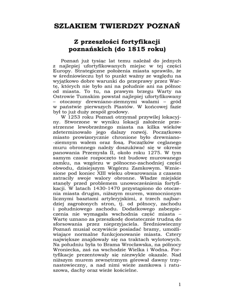 SZLAKIEM TWIERDZY POZNAŃ Z przeszłości fortyfikacji poznańskich (do 1815 roku) Poznań już tysiąc lat temu należał do jednych z najlepiej ufortyfikowanych miejsc w tej części Europy. Strategiczne położenia miasta sprawiło, że w średniowieczu był to punkt ważny ze względu na wyjątkowo dobre warunki do przeprawy przez Wartę, których nie było ani na południe ani na północ od miasta. To tu, na prawym brzegu Warty na Ostrowie Tumskim powstał najlepiej ufortyfikowany – otoczony drewniano-ziemnymi wałami – gród w państwie pierwszych Piastów. W końcowej fazie był to już duży zespół grodowy. W 1253 roku Poznań otrzymał przywilej lokacyjny. Stworzone w wyniku lokacji założenie przestrzenne lewobrzeżnego miasta na kilka wieków zdeterminowało jego dalszy rozwój. Początkowo miasto prowizorycznie chronione było drewniano-ziemnym wałem oraz fosą. Początków ceglanego muru obronnego należy doszukiwać się w okresie panowania Przemysła II, około roku 1275. W tym samym czasie rozpoczęto też budowę murowanego zamku, na wzgórzu w północno-zachodniej części obwodu, dzisiejszym Wzgórzu Zamkowym. Wzniesione pod koniec XIII wieku obwarowania z czasem zatraciły swoje walory obronne. Władze miejskie stanęły przed problemem unowocześnienia fortyfikacji. W latach 1430-1470 przystąpiono do otoczenia miasta drugim, niższym murem, wzmocnionym licznymi basztami artyleryjskimi, z trzech najbardziej zagrożonych stron, tj. od północy, zachodu i południowego zachodu. Dodatkowego zabezpieczenia nie wymagała wschodnia część miasta – Wartę uznano za przeszkodę dostatecznie trudną do sforsowania przez nieprzyjaciela. Średniowieczny Poznań musiał oczywiście posiadać bramy, umożliwiające normalne funkcjonowanie miasta. Cztery największe znajdowały się na traktach wylotowych. Na południu była to Brama Wrocławska, na północy Wroniecka, zaś na wschodzie Wielka i Wodna. Fortyfikacje prezentowały się niezwykle okazale. Nad niższym murem zewnętrznym górował dawny trzynastowieczny, a nad nimi wieże zamkowa i ratuszowa, dachy oraz wieże kościelne. 1 Średniowiecze zakończyło się dla poznańskich umocnień dopiero w czasach potopu szwedzkiego. W czasie wojen – w XVII i XVIII wieku – Poznań nie stanowił już trudnej do zdobycia twierdzy i przechodził z rąk do rąk, zajmowany przez Szwedów, Rosjan, Sasów, a nawet polskie wojska konfederackie. Umocnienia z tego okresu opierały się głównie o stare mury miejskie, jedynie wybrane fragmenty wzmacniano przy pomocy ziemnych, palisadowanych bastionów. Wiek XIX był w Poznaniu wiekiem zaboru pruskiego. Decyzje podjęte na Kongresie w Wiedniu w 1815 roku spowodowały znaczne okrojenie zaboru. Poznań znalazł się w odległości zaledwie kilkudziesięciu kilometrów od granicy z Królestwem Kongresowym. Sytuacja urealniła możliwość konfliktu Prus z Rosją. Ze względu na strategiczne położenie i obawy przed polskim ruchem niepodległościowym w pruskich kołach militarnych szybko podjęto decyzję o ufortyfikowaniu miasta. Prusacy przystąpili do rozbudowy systemu twierdz na granicy z Rosją. Część z nich pochodziła jeszcze z XVIII wieku, a niektóre trzeba było stawiać od nowa. Ostatecznie system obejmował: Grudziądz, Toruń, Poznań, Głogów, Nysę i Kłodzko. Główna rola obronna oprócz Poznania, przypadła twierdzy w Toruniu. Również Rosjanie podjęli budowę wielkich twierdz przy swojej zachodniej granicy w Warszawie, Modlinie czy Dęblinie. Twierdza Poznań w XIX wieku Inicjatorem planu ufortyfikowania Poznania w XIX wieku był generał Karl von Grolman – szef V Korpusu Armii pruskiej, który już w 1816 roku przeprowadził na polecenie Fryderyka Wilhelma II rozpoznanie. Projekt fortyfikacji był wielokrotnie aktualizowany i w ostatecznej formie opracowany najprawdopodobniej w 1827 roku. Rok później projekt sporządzony przez gen. Johanna Leopolda Ludwiga von Brese zatwierdził Fryderyk Wilhelm II rozporządzeniem adresowanym do generała Karla von Hake, ministra wojny. W projekcie wymienione były wszystkie charakterystyczne elementy późniejszej twierdzy, m.in. umocnienia na prawym brzegu Warty oraz poligonalny rdzeń na lewym brzegu. Król niezwłocznie nakazał również budowę obszernego 2 fortu na Winiarach i u jego stóp dwóch śluz na Warcie i Wierzbaku z mostami, przejściami i osłaniającymi je umocnieniami. W miejscu, w którym miała powstać twierdza, na górującym nad miastem Wzgórzu Winiarskim 23 czerwca 1828 roku przystąpiono do kopania rowów pod przyszłe fosy. Podjęte prace przebiegały wprawdzie wolno, lecz z pruską systematycznością. Wszystkie gotowe obiekty natychmiast uzbrajano i obsadzano załogą. Ogólny zarys umocnień Cytadeli ukształtował się około 1839 roku, lecz ostateczna sylwetka twierdzy formowana była jeszcze w latach siedemdziesiątych XIX wieku. Cytadela stała się wówczas najistotniejszym elementem wewnętrznego pierścienia fortecznego. Umocnienia prawobrzeżne budowano od końca lat 30-tych do roku 1846. Zaś prace przy lewobrzeżnym rdzeniu trwające 20 lat rozpoczęto w marcu 1840. W efekcie powstał półokrągły poligonalny rdzeń o promieniu 1 km, obejmujący od południa i zachodu całe położone na lewym brzegu miasto. Rdzeń połączył się z wybudowanymi wcześniej prawobrzeżnymi umocnieniami. Około 1850 roku pojawiła się koncepcja budowy Cytadeli Tumskiej. Dostrzeżono wtedy naturalne właściwości obronne Ostrowa Tumskiego oddzielonego od pozostałych części miasta starymi ciekami wodnymi (lub ich pozostałościami). Wyodrębniona wewnętrzna cytadela wokół Katedry i Zagórza obejmowała stare umocnienia na północ od świątyni (Kawalier Katedralny, Śluza Katedralna i Most Śródecki z lat 30-tych) i nowej Reduty Katedralnej (z 2. połowy lat 50-tych) oraz otoczenie ich od wschodu i zachodu kanałami wodnymi, a od północy starą wodną fosą przed Kawalierem K