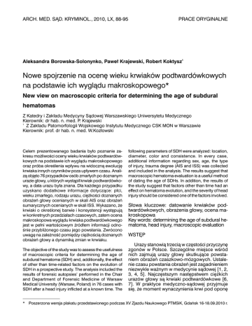 ARCH. MED. SĄD. KRYMINOL., 2010, LX, 88-95 PRACE ORYGINALNE Aleksandra Borowska-Solonynko, Paweł Krajewski, Robert Koktysz1 Nowe spojrzenie na ocenę wieku krwiaków podtwardówkowych na podstawie ich wyglądu makroskopowego* New view on macroscopic criteria for determining the age of subdural hematomas Z Katedry i Zakładu Medycyny Sądowej Warszawskiego Uniwersytetu Medycznego Kierownik: dr hab. n. med. P. Krajewski 1 Z Zakładu Patomorfologii Wojskowego Instytutu Medycznego CSK MON w Warszawie Kierownik: prof. dr hab. n. med. W.Kozłowski Celem prezentowanego badania było poznanie zakresu możliwości oceny wieku krwiaków podtwardówkowych na podstawie ich wyglądu makroskopowego oraz próba określenia wpływu na widoczną ewolucję krwiaka innych czynników poza upływem czasu. Analizą objęto 76 przypadków osób zmarłych po doznanym urazie głowy, u których wystąpił krwiak podtwardówkowy, a data urazu była znana. Dla każdego przypadku uzyskano dodatkowe informacje dotyczące: płci, wieku zmarłego, rodzaju urazu, ciężkości doznanych obrażeń głowy ocenianych w skali AIS oraz obrażeń sumarycznych ocenianych w skali ISS. Wykazano, że krwiaki o określonej barwie i konsystencji występują w konkretnych przedziałach czasowych, zatem ocena makroskopowa wyglądu krwiaka podtwardówkowego jest w pełni wartościowym źródłem informacji odnośnie przybliżonego czasu jego powstania. Zwrócono uwagę na zależność pomiędzy ciężkością doznanych obrażeń głowy a dynamiką zmian w krwiaku. The objective of the study was to assess the usefulness of macroscopic criteria for determining the age of subdural hematoma (SDH) and, additionally, the effect of other than time-related factors on the evolution of SDH in a prospective study. The analysis included the results of forensic autopsies’ performed in the Chair and Department of Forensic Medicine of Warsaw Medical University (Warsaw, Poland) in 76 cases with SDH after a head injury inflicted at a known time. The * following parameters of SDH were analyzed: location, diameter, color and consistence. In every case, additional information regarding sex, age, the type of injury, trauma degree (AIS and ISS) was collected and included in the analysis. The results suggest that macroscopic hematoma evaluation is a useful method of dating the age of SDHs. In addition, the results of the study suggest that factors other than time had an effect on hematoma evolution, and the severity of head injury should be considered one of the factors involved. Słowa kluczowe: datowanie krwiaków podtwardówkowych, obrażenia głowy, ocena makroskopowa Key words: determining the age of subdural hematoma, head injury, macroscopic evaluation WSTęP Urazy stanowią trzecią w częstości przyczynę zgonów w Polsce. Szczególne miejsce wśród nich zajmują urazy głowy skutkujące powstaniem obrażeń czaszkowo-mózgowych. Ustalenie czasu powstania obrażeń jest zagadnieniem niezwykle ważnym w medycynie sądowej [1, 2, 3, 4, 5]. Najczęstszym następstwem ciężkich urazów głowy są krwiaki podtwardówkowe [6, 7]. W praktyce medyczno-sądowej przyjmuje się, że moment wynaczynienia krwi pod oponę Poszerzona wersja plakatu przedstawionego podczas XV Zjazdu Naukowego PTMSiK, Gdańsk 16-18.09.2010 r. Nr 2-3 MAKROSKOPOWA OCENA KRWIAKóW PODTWARDóWKOWYCH twardą zbliżony jest do momentu urazu. Oznacza to, że ustalenie wieku krwiaka podtwardówkowego pozwoliłoby na poznanie przybliżonej daty urazu. W piśmiennictwie, zarówno krajowym jak i zagranicznym, można znaleźć niewiele prac poświęconych tej właśnie tematyce. Jedną z częściej wymienianych wśród tradycyjnych metod datowania krwiaków podtwardówkowych jest ocena wieku krwiaka na podstawie jego wyglądu makroskopowego [8, 9, 10]. Jej rzeczywista przydatność jest niejednokrotnie podważana [5] lub możliwości tej metody sprowadzane są do ogólnego podziału krwiaków na ostre i przewlekłe [8]. Zwraca uwagę, że w dostępnym piśmiennictwie, ewolucja krwiaka nie była odnoszona do innych czynników poza upływem czasu, jak np.: rodzaj urazu, inne obrażenia towarzyszące obrażeniom głowy. Pozostaje zatem nierozwiązany problem, czy reakcja miejscowa organizmu na wynaczynioną krew, a tym samym zmiany zachodzące w krwiaku, są niezależne od zmian ogólnoustrojowych. W związku z powyższym, celem podjętego badania było określenie rzeczywistego zakresu możliwości oceny wieku krwiaków podtwardówkowych na podstawie ich wyglądu makroskopowego oraz próba określenia wpływu na widoczną ewolucję krwiaka czynników dodatkowych poza upływem czasu. MATERIAŁ I METODY Badanie obejmowało 76 sekcji zwłok wykonanych w Katedrze i Zakładzie Medycyny Sądowej Warszawskiego Uniwersytetu Medycznego w latach 2006-2007. W całej grupie badanej w 38 przypadkach przyczyną zgonu były obrażenia czaszkowo-mózgowe, w 35 obrażenia wielonarządowe, a w pozostałych trzech inne przyczyny (zatorowość płucna oraz zawał mięśnia serca). Analizowano przypadki osób zmarłych po doznanym urazie głowy, u których wystąpił krwiak podtwardówkowy, a moment urazu był możliwy do ustalenia. W 20 przypadkach wykonana była chirurgiczna ewakuacja krwiaka. Na podstawie protokołów oględzin i otwarcia zwłok oraz dokumentów dostarczonych przez prokuraturę, w tym – w przypadku osób hospitalizowanych – historii choroby; dla każdego przypadku uzyskano dane dotyczące: płci, wieku zmarłego, rodzaju urazu, czasu jaki upłynął od urazu do zgonu oraz od zgonu do sekcji a także wykonanej w warunkach szpitalnych ewakuacji krwiaka, chorób współtowarzyszących takich, jak zapalenia płuc lub uogólnionego zakażenia, ciężkości obrażeń głowy oraz obrażeń innych 89 okolic ciała a także wystąpienia masywnej utraty krwi, przy czym za masywną utratę krwi uznano krwotok prowadzący do utraty powyżej 20% krwi obwodowej. Ciężkość obrażeń poszczególnych