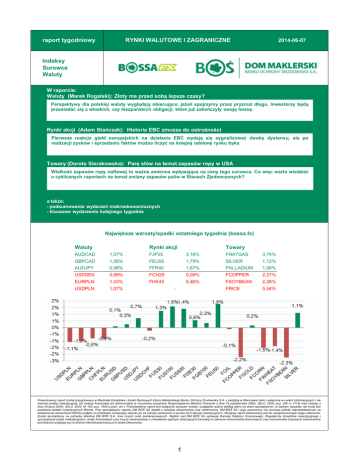 raport tygodniowy RYNKI WALUTOWE I ZAGRANICZNE 2014-06-07 Indeksy Surowce Waluty W raporcie: Waluty (Marek Rogalski): Złoty ma przed sobą lepsze czasy? Perspektywy dla polskiej waluty wyglądają obiecująco, jeżeli spojrzymy przez pryzmat długu. Inwestorzy będą przesiadać się z włoskich, czy hiszpańskich obligacji, które już zakończyły swoją hossę. Rynki akcji (Adam Stańczak): Historia EBC zmusza do ostrożności Pierwsze reakcje giełd europejskich na działania EBC wydają się sygnalizować dawkę dystansu, ale po realizacji zysków i sprzedaniu faktów można liczyć na kolejną odsłonę rynku byka. 21 Towary (Dorota Sierakowska): Parę słów na temat zapasów ropy w USA Wielkość zapasów ropy naftowej to ważna zmienna wpływająca na ceny tego surowca. Co więc warto wiedzieć o cyklicznych raportach na temat zmiany zapasów paliw w Stanach Zjednoczonych? a także: - podsumowanie wydarzeń makroekonomicznych - kluczowe wydarzenia kolejnego tygodnia Największe wzrosty/spadki ostatniego tygodnia (bossa.fx) Waluty Rynki akcji Towary AUDCAD 1,07% FJP25 3,16% FNATGAS 3,74% GBPCAD 1,06% FEU50 1,79% SILVER 1,12% AUDJPY 0,98% FFR40 1,67% PALLADIUM 1,06% USDSEK 0,99% FCH20 0,09% FCOPPER 2,21% EURPLN 1,03% FHK45 0,46% FSOYBEAN 2,26% USDPLN 1,07% FRICE 5,54% - Prezentowany raport został przygotowany w Wydziale Doradztwa i Analiz Rynkowych Domu Maklerskiego Banku Ochrony Środowiska S.A. z siedzibą w Warszawie tylko i wyłącznie w celach informacyjnych i nie stanowi analizy inwestycyjnej, ani analizy finansowej ani rekomendacji w rozumieniu przepisów Rozporządzenia Ministra Finansów z dnia 19 października 2005r. (Dz.U. 2005, poz. 206 nr 1715) oraz Ustawy z dnia 29 lipca 2005r. (Dz.U. 2005, Nr 183, poz. 1538 z późn. zm.). Przedstawiony raport jest wyłącznie wyrazem wiedzy i poglądów autora według stanu na dzień sporządzenia i w żadnym wypadku nie może być podstawą działań inwestycyjnych Klienta. Przy sporządzaniu raportu DM BOŚ SA działał z należytą starannością oraz rzetelnością. DM BOŚ SA i jego pracownicy nie ponoszą jednak odpowiedzialności za działania lub zaniechania Klienta podjęte na podstawie niniejszego raportu ani za szkody poniesione w wyniku tych decyzji inwestycyjnych. Niniejszy raport adresowany jest do nieograniczonego kręgu odbiorców. Został sporządzony na potrzeby klientów DM BOŚ S.A. oraz innych osób zainteresowanych. Nadzór nad DM BOŚ SA sprawuje Komisja Nadzoru Finansowego. Regulaminy doradztwa inwestycyjnego i sporządzania analiz inwestycyjnych, analiz finansowych oraz innych rekomendacji o charakterze ogólnym dotyczących transakcji w zakresie instrumentów finansowych oraz instrumentów bazowych instrumentów pochodnych znajdują się na stronie internetowej bossa.pl w dziale Dokumenty. 1 raport tygodniowy RYNKI WALUTOWE I ZAGRANICZNE 2014-06-07 Makro-podsumowanie minionego tygodnia Poniedziałek, 2 czerwca: AUSTRALIA: Indeks PMI dla przemysłu 49,2 (Poprz. 44,8), maj JAPONIA: Indeks PMI dla przemysłu 49,9 (Oczek. 49,9, Poprz. 49,4), maj POLSKA: Indeks PMI dla przemysłu 50,8 (Oczek. 52,4, Poprz. 52,0), maj EUROLAND: Indeks PMI dla przemysłu - fin. 52,2 (Oczek. 52,5, Poprz. 53,4), maj NIEMCY: Indeks PMI dla przemysłu - fin. 52,3 (Oczek. 52,9, Poprz. 54,1), maj CZECHY: Indeks PMI dla przemysłu 57,3 (Oczek. 55,4, Poprz. 56,5), maj SZWAJCARIA: Indeks PMI dla przemysłu 52,5 (Oczek. 55, Poprz. 55,8), maj HISZPANIA: Indeks PMI dla przemysłu 52,9 (Oczek. 53,0, Poprz. 52,7), maj WIELKA BRYTANIA: Indeks PMI dla przemysłu 57 (Oczek. 57,3, Poprz. 57,3), maj WĘGRY: Indeks PMI dla przemysłu 53,9 (Poprz. 54,6), maj WĘGRY: Bilans handlu zagranicznego - fin. 687,5 mln EUR (Oczek. 675 mln EUR, Poprz. 759,3 mln EUR), marzec KANADA: Indeks PMI dla przemysłu 52,2 (Poprz. 52,9), maj USA: Indeks ISM dla przemysłu 53,2 (Oczek. 55,5, Poprz. 54,9), maj Wtorek, 3 czerwca: AUSTRALIA: RBA nie zmienił stóp procentowych CHINY: Indeks PMI dla przemysłu - fin. 49,4 (Oczek. 49,7, Poprz. 48,1), maj AUSTRALIA: Sprzedaż detaliczna 0,2% m/m (Oczek. 0,2% m/m, Poprz. 0,1% m/m), kwiecień WIELKA BRYTANIA: Indeks cen nieruchomości - Nationwide 0,7% m/m (Oczek. 0,6% m/m, Poprz. 1,2% m/m), maj EUROLAND: Inflacja HICP - dane szacunkowe 0,5% r/r (Oczek. 0,7% r/r, Poprz. 0,7% r/r), maj USA: Zamówienia na dobra trwałego użytku - fin. 0,6% m/m (Oczek. 0,8% m/m, Poprz. 3,6% m/m), kwiecień USA: Zamówienia na dobra bez środków trans. - fin. 0,3% m/m (Oczek. 0,1% m/m, Poprz. 2,9% m/m), kwiecień USA: Zamówienia w przemyśle 0,7% m/m (Oczek. 0,6% m/m, Poprz. 1,1% m/m), kwiecień Środa, 4 czerwca: POLSKA: RPP nie zmieniła stóp procentowych. Na konferencji prasowej pojawiła się jednak możliwość cięcia stóp procentowych w ciągu kilku miesięcy – chociaż prezes Belka dał do zrozumienia, że nie jest to podstawowy scenariusz AUSTRALIA: Indeks PSI dla usług 49,9 (Poprz. 48,6), maj EUROLAND: PKB s.a. - rew. 0,2% k/k 0,9% r/r (Oczek. 0,2% k/k 0,9% r/r, Poprz. 0,2% k/k 0,5% r/r), I kw. EUROLAND: Indeks PMI dla usług - fin. 53,2 (Oczek. 53,5, Poprz. 53,1), maj WIELKA BRYTANIA: Indeks PMI dla usług 58,6 (Oczek. 58,2, Poprz. 58,7), maj NIEMCY: Indeks PMI dla usług - fin. 56,0 (Oczek. 56,4, Poprz. 54,7), maj CZECHY: PKB s.a. - fin. 0,4% k/k 2,5% r/r (Oczek. 0,0% k/k 2,0% r/r, Poprz. 1,8% k/k 1,2% r/r), I kw. WĘGRY: Sprzedaż detaliczna w.d.a. 6,6% r/r (Poprz. 8,3% r/r), kwiecień WĘGRY: PKB n.s.a. - fin. 3,5% r/r (Oczek. 3,5% r/r, Poprz. 2,7% r/r), I kw. SŁOWACJA: PKB - fin. 2,4% r/r (Oczek. 2,4% r/r, Poprz. 1,5% r/r), I kw. USA: Bilans handlu zagranicznego -47,24 mld USD (Oczek. -40,5 mld USD, Poprz. -40,38 mld USD), kwiecień USA: Eksport 193,35 mld USD (Poprz. 193,91 mld USD), kwiecień USA: Import 240,58 mld USD (Poprz. 234,29 mld USD), kwiecień USA: Indeks ISM dla usług 56,3 (Oczek. 55,5, Poprz. 55,2), maj KANADA: Bilans handlu zagranicznego -0,64 mld CAD (Oczek. 0,10 mld CAD, Poprz. 0,08 mld CAD), kwiecień Czwa