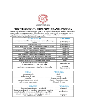 RANGER SURVIVAL CLUB MATERIAŁY SZKOLENIOWE PROSTE SPOSOBY PRZEPOWIADANIA POGODY Zawsze zadziwiało mnie, gdy ksiąŜkowi traperzy spoglądali od niechcenia w niebo i bezbłędnie przepowiadali pogodę na następny dzień. PoniŜsze tabelki mogą pomóc w osiągnięciu w tym względzie sprawności starego górala., choć - co sprawdziłem wielokrotnie - niektóre z prognostyków nie mają stuprocentowej skuteczności. BARWY NIEBA PROGNOZA na wieczornym niebie róŜowe chmury pierzaste bez innych chmur niebo poranne szare piękna, niejaskrawa zorza wieczorna bez ciemnych chmur zorza poranna w niskich chmurach jaskrawe i kontrastowe barwy na niebie porannym i wieczornym ciemna lub fioletowa czerwień silne róŜnice w zabarwieniu chmur podczas dnia ciemno niebieskie niebo przy wietrznej pogodzie szare niebo pokryte licznymi wielkimi chmurami kłębiastymi szare niebo pokryte chmurami warstwowymi na wieczornym niebie przewaŜają barwy brudno-seledynowe i czerwono Ŝółte piękna pogoda piękna pogoda niepogoda niepogoda niepogoda niepogoda nieustalona pogoda posucha deszcz na wieczornym niebie przewaŜają barwy jasnoŜółte wietrznie, bezdeszczowo piękna pogoda deszcz i wiatr MGŁY PROGNOZA opadająca mgła podnosząca się mgła mŜawka gęsta mgła poranna w jesieni mgła poranna w gorące dni cieplej deszcz długotrwała niepogoda długotrwała piękna pogoda skłonność do burz CHMURY PROGNOZA chmury róŜnego kształtu i wysokości chmury zbierające się po burzliwej i deszczowej pogodzie na zachodzie lub północnym zachodzie i tworzące kłęby chmury pierzaste, szybko przeciągające z zachodu lub południowego zachodu niepogoda przejaśnienia niepogoda powolny przepływ chmur pierzastych ze wschodu zbieranie się licznych chmur pierzastych po długiej ładnej pogodzie zbieranie się wieczorem licznych chmur pierzastych po długiej ładnej pogodzie na zachodniej stronie nieba chmury pierzaste w warstwach baranki na niebie porannym baranki na niebie wieczornym baranki w ciągu dnia i rozprzestrzeniające się chmury kłębiaste wieczorem chmury kłębiaste z ostrymi konturami brzegi chmur zacierają się chmury pęcznieją w górze chmury kłębiaste o wschodzie słońca wiele ciemnych chmur warstwowych ciemnoszare chmury warstwowe pod jasnoszarym niebem walcowate lub nawisłe chmury przepływające z jednej strony nieba na drugą bezchmurne niebo wczesnym rankiem podczas nieustalonej pogody długotrwała piękna pogoda zbliŜająca się depresja, która moŜe przejść bez opadów prawdopodobnie niepogoda deszcz w ciągu 6 godzin niepogoda ładna pogoda w nocy burza ładna pogoda skłonność do deszczu skłonność do burz niepogoda deszcz długotrwałe deszcze burza lub wichura deszcz za kilka godzin INNE OZNAKI PROGNOZA grzmoty przy zimnej deszczowej pogodzie w lecie okres niepogody niepogoda trwająca dość długo niepewnie - deszcz deszcz z wichrem poprawa pogody zazwyczaj ładna pogoda nieustalona pogoda gołoledź dym z kominów ścielący się po ziemi tęcza rano i przed południem tęcza po południu i wieczorem szron szron po deszczu opady śnieŜne nocą w wielkich ilościach, przy silnie opadającym odwilŜ lub ocieplenie barometrze opady śnieŜne przy podnoszącym się barometrze krótkotrwała odwilŜ po deszczu woda szybko wyparowuje powtórny deszcz pogorszenie się pogody halo dookoła słońca w ciągu 24 - 48 godzin moŜliwe pogorszenie po pięknej pogodzie wyraźne gwiazdy pogody rosa piękna pogoda druty telefoniczne dźwięczą zimno i opady śnieŜne opracowano na podstawie "Małej Encyklopedii Przyrodniczej PWN"