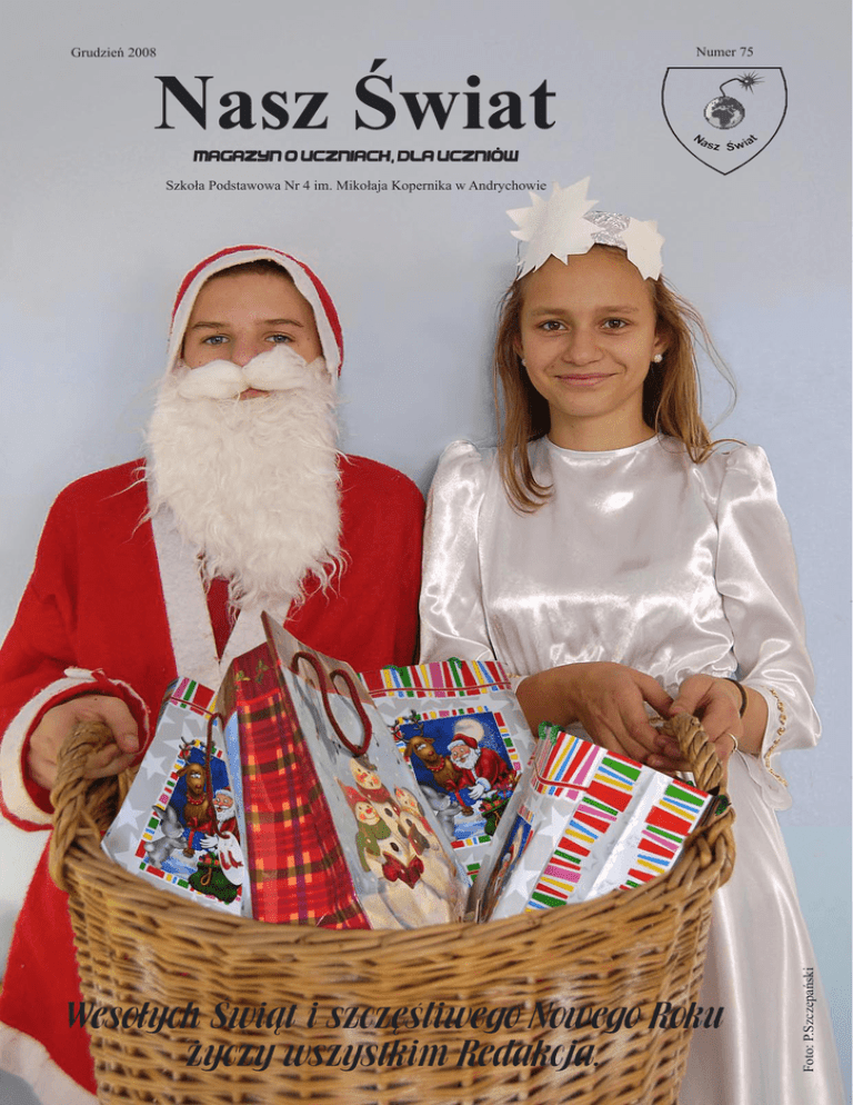 Grudzień 2008 Nasz Świat Numer 75 Magazyn o uczniach, dla uczniów Wesołych Świąt i szczęśliwego Nowego Roku życzy wszystkim Redakcja. Foto: P.Szczepański Szkoła Podstawowa Nr 4 im. Mikołaja Kopernika w Andrychowie Strona 2 Życzę wszystkiego najlepszego całej szkole! Dla Adriana Zielnskiego od Wielbicielki. Pozdro dla Kegla od Klęczara. „Nasz Świat” Dla taty Eryka Kruka z VId : Wesołych Świąt i Szczęśliwego Nowego Roku od Twojego dziecka. Pozdro dla Fludra od Wielbicielki. Dla P.Szczepańskiego i klasy Ve od Kamili Klimowskiej. Pozdrowienia i życzenia świąteczne dla P. Asi Beczali składają dziewczynki z Vb: Iza, Sara, Ela, Klaudia, Angela. Pozdro dla wszystkich z klasy 6E . Dla VIe od chłopaków z VId. Serdeczne pozdro! Pozdro dla całodobowej od całodobowego :} Pozdro dla Szemika od Tajemniczej Wielbicielki. Serdecznie pozdrawiam Panią Monikę Ligęzę Ve. Pozdro dla Klęczara. Życzenie dla Mateusz M., pani Wandy Tyralik i mojej rodziny od Wilkołaka. Wesołych Świąt dla przemiłej przyjaciółki Angeli Kizner. Tomasz Ruła dla Pana Piotra Szczepańskiego. Pozdrowienia dla klasy Ve. Pozdrowienia dla redakcji gazetki „Nasz Świat”. Pozdrowienia dla Damiana Klęczara od Wielbicielki. Wszystkiego najlepszego z okazji Świąt Bożego Narodzenia dla klasy Ve. Wesołych Świąt i Szczęśliwego Nowego Roku dla Klaudii. Dla Adriana Zielińskiego od kumpla. Pozdrowienia dla Kozy z klasy 6E. Pozdrowienia dla Pana Piotra od sklepiku. Wszystkiego dobrego na Nowy Rok 2009 dla klasy 4E. Wszystkiego dobrego na Nowy Rok 2009 i następny. Wszystkiego najlepszego, dużo zdrowia, szczęścia i pomyślności na Nowy Rok szkolny dla Pani Dyrektor. Dla Pani Kingi Góralczyk szczęśliwych świąt i udanego sylwestra. Dla Pani Wandy Tyralik od klasy Ve. Od klasy 5E życzenia dla wszystkich nauczycieli. Dla Katarzyny Piekarskiej. Dla Adriana Zielińskiego od Wielbicielki. Wszystkiego dobrego dla Pana Rafała Kadamusa od Anity Styły z klasy 6E. Życzę wszystkiego najlepszego z okazji Świąt Bożego Narodzenia. Dla Pana Biczaka od klasy v... Wesołych Świąt dla Magdy Talar życzy Wielbiciel. Wesołych Świąt i szczęśliwego Nowego Roku życzę wszystkim uczniom,nauczycielom oraz Pani Dyrektor. Pozdrowienia dla Sary Prochazki od kolegi z klasy VId. Pozdrowienia dla Izy i Sandry z VIe od Fludra. Pozdrowienia dla Oli z klasy Ve. Dla Martynki Wandor z kl. IVa. Pozdrowienia dla pana Piotra Szczepańskiego od Żanety M., Natalii K. i Eli G. z Ve. Nasz Świat Magazyn dla uczniów Red. nacz.: Piotr Szczepański Redaguje zespół uczniów SP 4 Skład: mgr Piotr Szczepański Druk: SP 4 w Andrychowie e-mail: [email protected] Dla dziewczyn z VIa na święta życzy chłopak z Vd. Pozdro dla Klęczara i Sary . Dla Martynki Wandor, Kasi Piekarskiej i Adriana Zielińskiego od kolegi z VId. Pozdro dla pana Piotra Szczepańskiego od Ve. Szkoła Podstawowa nr 4 im. Mikołaja Kopernika w Andrychowie ul. Włókniarzy 10 a telefon: 875 20 82 [email protected] http://www.sp4an.internetdsl.pl Życzenia dla Angeli, Izy, Eli i Sary od koleżanki Klaudii z Vb Dla Karola Jarosza z Vb z najszczerszymi życzeniami. Nowego szczęśliwego roku 2009 dla moich najlepszych przyjaciółek Klaudii, Eli, Izy, i Sary życzy Angela.