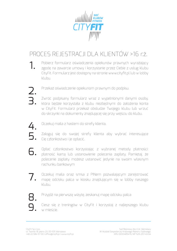 PROCES REJESTRACJI DLA KLIENTÓW >16 r.ż. 1. Pobierz formularz oświadczenia opiekunów prawnych wyrażający zgodę na zawarcie umowy i korzystanie przez Ciebie z usług klubu CityFit. Formularz jest dostępny na stronie www.cityfit.pl lub w lobby klubu. 2. 3. Przekaż oświadczenie opiekunom prawnym do podpisu. 4. 5. Oczekuj maila z hasłem do strefy klienta. 6. Opłać członkostwo korzystając z wybranej metody płatności: płatność kartą lub ustanowienie polecenia zapłaty. Pamiętaj, że polecenie zapłaty możesz ustanowić jedynie na swoim własnym rachunku bankowym 7. Oczekuj maila oraz smsa z PINem pozwalającym zarejstrować mapę odcisku palca w kiosku znajdującym się w lobby naszego klubu. 8. 9. Przyjdź na pierwszą wizytę, zeskanuj mapę odcisku palca Zwróć podpisany formularz wraz z wypełnionymi danymi osoby, która będzie korzystała z klubu niezbędnymi do założenia konta w CityFit. Formularz przekaż obsłudze Twojego klubu lub wrzuć do skrzynki na dokumenty znajdującej się przy wejściu do klubu. Zaloguj się do swojej strefy klienta aby wybrać interesujące Cię członkostwo i je opłacić. Ciesz się z treningów w CityFit i korzystaj z najlepszego klubu w mieście. CityFit Sp. z o.o. ul. Twarda 18, piętro 23, 00-105 Warszawa +48 22 584 57 00 | [email protected] | www.cityfit.pl Sąd Rejonowy dla m.st. Warszawy XII Wydział Gospodarczy Krajowego Rejestru Sądowego, KRS: 0000489476; NIP 525-257-43-64 MOJE DANE (WYPEŁNIJ DRUKOWANYMI LITERAMI) Adres e-mail Imię Nazwisko PESEL Telefon komórkowy Adres (ulica, numer domu, kod pocztowy) Oświadczam, iż zapoznałam/łem się i akceptuję Regulamin. Wyrażam zgodę na otrzymywanie wiadomości typu Newsletter w formie wiadomości e-mail i sms. Informujemy, że Administratorem Danych jest CityFit 24/7 Sp. z o.o., ul. Twarda 18, Warszawa, 00-105. Państwa dane osobowe będą przetwarzane wyłącznie w celu realizacji umowy, marketingowym (m.in. informowanie o konkursach, promocjach) oraz w celu wysyłki Newslettera, jeśli wyrazili Państwo na to odrębną zgodę. Bez Państwa wyraźnej zgody dane osobowe nie będą udostępniane odbiorcom danych. Przysługuje Państwu prawo dostępu do treści danych, możliwość ich poprawiania oraz wyrażenia sprzeciwu wobec przetwarzania danych osobowych w celach marketingowych. Zgody udzielają Państwo dobrowolnie. ........................................................................... (podpis Małoletniego) CityFit Sp. z o.o. ul. Twarda 18, piętro 23, 00-105 Warszawa +48 22 584 57 00 | [email protected] | www.cityfit.pl Sąd Rejonowy dla m.st. Warszawy XII Wydział Gospodarczy Krajowego Rejestru Sądowego, KRS: 0000489476; NIP 525-257-43-64 OŚWIADCZENIE RODZICA/OPIEKUNA PRAWNEGO/RODZICÓW/OPIEKUNÓW PRAWNYCH MAŁOLETNICH DZIECI KORZYSTAJĄCYCH Z KLUBU CITYFIT W WYBRANEJ LOKALIZACJI Ja/My niżej podpisany/i oświadczam/y, iż wyrażam/y zgodę na samodzielne korzystanie z Klubu CityFit przez moje/nasze małoletnie dziecko bez opieki osób dorosłych. Zapoznałem/Zapoznałam/Zapoznaliśmy się z regulaminem Klubu CityFit dostępnym na stronie www.cityfit.pl i zobowiązuję/zobowiązujemy się do przestrzegania jego zapisów zarówno przeze mnie/przez nas jak i moje/ nasze małoletnie dziecko. Jestem/śmy świadomy/i, iż Klub CityFit jest klubem samoobsługowym otwartym dla klientów 24 h 7 dni w tygodniu oraz że ćwiczenia wykonywane na jego terenie mogą okazać się niebezpieczne i przejmuję/emy odpowiedzialność za wszelkie wypadki i kontuzje wynikające z nieprzestrzegania zasad bezpieczeństwa i zasad korzystania z Klubu CityFit przez moje/nasze małoletnie dziecko. Oświadczam/y, iż moje/nasze małoletnie dziecko jest zdrowe i nie istnieją żadne przeciwwskazania do uprawiania przez nie ćwiczeń. Zdając sobie sprawę z możliwości kontuzji podczas uprawiania ćwiczeń w Klubie CityFit, przyjmuję/ emy do wiadomości że ubezpieczenie od następstw nieszczęśliwych wypadków powinniśmy wykupić we własnym zakresie. Zrzekam/y się wszelkich roszczeń prawnych względem CityFit, która jest właścicielem Klubu CityFit. Jednocześnie ja/my niżej podpisany/i wyrażam/y zgodę na zawarcie przez nasze małoletnie dziecko umowy na odległość z CityFit na korzystanie z usług Klubu CityFit. CityFit Sp. z o.o. ul. Twarda 18, piętro 23, 00-105 Warszawa +48 22 584 57 00 | [email protected] | www.cityfit.pl Sąd Rejonowy dla m.st. Warszawy XII Wydział Gospodarczy Krajowego Rejestru Sądowego, KRS: 0000489476; NIP 525-257-43-64 Oświadczam/y, że przejmuję/emy odpowiedzialność z tytułu ewentualnych szkód, powstałych w szczególności w związku z niewykonaniem lub nienależytym wykonaniem umowy oraz pokryję/emy bieżące zobowiązania wynikające z zawartej umowy przez moje/nasze małoletnie dziecko. …………………………………………………………….…………….…………….…………….………… Imię i nazwisko, data urodzenia małoletniego dziecka ……………………………………………………………….…………….…………….…………….……… Imię i nazwisko matki / prawnej opiekunki, PESEL: ………………………………………………………….…………….…………….…………….……………. Imię i nazwisko ojca / prawnego opiekuna, PESEL: Adres z kodem:………………………………………………………………………………………… Telefon Kontaktowy:…………………………………………………………………………………… Miejsce i data podpisania dokumentu ………………………………..……………………….. Informujemy, że Administratorem Danych jest CityFit Sp. z o.o., ul. Twarda 18, Warszawa, 00-105. Państwa dane osobowe będą przetwarzane wyłącznie w celu udokumentowania wyrażenia zgody na uczęszczanie małoletniego dziecka do Klubu CityFit. Bez Państwa wyraźnej zgody 