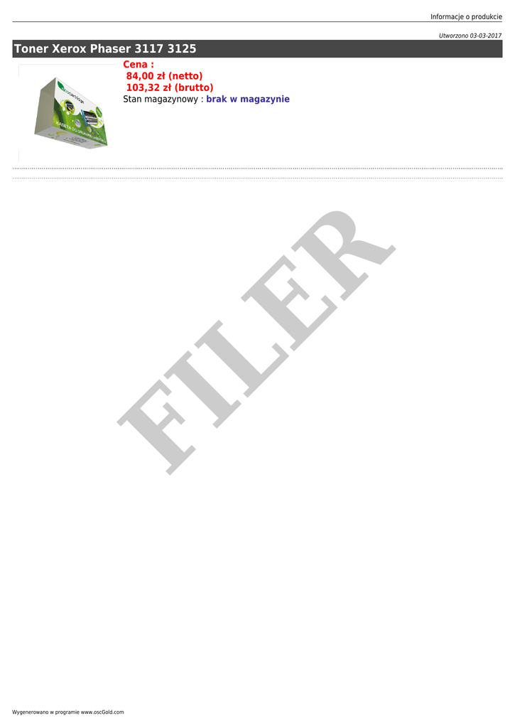 Informacje o produkcie Utworzono 03-03-2017 Toner Xerox Phaser 3117 3125 Cena : 84,00 zł (netto) 103,32 zł (brutto) FI LE R Stan magazynowy : brak w magazynie Wygenerowano w programie www.oscGold.com