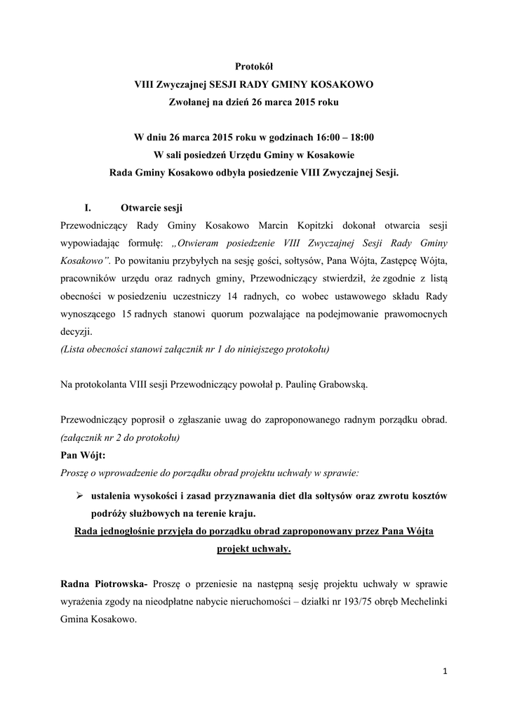 Protokół VIII Zwyczajnej SESJI RADY GMINY KOSAKOWO Zwołanej na dzień 26 marca 2015 roku W dniu 26 marca 2015 roku w godzinach 16:00 – 18:00 W sali posiedzeń Urzędu Gminy w Kosakowie Rada Gminy Kosakowo odbyła posiedzenie VIII Zwyczajnej Sesji. I. Otwarcie sesji Przewodniczący Rady Gminy Kosakowo Marcin Kopitzki dokonał otwarcia sesji wypowiadając formułę: „Otwieram posiedzenie VIII Zwyczajnej Sesji Rady Gminy Kosakowo”. Po powitaniu przybyłych na sesję gości, sołtysów, Pana Wójta, Zastępcę Wójta, pracowników urzędu oraz radnych gminy, Przewodniczący stwierdził, że zgodnie z listą obecności w posiedzeniu uczestniczy 14 radnych, co wobec ustawowego składu Rady wynoszącego 15 radnych stanowi quorum pozwalające na podejmowanie prawomocnych decyzji. (Lista obecności stanowi załącznik nr 1 do niniejszego protokołu) Na protokolanta VIII sesji Przewodniczący powołał p. Paulinę Grabowską. Przewodniczący poprosił o zgłaszanie uwag do zaproponowanego radnym porządku obrad. (załącznik nr 2 do protokołu) Pan Wójt: Proszę o wprowadzenie do porządku obrad projektu uchwały w sprawie: ustalenia wysokości i zasad przyznawania diet dla sołtysów oraz zwrotu kosztów podróży służbowych na terenie kraju. Rada jednogłośnie przyjęła do porządku obrad zaproponowany przez Pana Wójta projekt uchwały. Radna Piotrowska- Proszę o przeniesie na następną sesję projektu uchwały w sprawie wyrażenia zgody na nieodpłatne nabycie nieruchomości – działki nr 193/75 obręb Mechelinki Gmina Kosakowo. 1 Rada 4 głosami za, przy 9 głosach przeciw i 1 wstrzymującym się odrzuciła propozycję zmiany porządku obrad zaproponowaną przez Radną Piotrowską. Kto jest za przyjęciem porządku obrad wraz ze zmianami? Rada 12 głosami za, przy 2 głosach wstrzymujących się przyjęła porządek obrad wraz ze zmianami. II. Zatwierdzenie protokołu z VII Zwyczajnej Sesji Rady Gminy Kosakowo z dnia 27 lutego 2015 r. Radni nie wnieśli uwag, nie wyrazili woli odczytania protokołu. Radni jednogłośnie przyjęli protokół z VII Sesji Rady Gminy Kosakowo. III. Sprawozdanie Wójta Gminy Kosakowo z prac w okresie międzysesyjnym Radni otrzymali pisemne sprawozdanie z prac Wójta Gminy Kosakowo w okresie międzysesyjnym w dniach 28.02. – 26.03.2015 r. (załącznik nr 3 do protokołu) 16:10- na salę posiedzeń wchodzi radny Stankiewicz. Na sali posiedzeń obecnych 15 radnych. Radna Śliwińska- 17-19 marca- wyjazd do Brukseli w sprawie s-ki Port Lotniczy GdyniaKosakowo. Radny Fajks- Proszę ogólnie powiedzieć jak obecnie wygląda sytuacja z lotniskiem. Pan Wójt- Pojechaliśmy do Brukseli, aby ustalić stanowisko. Wnioski są takie, że mamy z Urzędem Ochrony Konkurencji i Konsumentów konsultować nasze propozycje. Wszystkie strony chcą abyśmy wypowiedzieli czynsz dzierżawy dla spółki lotniskowej. Nie godzimy się na to, musimy się nad tym zastanowić. Wniesiemy, aby rozliczenie było na koniec roku. W dniu dzisiejszym odbyła się rada nadzorcza lotniska. Po świętach chcemy zorganizować spotkanie przedstawicieli gminy Kosakowo, Gdyni, Pani Syndyk, Pana Prezesa Lotniska w celu wypracowania wspólnego stanowiska, co do dalszej działalność lotniska. Unia zmieniła swoje stanowisko- wycofała wymóg zwrotu 17 mln zł. 2 Radna Gloza- 26 marca- spotkanie z mecenasem Stażewskim w sprawie sądowej. Czy to było w sprawie lotniska? Pan Wójt- Nie. Sprawa dotyczy pracownika, który został zwolniony. Radny Majek- W sprawozdaniu są dwa punkty dotyczące żeglugi śródlądowej, czy mógłby Pan powiedzieć kilka słów na ten temat? Pan Wójt- Spotkali się przedstawiciele Jastarni, Władysławowa, gminy Puck, miasta Puck, gminy Kosakowo z producentem łodzi turystycznej, która może pływać po zatoce. Dzierżawa dwóch takich łodzi wynosiłaby 400 000 zł. Kursowałaby między Kosakowem, Puckiem, Jastarnią. Dyskutowaliśmy jak to miałoby wyglądać, ale ostatecznie nie doszliśmy do porozumienia ze względu na zbyt duże koszty. Radna Piotrowska- Mam jedno pytanie w sprawie dwóch umów udzielanych z wolnej ręki. Pierwsze w dniu 16 marca na pełnienie funkcji Inżyniera Kontraktu z nadzorem inwestorskim nad realizacją inwestycji pn. „Zagospodarowanie przystani rybackiej w Mechelinkach”. Druga 13 marca- Przebudowa nawierzchni drogi ul. Nadmorskiej w Mechelinkach. Następna sprawa dotyczy koncepcji przejścia w Pogórzu. Czy gmina posiada umowę z Powiatem na realizację tego przedsięwzięcia, ponieważ nie mamy w Wieloletniej Prognozie Finansowej zarezerwowanych środków na ten cel, a już została wybrana firma do opracowania takiej koncepcji za 22 140 zł. Pan Andrzej Klemenski - Sprawa z umową na inżyniera kontraktu jest to umowa na zamówienie uzupełniające wyświadczonej już usługi. W związku z udzieleniem zamówienia na wykonawstwo zastępcze, na dokończenie budowy przystani pływającej. Przedłużony został czas na wykonanie tego przedsięwzięcia. W związku z tym przedłużyliśmy czas na wykonanie umowy, a co za tym idzie ustaliliśmy dodatkowe wynagrodzenie dla inżyniera kontraktu. Dla przypomnienia powiem, że jest to funkcja, którą pełni wieloosobowy zespół ludzi. Są to inżynierowie, doradcy prawni, którzy wspomagają nas przy prowadzeniu tej inwestycji. Umowa do 15 maja. Umowa na przebudowę ul. Nadmorskiej jest to umowa udzielona w trybie zamówienia uzupełniającego firmie Marbud. Prawa i lewa cześć ul. Nadmorskiej będzie zagospodarowana, aż do pętli autobusowej włącznie. 3 Radna Piotrowska- Kiedy termin zakończenia? Pan Andrzej Klemenski- Koniec maja. Następne pytanie dotyczyło przejścia podziemnego. To przedsięwzięcie nie jest fragmentem inwestycji budowy drogi czy też ciągu komunikacyjnego na drogach powiatowych. Jest to cześć większego przedsięwzięcia, jakim jest przebudowa i rozbudowa szkoły podstawowej w Pogórzu. Przejście to ma za zadanie połączyć w jeden układ wewnęt
