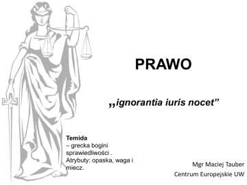 PRAWO „ignorantia iuris nocet” Temida – grecka bogini sprawiedliwości . Atrybuty: opaska, waga i miecz. Mgr Maciej Tauber Centrum Europejskie UW Pojęcie i Funkcje Prawa Prawo pozytywne v. prawo naturalne Kierunek pozytywistyczny Uznaje on, że prawem jest zespół norm (wypowiedzi o powinnym zachowaniu) ustanowionych i chronionych (sankcjonowanych) przez państwo posługujące się środkami przymusu. (A.Comte, J.Austin, H.Kelsen) Kierunek prawnonaturalny Zakłada, że prawo pozytywne nie jest wyłącznym ani najwyższym wzorem zachowań i że ludzie związani są także prawem naturalnym, normami lub choćby ideałami nie będącymi wytworem ludzkiego stanowienia. (św. Augustyn, św. Tomasz z Akwinu) Prawo w znaczeniu prawniczym Zespół reguł ustanowionych bądź uznanych przez odpowiednie organy państwa, wobec których posłuch zapewniony bywa w ostateczności dzięki przymusowi, jaki stosować może państwo. (sens przedmiotowy) Uprawnienia przyznawane obowiązujące akty prawne. (sens podmiotowy) jednostce przez Funkcje prawa • • • • • • • • • Stabilizacyjna – utrwalenie istniejącego ładu politycznego, gospodarczego itp. Dynamizacyjna – polega na promowaniu zmian w różnych sferach życia społecznego. Ochronna – prawo wspiera (chroni) rozmaite wartości istotne ze społecznego punktu widzenia. Organizacyjna – instytucjonalnych warunków życia społecznego i państwowego. Represyjna – prawo karze. Wychowawcza Kontrolna – poddanie zachowań ludzkich społecznej kontroli. Dystrybutywna – przyczyniania do rozdziału w społeczeństwie różnego rodzaju dóbr i ciężarów. Regulacja konfliktów – rezultatem działania prawa (przestrzegania i stosowania) jest rozstrzyganie sporów między ludźmi. Kulturotwórcza Dziedziny i gałęzie prawa Prawo materialne ogół norm regulujących treśd stosunków prawnych – obowiązki i uprawnienia podmiotów tych stosunków oraz ewentualnie określające sankcje za nieprzestrzeganie, niedopełnienie obowiązków lub przekroczenie granic uprawnieo. (prawo karne materialne, ujęte w zasadniczej części przez Kodeks Karny, prawo cywilne materialne, p. materialne administracyjne) Prawo formalne (zwane także procesowym) określa tryb postępowania przed organami władzy publicznej związanego z dochodzeniem uprawnień, egzekwowaniem obowiązków, stosowaniem sankcji ujętych w prawie materialnym. (Kodeks postępowania karnego, postępowania administracyjnego) Kodeks postępowania cywilnego, Kodeks Dziedziny i gałęzie prawa Inne kryteria kategoryzowania normy to: Prawo przedmiotowe ogół norm składających się na system prawa zarówno obowiązującego tu i teraz, jak też obowiązującego dawniej. W takim znaczeniu termin prawo pojawia się w takich zwrotach jak: prawo europejskie, zwyczajowe prawo francuskie XII w. itd. (Występuje również w węższym znaczeniu, na określenie zbioru norm mniejszego niż cały system, w odniesieniu do norm regulujących pewną sferę życia społecznego: polskie prawo karne, prawo o ruchu drogowym, prawo zobowiązao, prawo energetyczne. Takie prawo zazwyczaj obejmuje normy o charakterze zarówno materialnoprawnym oraz formalnoprawnym) Prawo podmiotowe zespół uprawnieo służących podmiotom prawa w ich wzajemnych relacjach. W tym znaczeniu: nabywamy prawo do emerytury, prawo obywatelskie, prawo własności. Prawo i wartości Prawo jest zjawiskiem kulturowym – budowane jest na gruncie pewnych wartości w celu ich realizacji i ochrony Wartości są zasadniczym elementem każdej kultury we wszystkich jej postaciach – artystycznej, moralnej, naukowej, politycznej, obyczajowej. Wartości przyjmowane w społeczeństwie kształtują nie tylko treść, formę i granice prawa. Uznanie pewnych stanów rzeczy lub przedmiotów za cenne (wartości) prowadzi ludzi do formułowania wzorów zachowań, uzasadniania oraz wspierania ich (obrony) w taki sposób, że wzory te stają się też częścią innych systemów normatywnych. Prawo nie jest bowiem jedynym społecznie wykorzystywanym regulatorem zachowań ludzkich. (normatywne i nienormatywne regulatory) Przepis prawny a norma prawna Norma prawna – to wypowiedź zawierająca żądanie władzy publicznej, aby w określonej sytuacji adresat podjął wyznaczone w niej działanie. Jest to zatem norma postępowania, która została ustanowiona przez kompetentne organy władzy publicznej. Przepis prawny – jednostka redakcyjna aktu prawnego wyraźnie wyodrębniona w formie artykułu lub paragrafu (gramatycznie – zdanie). Budowa normy prawej Trójelementowa koncepcja budowy normy prawnej: • Hipoteza – określa warunki zastosowania normy prawnej oraz jej adresata; • Dyspozycja – określa właściwy sposób zachowania się adresata w okolicznościach wskazanych w hipotezie (co zrobid by uniknąd sankcji); • Sankcja – określa negatywne następstwa, jakie spotkają adresata, jeśli zachowa się w sposób niezgodny z zasadą wyrażoną w dyspozycji. Rodzaje norm i sankcji Rodzaje norm prawnych podział ze względu na: Sposób wysłowienia: • Nakazujące • Zakazujące • Uprawniające Zakres stosowania: • Bezwzględnie obowiązujące – podmioty prawa nie mogą decydować, czy należy zastosować się do tych norm. • Względnie obowiązujące – są stosowane tylko wtedy, gdy podmioty prawa nie przyjęły innych reguł niż wyrażone w dyspozycji. Rodzaje sankcji Karne: • mają charakter represyjny i polegają na odebraniu lub ograniczeniu dostępu do dóbr uznawanych za cenne i pożądane (życia, majątku, wolności); • w polskim prawie kary dzieli się na zasadnicze i dodatkowe. Egzekucji: • polegają na zmuszeniu adresata nieprzestrzegającego normy prawnej do zrealizowania takiego stanu rzeczy, który istniałby, gdyby norma była przestrzegana. • Sankcje egzekucji mogą mieć postać: – – Zakres obowiązywania: • IUS COMMUNE – obowiązujące na obszarze całego państwa • IUS PAR