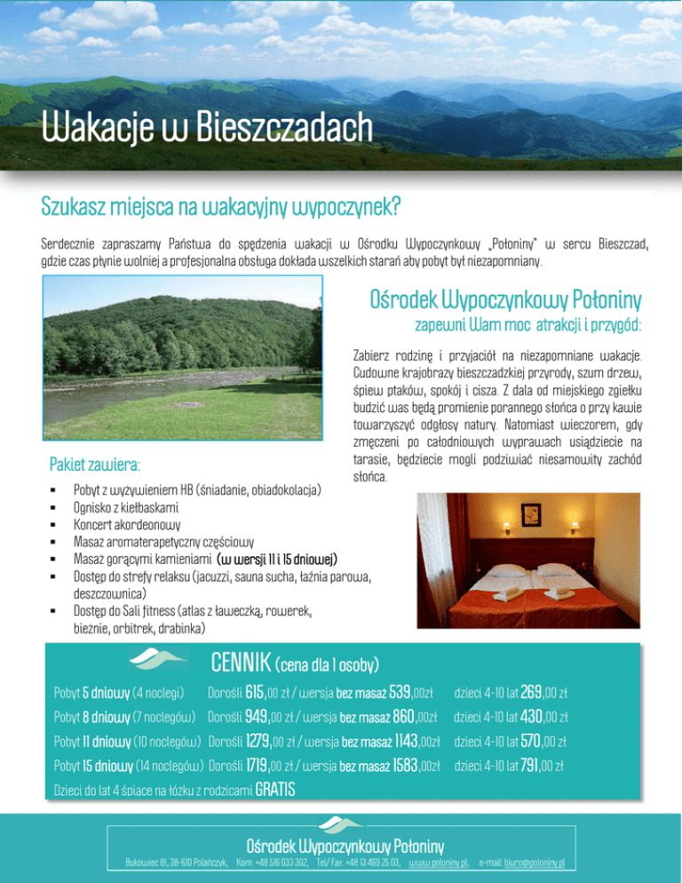 OW Połoniny – wyjątkowe miejsce w Bieszczadach Wakacje w Bieszczadach Szukasz miejsca na wakacyjny wypoczynek? Serdecznie zapraszamy Państwa do spędzenia wakacji w Ośrodku Wypoczynkowy „Połoniny” w sercu Bieszczad, gdzie czas płynie wolniej a profesjonalna obsługa dokłada wszelkich starań aby pobyt był niezapomniany. Ośrodek Wypoczynkowy Połoniny zapewni Wam moc atrakcji i przygód: Zabierz rodzinę i przyjaciół na niezapomniane wakacje. Cudowne krajobrazy bieszczadzkiej przyrody, szum drzew, śpiew ptaków, spokój i cisza. Z dala od miejskiego zgiełku budzić was będą promienie porannego słońca o przy kawie towarzyszyć odgłosy natury. Natomiast wieczorem, gdy zmęczeni po całodniowych wyprawach usiądziecie na tarasie, będziecie mogli podziwiać niesamowity zachód słońca. Pakiet zawiera: Pobyt z wyżywieniem HB (śniadanie, obiadokolacja) Ognisko z kiełbaskami Koncert akordeonowy Masaż aromaterapetyczny częściowy Masaż gorącymi kamieniami (w wersji 11 i 15 dniowej) Dostęp do strefy relaksu (jacuzzi, sauna sucha, łaźnia parowa, deszczownica) Dostęp do Sali fitness (atlas z ławeczką, rowerek, bieżnie, orbitrek, drabinka) CENNIK (cena dla 1 osoby) Dorośli 615,00 zł / wersja bez masaż 539,00zł dzieci 4-10 lat 269,00 zł Pobyt 8 dniowy (7 noclegów) Dorośli 949,00 zł / wersja bez masaż 860,00zł dzieci 4-10 lat 430,00 zł Pobyt 5 dniowy (4 noclegi) Pobyt 11 dniowy (10 noclegów) Dorośli 1279,00 zł / wersja bez masaż 1143,00zł dzieci 4-10 lat 570,00 zł Pobyt 15 dniowy (14 noclegów) Dorośli 1719,00 zł / wersja bez masaż 1583,00zł dzieci 4-10 lat 791,00 zł Dzieci do lat 4 śpiące na łóżku z rodzicami GRATIS Ośrodek Wypoczynkowy Połoniny Bukowiec 81, 38-610 Polańczyk, Kom: +48 516 033 302, Tel/ Fax: +48 13 469 25 03, www.poloniny.pl, e-mail: [email protected]