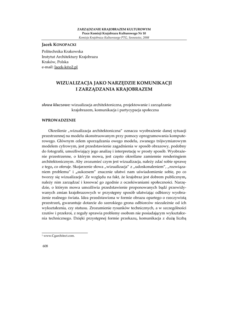 ZARZĄDZANIE KRAJOBRAZEM KULTUROWYM Prace Komisji Krajobrazu Kulturowego Nr 10 Komisja Krajobrazu Kulturowego PTG, Sosnowiec, 2008 Jacek KONOPACKI Politechnika Krakowska Instytut Architektury Krajobrazu Kraków, Polska e-mail: [email protected] WIZUALIZACJA JAKO NARZĘDZIE KOMUNIKACJI I ZARZĄDZANIA KRAJOBRAZEM słowa kluczowe: wizualizacja architektoniczna, projektowanie i zarządzanie krajobrazem, komunikacja i partycypacja społeczna WPROWADZENIE Określenie „wizualizacja architektoniczna” oznacza wyobrażenie danej sytuacji przestrzennej na modelu skonstruowanym przy pomocy oprogramowania komputerowego. Głównym celem sporządzania owego modelu, zwanego trójwymiarowym modelem cyfrowym, jest przedstawienie zagadnienia w sposób obrazowy, podobny do fotografii, umożliwiający jego analizę i interpretację w prosty sposób. Wyobrażenie przestrzenne, o którym mowa, jest często określane zamiennie renderingiem architektonicznym. Aby zrozumieć czym jest wizualizacja, należy zdać sobie sprawę z tego, co oferuje. Skojarzenie słowa „wizualizacja” z „udoskonaleniem”, „rozwiązaniem problemu” i „sukcesem” znacznie ułatwi nam uświadomienie sobie, po co tworzy się wizualizacje1. Ze względu na fakt, że krajobraz jest dobrem publicznym, należy nim zarządzać i kreować go zgodnie z oczekiwaniami społeczności. Narzędzie, o którym mowa umożliwia przedstawienie proponowanych bądź przewidywanych zmian krajobrazowych w przystępny sposób ułatwiając odbiorcy wyobrażenie realnego świata. Idea przedstawiona w formie obrazu opartego o rzeczywistą przestrzeń, gwarantuje dotarcie do szerokiego grona odbiorców niezależnie od ich wykształcenia, czy statusu. Zrozumienie rysunków technicznych, a w szczególności rzutów i przekroi, z reguły sprawia problemy osobom nie posiadającym wykształcenia technicznego. Dzięki przystępnej formie przekazu, komunikacja z dużą liczbą ________________________ 1 www.Cgarchitect.com. 608 osób z pozoru biernych, bądź niezainteresowanych „inwestycją”, staje się bezproblemowa, co więcej, zdarza się często, iż po obejrzeniu wizualizacji tej inwestycji, odbiorcy stają się jedną ze stron rozważającą zasadność jej powstania i włączają się w dyskusje na jej temat. Stopień partycypacji społecznej wynikający ze zrozumienia i zainteresowania zagadnieniem, przekłada się na decyzje związane z jakością krajobrazu. Różnego rodzaju symulacje krajobrazu pozwalają rozważać w sposób kompleksowy zagadnienia i zarządzać nimi2. Wizualizacje doskonale sprawdzają się w kwestiach widokowych, które często łączą się z estetyką form. Obraz jest jednym z najbardziej uniwersalnych narzędzi komunikacji pozwalających dotrzeć do populacji niezależnie od lokalizacji geograficznej, korzeni kulturowych i barier językowych. Siła wizualizacji, opiera się na przekazie graficznym. Ponieważ człowiek odbiera około 85% bodźców za pomocą narządu wzroku, przekaz informacji przy użyciu tego kanału jest bardzo dobry. Porównując różne sposoby przekazu informacji o krajobrazie należy stwierdzić, że najwyższą skuteczność uzyskuje się stosując obraz, a następnie wypowiedź ustną i tekst pisany. Istotnym zagadnieniem jest realizm wpływający na jakość wizualizacji, która ma bezpośredni związek z poziomem percepcji. Obserwując reakcję odbiorców należy stwierdzić następujący fakt: im wierniej wizualizacja oddaje rzeczywistość, tym więcej potencjalnych zainteresowanych zdoła ją odczytać i zinterpretować. Realizm daje wyobrażenie o planowanych przemianach danego miejsca. Ukazanie inwestycji w realnej skali, gamie kolorystycznej, z uwzględnieniem pór roku, kierunku padania światła wpływa znacząco na jej odbiór. Komunikowanie za pomocą obrazu, który wychodzi od strony projektanta daje doskonałe efekty. Uświadomienie "nowego" przychodzi łatwo w przyjemny do odbioru sposób, który nie jest absorbujący i pozwala na natychmiastowe, wręcz automatyczne ocenienie zasadności czy też jakości architektonicznej inwestycji. _____________________________ dr inż. Paweł Ozimek „Cyfrowe narzędzia do zarządzania przestrzenią miasta w zakresie bezpieczeństwa publicznego” –„W projekcie SURE rozwijana jest aplikacja pozwalająca na modelowanie zagospodarowania przestrzenie i optymalizowania jej ze względu na widoczność. Możliwość wzrokowej penetracji przestrzeni publicznej z miejsc aktywności ludzkiej ogranicza występowanie pewnych typów przestępstw pospolitych. Wyznaczanie map widoczności pozwala na: wskazania miejsc potencjalnie niebezpiecznych, bo ukrytych przed wzrokiem przypadkowych świadków. Celem aplikacji jest generowanie map widoczności z uwzględnieniem cykli czasowych, ponieważ w czasie dnia zmienia się intensywność użytkowania, a wraz z cyklami wegetacyjnymi zmienia się widoczność. Opisywana procedura wyznacza wykresy i mapy widoczności oparte na technikach renderingu komputerowego gdzie lokalne modele światła symulują punkty, z których badana jest widoczność. Danymi wprowadzanymi do systemu są: cyfrowy model badanej przestrzeni, baza danych na temat czasów i miejsc funkcjonowania aktywnego miejsca i dane dotyczące oświetlenia ulic. Procedura wykonuje renderingi w określonych punktach czasowych, które wizualizują zakres oddziaływania widokowego pojedynczego miejsca aktywności, zwanej jednostkowymi wykresami widoczności. Następnie składa wykresy jednostkowe w wykresy zbiorcze ukazujące stany widoczności z wszystkich miejsc aktywności funkcjonujących w danym momencie”. 2 609 Zarządzanie krajobrazem3 staje się łatwiejsze, gdy mamy do czynienia z jego trójwymiarową symulacją. Włączenie społeczności lokalnej w ten proces, gwarantuje uniknięcie konfliktu, jaki może powstać, gdy "nowe" pojawi się bez zapowiedzi i będzie zbyt ingerowało w atmosferę zwaną duchem miejsca. Społeczna dyskusja na