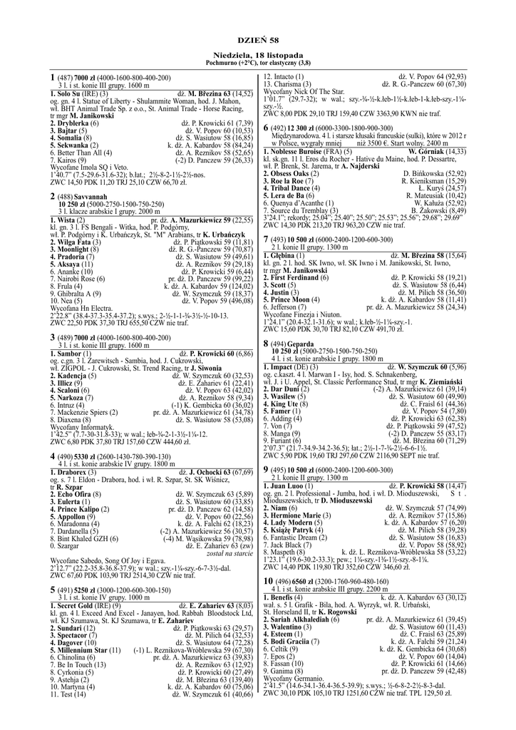 DZIEŃ 58 Niedziela, 18 listopada Pochmurno (+2°C), tor elastyczny (3,8) 1 (487) 7000 zł (4000-1600-800-400-200) 3 l. i st. konie III grupy. 1600 m 1. Solo Su (IRE) (3) dż. M. Březina 63 (14,52) og. gn. 4 l. Statue of Liberty - Shulammite Woman, hod. J. Mahon, wł. BHT Animal Trade Sp. z o.o., St. Animal Trade - Horse Racing, tr mgr M. Janikowski 2. Dryblerka (6) dż. P. Krowicki 61 (7,39) 3. Bajtar (5) dż. V. Popov 60 (10,53) 4. Somalia (8) dż. S. Wasiutow 58 (16,85) 5. Sekwanka (2) k. dż. A. Kabardov 58 (84,24) 6. Better Than All (4) dż. A. Reznikov 58 (52,65) 7. Kairos (9) (-2) D. Panczew 59 (26,33) Wycofane Imola SQ i Veto. 1’40.7” (7.5-29.6-31.6-32); b.łat.; 2½-8-2-1½-2½-nos. ZWC 14,50 PDK 11,20 TRJ 25,10 CZW 66,70 zł. 2 (488) Savvannah 10 250 zł (5000-2750-1500-750-250) 3 l. klacze arabskie I grupy. 2000 m 1. Wista (2) pr. dż. A. Mazurkiewicz 59 (22,55) kl. gn. 3 l. FS Bengali - Witka, hod. P. Podgórny, wł. P. Podgórny i K. Urbańczyk, St. "M" Arabians, tr K. Urbańczyk 2. Wilga Fata (3) dż. P. Piątkowski 59 (11,81) 3. Moonlight (8) dż. R. G.-Panczew 59 (70,87) 4. Pradoria (7) dż. S. Wasiutow 59 (49,61) 5. Aksaya (11) dż. A. Reznikov 59 (29,18) 6. Ananke (10) dż. P. Krowicki 59 (6,44) 7. Nairobi Rose (6) pr. dż. D. Panczew 59 (99,22) 8. Frula (4) k. dż. A. Kabardov 59 (124,02) 9. Ghibralta A (9) dż. W. Szymczuk 59 (18,37) 10. Nea (5) dż. V. Popov 59 (496,08) Wycofana Hn Electra. 2’22.8” (38.4-37.3-35.4-37.2); s.wys.; 2-½-1-1-¾-3½-½-10-13. ZWC 22,50 PDK 37,30 TRJ 655,50 CZW nie traf. 3 (489) 7000 zł (4000-1600-800-400-200) 3 l. i st. konie III grupy. 1600 m 1. Sambor (1) dż. P. Krowicki 60 (6,86) og. c.gn. 3 l. Zarewitsch - Sambia, hod. J. Cukrowski, wł. ZIGPOL - J. Cukrowski, St. Trend Racing, tr J. Siwonia 2. Kadencja (5) dż. W. Szymczuk 60 (32,53) 3. Illicz (9) dż. E. Zahariev 61 (22,41) 4. Scaloni (6) dż. V. Popov 63 (42,02) 5. Narkoza (7) dż. A. Reznikov 58 (9,34) 6. Intruz (4) (-1) K. Gembicka 60 (36,02) 7. Mackenzie Spiers (2) pr. dż. A. Mazurkiewicz 61 (34,78) 8. Diaxena (8) dż. S. Wasiutow 58 (53,08) Wycofany Informatyk. 1’42.5” (7.7-30-31.8-33); w wal.; łeb-¾-2-1-3½-1¼-12. ZWC 6,80 PDK 37,80 TRJ 157,60 CZW 444,60 zł. 4 (490) 5330 zł (2600-1430-780-390-130) 4 l. i st. konie arabskie IV grupy. 1800 m 1. Draborex (3) dż. J. Ochocki 63 (67,69) og. s. 7 l. Eldon - Drabora, hod. i wł. R. Szpar, St. SK Wiśnicz, tr R. Szpar 2. Echo Ofira (8) dż. W. Szymczuk 63 (5,89) 3. Eulerta (1) dż. S. Wasiutow 60 (33,85) 4. Prince Kalipo (2) pr. dż. D. Panczew 62 (14,58) 5. Appollon (9) dż. V. Popov 60 (22,56) 6. Maradonna (4) k. dż. A. Falchi 62 (18,23) 7. Dardanella (5) (-2) A. Mazurkiewicz 56 (30,57) 8. Bint Khaled GZH (6) (-4) M. Wąsikowska 59 (78,98) 0. Szargar dż. E. Zahariev 63 (zw) został na starcie Wycofane Sabedo, Song Of Joy i Egava. 2’12.7” (22.2-35.8-36.8-37.9); w wal.; szy.-1¼-szy.-6-7-3½-dal. ZWC 67,60 PDK 103,90 TRJ 2514,30 CZW nie traf. 5 (491) 5250 zł (3000-1200-600-300-150) 3 l. i st. konie IV grupy. 1000 m 1. Secret Gold (IRE) (9) dż. E. Zahariev 63 (8,03) kl. gn. 4 l. Exceed And Excel - Janayen, hod. Rabbah Bloodstock Ltd, wł. KJ Szumawa, St. KJ Szumawa, tr E. Zahariev 2. Sundari (12) dż. P. Piątkowski 63 (29,57) 3. Spectacor (7) dż. M. Pilich 64 (32,53) 4. Dagover (10) dż. S. Wasiutow 64 (72,28) 5. Millennium Star (11) (-1) L. Reznikova-Wróblewska 59 (67,30) 6. Chinolina (6) pr. dż. A. Mazurkiewicz 63 (39,83) 7. Be In Touch (13) dż. A. Reznikov 63 (12,92) 8. Cyrkonia (5) dż. P. Krowicki 60 (27,49) 9. Astehja (2) dż. M. Březina 63 (139,40) 10. Martyna (4) k. dż. A. Kabardov 60 (75,06) 11. Test (14) dż. W. Szymczuk 61 (40,66) 12. Intacto (1) dż. V. Popov 64 (92,93) 13. Charisma (3) dż. R. G.-Panczew 60 (67,30) Wycofany Nick Of The Star. 1’01.7” (29.7-32); w wal.; szy.-¾-½-k.łeb-1½-k.łeb-1-k.łeb-szy.-1¼szy.-½. ZWC 8,00 PDK 29,10 TRJ 159,40 CZW 3363,90 KWN nie traf. 6 (492) 12 300 zł (6000-3300-1800-900-300) Międzynarodowa. 4 l. i starsze kłusaki francuskie (sulki), które w 2012 r w Polsce, wygrały mniej niż 3500 €. Start wolny. 2400 m 1. Noblesse Buroise (FRA) (5) W. Górniak (14,33) kl. sk.gn. 11 l. Eros du Rocher - Hative du Maine, hod. P. Dessartre, wł. P. Brenk, St. Jarema, tr A. Najderski 2. Obsess Oaks (2) D. Bińkowska (52,92) 3. Roe la Roe (7) R. Kieniksman (15,29) 4. Tribal Dance (4) Ł. Kuryś (24,57) 5. Lera de Ba (6) R. Mateusiak (10,42) 6. Quenya d’Acanthe (1) W. Kałuża (52,92) 7. Source du Tremblay (3) B. Żakowski (8,49) 3’24.1”; rekordy; 25.04”; 25.40”; 25.50”; 25.53”; 25.56”; 29.68”; 29.69” ZWC 14,30 PDK 213,20 TRJ 963,20 CZW nie traf. 7 (493) 10 500 zł (6000-2400-1200-600-300) 2 l. konie II grupy. 1300 m 1. Głębina (1) dż. M. Březina 58 (15,64) kl. gn. 2 l. hod. SK Iwno, wł. SK Iwno i M. Janikowski, St. Iwno, tr mgr M. Janikowski 2. First Ferdinand (6) dż. P. Krowicki 58 (19,21) 3. Scott (5) dż. S. Wasiutow 58 (6,44) 4. Justin (3) dż. M. Pilich 58 (36,50) 5. Prince Moon (4) k. dż. A. Kabardov 58 (11,41) 6. Jefferson (7) pr. dż. A. Mazurkiewicz 58 (24,34) Wycofane Finezja i Niuton. 1’24.1” (20.4-32.1-31.6); w wal.; k.łeb-½-1¼-szy.-1. ZWC 15,60 PDK 30,70 TRJ 82,10 CZW 491,70 zł. 8 (494) Geparda 10 250 zł (5000-2750-1500-750-250) 4 l. i st. konie arabskie I grupy. 1800 m 1. Impact (DE) (3) dż. W. Szymczuk 60 (5,96) og. c.kaszt. 4 l. Marwan I - Isy, hod. S. Schnakenberg, wł. J. i U. Appel, St. Classic Performance Stud, tr mgr K. Ziemiański 2. Dar Duni (2) (-2) A. Mazurkiewicz 61 (39,14) 3. Wasilew (5) dż. S. Wasiutow 60 (49,90) 4. King Ute (8) dż. C. Fraisl 61 (44,36) 5. Famer (1) dż. V. Popov 54 (7,80) 6. Adding (4) dż. P. Krowicki 63 (62,38) 7. Von (7) dż. P. Piątkowski 59 (47,52) 8. Manga (9) (-2) D. Panczew 55 (83,17) 9. Furiant (6) dż. M. Březina 60 (71,29) 2’07.3” (21.7-34.9-34.2-36.5); łat.; 2½-1-7-¾-2½-6-6-1½. ZWC 5,90 PDK 19,60 TRJ 297,60 CZW 2116,90 SEPT nie traf. 9 (495) 10 500