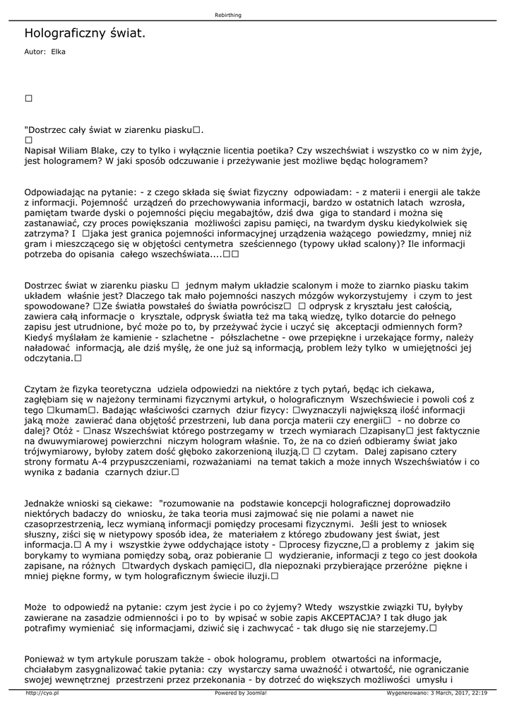 Rebirthing Holograficzny świat. Autor: Elka "Dostrzec cały świat w ziarenku piasku. Napisał Wiliam Blake, czy to tylko i wyłącznie licentia poetika? Czy wszechświat i wszystko co w nim żyje, jest hologramem? W jaki sposób odczuwanie i przeżywanie jest możliwe będąc hologramem? Odpowiadając na pytanie: - z czego składa się świat fizyczny odpowiadam: - z materii i energii ale także z informacji. Pojemność urządzeń do przechowywania informacji, bardzo w ostatnich latach wzrosła, pamiętam twarde dyski o pojemności pięciu megabajtów, dziś dwa giga to standard i można się zastanawiać, czy proces powiększania możliwości zapisu pamięci, na twardym dysku kiedykolwiek się zatrzyma? I jaka jest granica pojemności informacyjnej urządzenia ważącego powiedzmy, mniej niż gram i mieszczącego się w objętości centymetra sześciennego (typowy układ scalony)? Ile informacji potrzeba do opisania całego wszechświata.... Dostrzec świat w ziarenku piasku jednym małym układzie scalonym i może to ziarnko piasku takim układem właśnie jest? Dlaczego tak mało pojemności naszych mózgów wykorzystujemy i czym to jest spowodowane? Ze światła powstałeś do światła powrócisz odprysk z kryształu jest całością, zawiera całą informacje o krysztale, odprysk światła też ma taką wiedzę, tylko dotarcie do pełnego zapisu jest utrudnione, być może po to, by przeżywać życie i uczyć się akceptacji odmiennych form? Kiedyś myślałam że kamienie - szlachetne - półszlachetne - owe przepiękne i urzekające formy, należy naładować informacją, ale dziś myślę, że one już są informacją, problem leży tylko w umiejętności jej odczytania. Czytam że fizyka teoretyczna udziela odpowiedzi na niektóre z tych pytań, będąc ich ciekawa, zagłębiam się w najeżony terminami fizycznymi artykuł, o holograficznym Wszechświecie i powoli coś z tego kumam. Badając właściwości czarnych dziur fizycy: wyznaczyli największą ilość informacji jaką może zawierać dana objętość przestrzeni, lub dana porcja materii czy energii - no dobrze co dalej? Otóż - nasz Wszechświat którego postrzegamy w trzech wymiarach zapisany jest faktycznie na dwuwymiarowej powierzchni niczym hologram właśnie. To, że na co dzień odbieramy świat jako trójwymiarowy, byłoby zatem dość głęboko zakorzenioną iluzją. czytam. Dalej zapisano cztery strony formatu A-4 przypuszczeniami, rozważaniami na temat takich a może innych Wszechświatów i co wynika z badania czarnych dziur. Jednakże wnioski są ciekawe: "rozumowanie na podstawie koncepcji holograficznej doprowadziło niektórych badaczy do wniosku, że taka teoria musi zajmować się nie polami a nawet nie czasoprzestrzenią, lecz wymianą informacji pomiędzy procesami fizycznymi. Jeśli jest to wniosek słuszny, ziści się w nietypowy sposób idea, że materiałem z którego zbudowany jest świat, jest informacja. A my i wszystkie żywe oddychające istoty - procesy fizyczne, a problemy z jakim się borykamy to wymiana pomiędzy sobą, oraz pobieranie wydzieranie, informacji z tego co jest dookoła zapisane, na różnych twardych dyskach pamięci, dla niepoznaki przybierające przeróżne piękne i mniej piękne formy, w tym holograficznym świecie iluzji. Może to odpowiedź na pytanie: czym jest życie i po co żyjemy? Wtedy wszystkie związki TU, byłyby zawierane na zasadzie odmienności i po to by wpisać w sobie zapis AKCEPTACJA? I tak długo jak potrafimy wymieniać się informacjami, dziwić się i zachwycać - tak długo się nie starzejemy. Ponieważ w tym artykule poruszam także - obok hologramu, problem otwartości na informacje, chciałabym zasygnalizować takie pytania: czy wystarczy sama uważność i otwartość, nie ograniczanie swojej wewnętrznej przestrzeni przez przekonania - by dotrzeć do większych możliwości umysłu i http://cyo.pl Powered by Joomla! Wygenerowano: 3 March, 2017, 22:19 Rebirthing wiedzy? Oraz czym jest postać moja/twoja/? KTO rzuca ów hologram i gdzie jest prawdziwy świat którego odbiciem jest ten? No i oto są pytania, najciekawszym się być zdaje - a KTO rzuca ten hologram z TAM w TU i po co? Na podstawie artykułu z miesięcznika Świat nauki pt.: Czy jesteś hologramem? http://cyo.pl Powered by Joomla! Wygenerowano: 3 March, 2017, 22:19