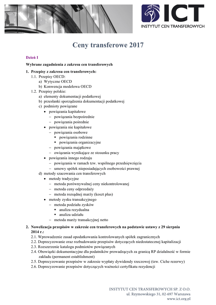 Ceny transferowe 2017 Dzień I Wybrane zagadnienia z zakresu cen transferowych 1. Przepisy z zakresu cen transferowych: 1.1. Przepisy OECD: a) Wytyczne OECD b) Konwencja modelowa OECD 1.2. Przepisy polskie: a) elementy dokumentacji podatkowej b) przesłanki sporządzenia dokumentacji podatkowej c) podmioty powiązane • powiązania kapitałowe - powiązania bezpośrednie - powiązania pośrednie • powiązania nie kapitałowe - powiązania osobowe § powiązania rodzinne § powiązania organizacyjne - powiązania majątkowe - owiązania wynikające ze stosunku pracy • powiązania innego rodzaju - powiązania w ramach tzw. wspólnego przedsięwzięcia - umowy spółek nieposiadających osobowości prawnej d) metody szacowania cen transferowych • metody tradycyjne - metoda porównywalnej ceny niekontrolowanej - metoda ceny odprzedaży - metoda rozsądnej marży (koszt plus) • metody zysku transakcyjnego - metoda podziału zysków § analiza rezydualna § analiza udziału - metoda marży transakcyjnej netto 2. Nowelizacja przepisów w zakresie cen transferowych na podstawie ustawy z 29 sierpnia 2014 r.: 2.1. Wprowadzenie zasad opodatkowania kontrolowanych spółek zagranicznych 2.2. Doprecyzowanie oraz rozbudowanie przepisów dotyczących niedostatecznej kapitalizacji 2.3. Rozszerzenie katalogu podmiotów powiązanych 2.4. Obowiązki dokumentacyjne dla podatników prowadzących za granicą RP działalność w formie zakładu (permanent establishment) 2.5. Doprecyzowanie przepisów w zakresie wypłaty dywidendy rzeczowej (tzw. Ciche rezerwy) 2.6. Doprecyzowanie przepisów dotyczących ważności certyfikatu rezydencji INSTYTUT CEN TRANSFEROWYCH SP. Z O.O. ul. Rzymowskiego 31, 02-697 Warszawa www.ict.org.pl 3. Nowe przepisy w ustawie o podatku dochodowym od osób prawnych od dnia 1 stycznia 2017 r. 3.1. Nowe przesłanki do ustalania obowiązku sporządzania dokumentacji podatkowej a) przekroczenie przychodów b) przekroczenie wartości transakcji c) identyfikacja podmiotów jako powiązane w trybie art.9a uCIT d) wartość transakcji wynikająca z umowy lub określona na fakturze lub po dokonanej /otrzymanej zapłacie 3.2. Nowa dokumentacja krajowa (ang. LOCAL FILE) – elementy: a) opis podatnika b) opis transakcji z podmiotami z grupy c) informacje finansowe podatnika 3.3. Nowa dokumentacja grupowa (ang. MASTER FILE) – elementy: a) struktura organizacyjna grupy b) polityka cen transferowych • przypisanie kosztów usług oraz sposobu wyznaczania wynagrodzenia za usługi świadczone między podmiotami powiązanymi w grupie • prace badawczo – rozwojowe • wynagrodzenie za korzystanie lub udostępnianie wartości niematerialnych • sposób finansowania działalności podmiotów w grupie, w szczególności kredytów, pożyczek, umów o zarządzaniu płynnością finansową oraz udzielonych lub udzielanych gwarancji. c) opis działalności prowadzonej przez grupę • istotne czynniki wpływające na osiągane zyski, w tym skala prowadzonej działalności grupy • informacja o dostawcach i odbiorcach – największych pod względem przychodów grupy produktów lub usług oraz produktów lub usług, stanowiących ponad 5% przychodów grupy • lista istotnych transakcji dotyczących usług, z wyłączeniem usług R&D, wraz z ich opisem • opis głównych rynków geograficznych dla produktów lub usług grupy (o których mowa w lit. b) • analiza funkcjonalna kluczowych funkcji, ryzyk i aktywów • opis dokonanych przeniesień (restrukturyzacja działalności) • opis zachodzących w danym roku istotnych fuzji i przejęć oraz zbycia inwestycji d) opis posiadanych, tworzonych, rozwijanych i wykorzystywanych w działalności przez grupę wartości niematerialnych • strategia grupy podmiotów powiązanych w zakresie opracowania, posiadania oraz wykorzystania wartości niematerialnych • lista wartości niematerialnych, wraz z informacją na temat własności prawnej tych wartości • lista istotnych umów lub porozumień między podmiotami w grupie dotyczących wartości niematerialnych • informacje na temat zmian właściciela prawnego lub ekonomicznego praw własności, w tym wskazanie kraju ich siedziby oraz wypłaconego z tego tytułu wynagrodzenia lub kompensaty e) opis sytuacji finansowej pomiędzy podmiotami tworzącymi grupę, zawierający w szczególności sporządzone sprawozdanie skonsolidowane podmiotów tworzących grupę INSTYTUT CEN TRANSFEROWYCH SP. Z O.O. ul. Rzymowskiego 31, 02-697 Warszawa www.ict.org.pl f) opis porozumień zawartych w sprawach CIT z administracjami innych państw, w szczególności APA 3.4. Obowiązek przygotowywania analizy danych porównawczych a) omówienie zasad korzystania z baz danych • bazy danych dla transakcji materialnych • bazy danych da transakcji własności intelektualnej i prawnej • bazy danych dla transakcji usługowych • bazy danych dla transakcji finansowych 3.5. Obowiązek składania oświadczeń przez zarząd o sporządzeniu dokumentacji podatkowej wraz z zeznaniem rocznym CIT-8 3.6. Obowiązek przygotowywania informacji podatkowych CIT-TP/PIT-TP 3.7 Obowiązek raportowania wg krajów (country-by country reporting) 4. Transakcje finansowe – ryzyka podatkowe i formuły optymalizacji podatkowej 4.1. Pożyczki wewnątrzgrupowe 4.2. Cash pooling 4.3. Gwarancje/poręczenia bankowe 4.4. Niedostateczna kapitalizacja 4.5. Pożyczki fasadowe 4.6. Pożyczki równoległe 5. Transakcje niematerialne – ryzyka podatkowe i formuły optymalizacji podatkowej 5.1. Opłaty licencyjne 5.2. Umowy o repartycji kosztów (ang. Cost Contribution Arrangements) 5.3. Umowy produkcji kontraktowej (ang. Contract Manufacturing) 5.3. Usługi zarządcze 5.4. Transakcje zagregowane 5.5. Sprzedaż udziałów 5.6. Refakturowanie 6. Zakład (ang. permanent establishment) 7. Podatkowa grupa kapitałowa na gruncie przepisów o cenach transferowych 7.1. Warunki do utworzenia PGK 7.2. Preferencje podatkowe dla PGK 8. Ceny transferowe na gruncie