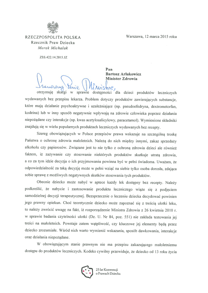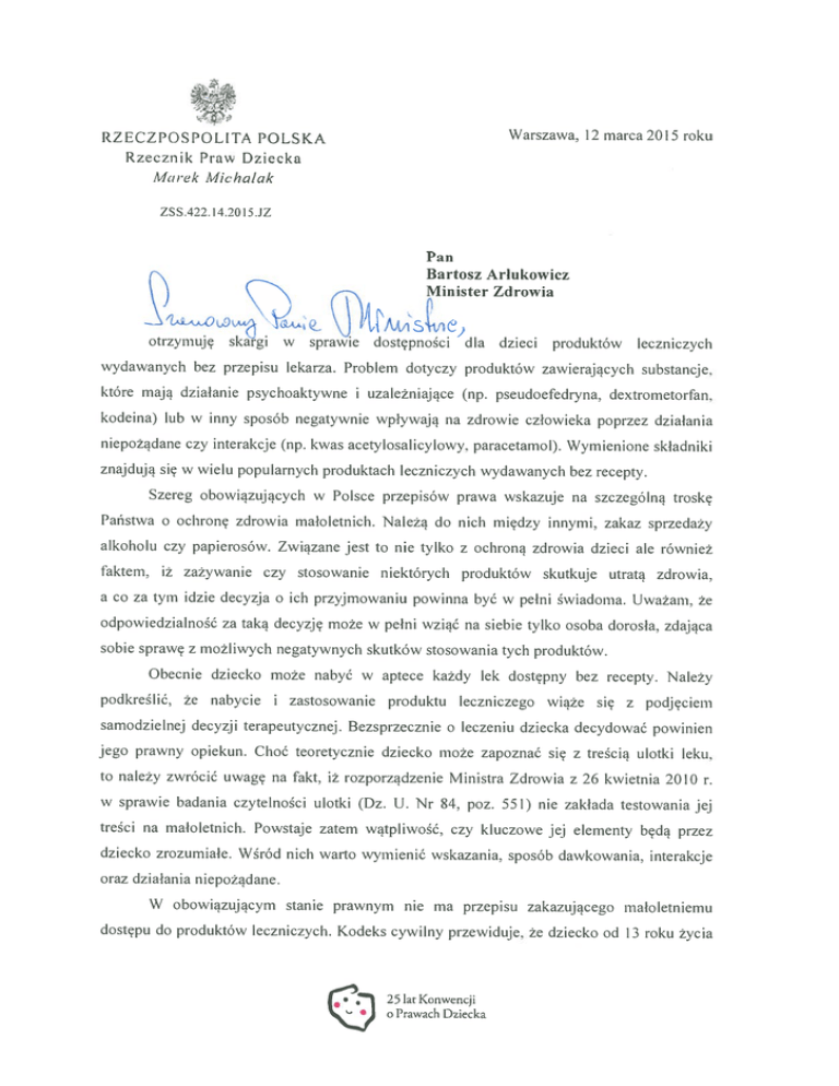 Warszawa. 12 marca 2015 roku RZECZPOSPOLITA POLSKA Rzecznik Praw Dziecka Mćz;ek Mielia/cik ZSS.422. 14.201 5.JZ Pan Bartosz Arłukowicz Minister Zdrowia otrzymuję skrgi w sprawie dostępności dla dzieci produktów leczniczych wydawanych bez przepisu lekarza. Problem dotyczy produktów zawierających substancje. które mają działanie psychoaktywne i uzależniające (np. pseudoefedryna, dextrometorfan, kodeina) lub w inny sposób negatywnie wpływają na zdrowie człowieka poprzez działania niepożądane czy interakcje (np. kwas acetylosalicylowy. paracetamol). Wymienione składniki znajdują się w wielu popularnych produktach leczniczych wydawanych bez recepty. Szereg obowiązujących w Polsce przepisów prawa wskazuje na szczególną troskę Państwa o ochronę zdrowia małoletnich. Należą do nich między innymi, zakaz sprzedaży alkoholu czy papierosów. Związane jest to nie tylko z ochroną zdrowia dzieci ale również faktem. iż zażywanie czy stosowanie niektórych produktów skutkuje utratą zdrowia. a co za tym idzie decyzja o ich przyjmowaniu powinna być w pełni świadoma. Uważam, że odpowiedzialność za taką decyzję może w pełni wziąć na siebie tylko osoba dorosła, zdąjąca sobie sprawę z możliwych negatywnych skutków stosowania tych produktów. Obecnie dziecko może nabyć w aptece każdy lek dostępny bez recepty. Należy podkreślić, że nabycie i zastosowanie produktu leczniczego wiąże się z podjęciem samodzielnej decyzji terapeutycznej. Bezsprzecznie o leczeniu dziecka decydować powinien jego prawny opiekun. Choć teoretycznie dziecko może zapoznać się z treścią ulotki leku, to należy zwrócić uwagę na fakt, iż rozporządzenie Ministra Zdrowia z 26 kwietnia 2010 r. w sprawie badania czytelności ulotki (Dz. U. Nr 84. poz. 551) nie zakłada testowania jej treści na małoletnich. Powstaje zatem wątpliwość, czy kluczowe jej elementy będą przez dziecko zrozumiałe. Wśród nich warto wymienić wskazania, sposób dawkowania, interakcje oraz działania niepożądane. W obowiązującym stanie prawnym nie ma przepisu zakazującego małoletniemu dostępu do produktów leczniczych. Kodeks cywilny przewiduje, że dziecko od 13 roku życia • 25 lat Konwencji o Prawach Dziecka może bez zgody prawnych opiekunów zawierać umowy powszechnie zawierane w drobnych bieżących sprawach życia codziennego. W stosunku do małoletniego poniżej 13 roku życia. który nie posiada zdolności do czynności prawnych, ustawodawstwo nie przewiduje ograniczeń w dostępie do leków bez recepty. Wypada podkreślić, że wydawanie leków w aptece nie jest zwykłą umową kupna-sprzedaży tylko wiąże się z decyzją w zakresie leczenia. Okoliczności, w których farmaceuta może odmówić sprzedaży leku, nie wyczerpują potrzeb zabezpieczenia zdrowotnego mało letnich. Dodatkowo należy podkreślić, że zgodnie z obowiązującym prawem nie jest możliwe korzystanie przez małoletnicli ze świadczeń opieki zdrowotnej bez zgody prawnego opiekuna. Natomiast bez zgody tego samego opiekuna prawnego, małoletni może zakupić produkt leczniczy. Dostrzegai-n również istotne powiązanie problemu dostępności leków bez recepty z kwestią zapobiegania narkomanii. Dostępne są obecnie bez ordynacji lekarskiej (a zatem dostępne dla małoletnich) preparaty zawierające, dextrometofran, pseudoefedryna, chlorowodorek ksylometazoliny czy nawet chlorowodorek benzydaminy. O ile zagadnienie to może być uregulowane w ramach ustawy o zapobieganiu narkomanii, o tyle kwestia innych leków, niepowodujących uzależnienia wymaga dodatkowej regulacji. Powyższe spostrzeżenia prowadzą do wniosku, że dzieci nie są wystarczająco chronione przed skutkami, które może wywołać dostęp i zażywanie produktów leczniczych wydawanych bez wskazań lekarza. Sądzę. że pozostawienie dziecku całkowitej swobody w nabywaniu produktów leczniczych jest niewłaściwe, bowiem przerzuca na małoletniego odpowiedzialność za skutki ich zażcia. jednocześnie pozbawiając wpływu na tę decyzję opiekunów prawnych czy lekarza. Taką decyzję może podjąć i wziąć za nią pełną odpowiedzialność jedynie osoba dorosła, bowiem dziecko nie ma świadomości wystąpienia działań niepożądanych oraz skutków ubocznych. Bezsprzecznie o leczeniu dziecka decydować powinien jego prawny opiekun. Mając powyższe na uwadze, na podstawie art. li ust. I ustawy z 6 stycznia 2000 r. o Rzeczniku Praw Dziecka (Dz. U. Nr 6, poz. 69 ze zm.) zwracam się do Pana Ministra o analizę zgłoszonego problemu i opracowanie propozycji jego rozwiązania. C