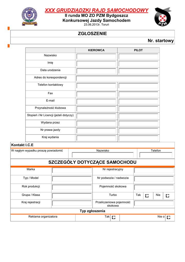 XXX GRUDZIĄDZKI RAJD SAMOCHODOWY II runda MO ZO PZM Bydgoszcz Konkursowej Jazdy Samochodem 23.06.2013r. Toruń ZGŁOSZENIE Nr. startowy KIEROWCA PILOT Nazwisko Imię Data urodzenia Adres do korespondencji Telefon kontaktowy Fax E-mail Przynależność klubowa Stopień i Nr Licencji (jeżeli dotyczy) Wydana przez Nr prawa jazdy Kraj wydania Kontakt I.C.E W nagłym wypadku proszę powiadomić Nazwisko Telefon SZCZEGÓŁY DOTYCZĄCE SAMOCHODU Marka Nr rejestracyjny Typ / Model Nr podwozia / nadwozia Rok produkcji Pojemność skokowa Grupa / Klasa Turbo Kraj rejestracji Przeliczeniowa pojemność skokowa Tak Nie Typ zgłoszenia Reklama organizatora Tak Nie o WPISOWE Aby zgłoszenie było ważne należy do niego dołączyć potwierdzenie wpłaty właściwej kwoty na konto organizatora, tj. przekaz bankowy, potwierdzenie przelewu bankowego itp. dla uczestników zrzeszonych w klubach PZM z aktualnie opłaconą składką na 2013r. z reklamą dodatkową organizatora Wysokość wpisowego w terminie: Termin 1: od 10/06/2013 do: 19/06/2013, 24h:00 100,00 PLN Termin 2: od 20/06/2013 do: 23/06/2013, 09h:00 130,00 PLN dla uczestników nie zrzeszonych w klubach PZM z reklamą dodatkową organizatora Wysokość wpisowego w terminie: Termin 1: od 10/06/2013 do: 19/06/2013, 24h:00 170,00 PLN Przelew bankowy (obowiązkowo dowód nadania) Termin 2: od 20/06/2013 do: 23/06/2013, 09h:00 200,00 PLN Czeki nie są akceptowane. Numer konta bankowego 58 1160 2202 0000 0000 5530 5571 OŚWIADCZENIE Wyrażam zgodę na gromadzenie i przetwarzanie moich danych osobowych przez Organizatora i PZM na potrzeby zawodów, zgodnie z Ustawą z dnia 29.08.1997r. o ochronie danych osobowych (Dz.U. 2002r. Nr 101 poz. 926 z późn.zm.). Przez sam fakt podpisu na formularzu zgłoszeniowym uczestnik jak również wszyscy członkowie jego ekipy przyjmują tym samym bez zastrzeżeń przepisy Regulaminu Standardowego i Uzupełniającego jak i wszystkich załączników i uzupełnień do imprez KJS i uznają jako jedyne władze te, które zostały ustalone przez PZM. Jednocześnie uczestnicy oświadczają, iż biorą udział w imprezie na własne ryzyko, przejmują na siebie pełną odpowiedzialność za powstałe z ich winy szkody, a tym samym zrzekają się wszelkich roszczeń w stosunku do Organizatora. Kierowca oświadcza: - że posiada aktualne ubezpieczenie NNW i OC oraz, * * - że nie posiada licencji kierowcy w rozumieniu regulaminów sportowych PZM (w razie zgłoszenia się kierowcy z licencją skreślić) Data i miejsce Podpis Kierowcy Podpis Pilota FAKTURA VAT Nazwa firmy: Ulica, numer: Kod pocztowy: Miejscowość: Kraj: NIP: Potwierdzenie wpłaty: Załącz plik potwierdzający wpłatę.