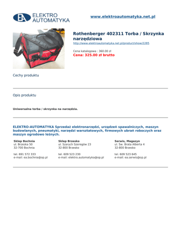 www.elektroautomatyka.net.pl Rothenberger 402311 Torba / Skrzynka narzędziowa http://www.elektroautomatyka.net.pl/product/show/2285 Cena katalogowa : 360.00 zł Cena: 325.00 zł brutto Cechy produktu Opis produktu Uniwersalna torba / skrzynka na narzędzia. ELEKTRO-AUTOMATYKA Sprzedaż elektronarzędzi, urządzeń spawalniczych, maszyn budowlanych, pneumatyki, narzędzi warsztatowych, firmowych ubrań roboczych oraz maszyn ogrodowo leśnych. Sklep Bochnia ul. Brzeska 50 32-700 Bochnia Sklep Brzesko ul. Szarych Szeregów 23 32-800 Brzesko Serwis, Magazyn ul. Św. Brata Alberta 4 32-800 Brzesko tel. 691 572 333 e-mail: [email protected] tel. 609 523 230 e-mail: [email protected] tel. 609 523 645 e-mail: [email protected]