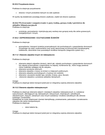 02.20.Z Pozyskiwanie drewna Podklasa ta obejmuje pozyskiwanie: • drewna i innych produktów leśnych na cele opałowe W wyniku tej działalności powstają drewno użytkowe, zrębki lub drewno opałowe. Wytwarzanie i zaopatrywanie w parę wodną, gorącą wodę i powietrze do układów klimatyzacyjnych 35.30.Z Podklasa ta obejmuje: • produkcję, gromadzenie i dystrybucję pary wodnej oraz gorącej wody dla celów grzewczych, energetycznych i innych, 37.00.Z ODPROWADZANIE I OCZYSZCZANIE ŚCIEKÓW Podklasa ta obejmuje: • gromadzenie i transport ścieków przemysłowych lub pochodzących z gospodarstw domowych od jednego lub wielu użytkowników oraz wody deszczowej za pomocą sieci kanalizacyjnej, kolektorów, zbiorników oraz pozostałych środków transportu (wagonów-cystern itp.), 38.11.Z Zbieranie odpadów innych niż niebezpieczne Podklasa ta obejmuje: • • • • • • zbieranie stałych odpadów (śmieci), takich jak: odpady pochodzące z gospodarstw domowych lub odpady przemysłowe z pojemników na odpady, kontenerów itp., które mogą zawierać różne materiały nadające się do odzysku, zbieranie surowców wtórnych, zbieranie odpadów z koszy na śmieci w miejscach publicznych, zbieranie odpadów pochodzących z budowy lub rozbiórki, zbieranie i usuwanie resztek typu zarośla, krzewy, gruz, tłuczeń, zbieranie odpadów z produkcji zakładów tekstylnych. Uwaga: Podklasa ta obejmuje także transport jeżeli jest on integralną częścią zbierania odpadów. 38.12.Z Zbieranie odpadów niebezpiecznych Podklasa ta obejmuje zbieranie stałych i niestałych odpadów niebezpiecznych, tj. substancji wybuchowych, utleniających się, łatwopalnych, toksycznych, drażniących, szkodliwych, rakotwórczych, żrących, zakaźnych oraz innych substancji i środków szkodliwych dla zdrowia ludzkiego i środowiska. Działalność ta może obejmować również identyfikację, przetwarzanie, pakowanie i oznakowanie odpadów dla celów transportowych. Podklasa ta obejmuje: o stare baterie itp., Uwaga: Podklasa ta obejmuje także transport jeżeli jest on integralną częścią zbierania odpadów. 38.21.Z - Obróbka i usuwanie odpadów innych niż niebezpieczne Sekcja ta obejmuje: - gospodarowanie (włączając gromadzenie, przetwarzanie oraz usuwanie) różnymi formami odpadów, takimi jak stałe i niestałe odpady przemysłowe czy pochodzące z gospodarstw domowych 38.32.Z Odzysk surowców z materiałów segregowanych Podklasa ta obejmuje • oddzielanie i sortowanie surowców nadających się do ponownego przetworzenia pochodzących z odpadów innych niż niebezpieczne (tj. śmieci) lub oddzielanie i sortowanie, w różne kategorie różnorodnych surowców takich jak: papier, tworzywa sztuczne, puszki po napojach, metal, nadających się do przetworzenia czy odzysku. Proces przetworzenia mechanicznego lub chemicznego odpadów przykładowo obejmuje: • • • • • • • • • • • • mechaniczne zgniatanie metalowych przedmiotów, takich jak: stare samochody, rowery, niesprawne pralki itp., mechaniczne zmniejszanie dużych elementów stalowych, takich jak wagony kolejowe, rozdrabianie odpadów metalowych, złomowanych samochodów itp., cięcie, prasowanie odpadów w celu zmniejszenia objętości, odzyskiwanie metali z odpadów fotograficznych, np. z utrwalaczy, kliszy i papieru fotograficznego, odzyskiwanie gumy, np. ze zużytych opon, w celu wytworzenia surowców wtórnych, sortowanie i granulowanie tworzyw sztucznych w celu uzyskania surowców wtórnych do produkcji rur, doniczek do kwiatów, palet itp., przetwarzanie (poprzez oczyszczanie, stapianie, rozdrabnianie) na granulat odpadów z tworzyw sztucznych i gumy, zgniatanie, czyszczenie i sortowanie szkła, zgniatanie, czyszczenie i sortowanie pozostałych odpadów, takich jak odpady z rozbiórki w celu uzyskania surowców wtórnych, przetwarzanie na surowce wtórne zużytych olejów i tłuszczy spożywczych, przetwarzanie na surowce wtórne pozostałych odpadów pochodzących z żywności, napojów, wyrobów tytoniowych i innych pozostałości. 42.11.Z Roboty związane z budową dróg i autostrad Podklasa ta obejmuje: • roboty nawierzchniowe na autostradach, ulicach, drogach, mostach, wiaduktach lub w tunelach: o układanie nawierzchni bitumicznych na drogach, o malowanie oznakowania poziomego i pozostałych oznaczeń na drogach itp., o instalowanie barier drogowych, znaków drogowych itp., 43.21.Z Roboty związane z budową rurociągów przesyłowych i sieci rozdzielczych Podklasa ta obejmuje wykonywanie instalacji elektrycznych we wszelkiego rodzaju budynkach i budowlach, takich jak: , • instalacje oświetleniowe, włączając oświetlenie ulic, *ZUK wykonuje oświetlenia świąteczne w mieście tzn. montaż na lampach ulicznych , dekoracja fontanny, choinki przed urzędem. 49.39.Z Pozostały transport lądowy pasażerski, gdzie indziej niesklasyfikowany Podklasa ta obejmuje: • transport drogowy pasażerski pozostały, taki jak: o wynajem autobusów z kierowcą, przewozy wycieczkowe i turystyczne oraz inne okazjonalne przewozy autobusowe kursujące bez ustalonego rozkładu, . 68.20.Z Wynajem i zarządzanie nieruchomościami własnymi lub dzierżawionymi Podklasa ta obejmuje: • wynajem i zarządzanie nieruchomościami własnymi lub dzierżawionymi, takimi jak: o budynki niemieszkalne, włączając obiekty wystawowe, magazyny, włącznie z przeznaczonymi na użytek handlu hurtowego artykułami rolno-spożywczymi umożliwianego przez rolno-spożywcze rynki hurtowe, 81.10.Z Działalność pomocnicza związana z utrzymaniem porządku w budynkach budynkach Podklasa ta obejmuje działalność pomocniczą związaną z utrzymywaniem porządku w budynkach klienta, poprzez: • wywóz śmieci Działalności pomocnicze związane z utrzymaniem porządku w budynkach wykonywane są przez personel, który nie jest zaangażowany, ani odpowiedzialny za istotne sprawy czy działalność klienta. 81.29.Z Pozostałe sprz