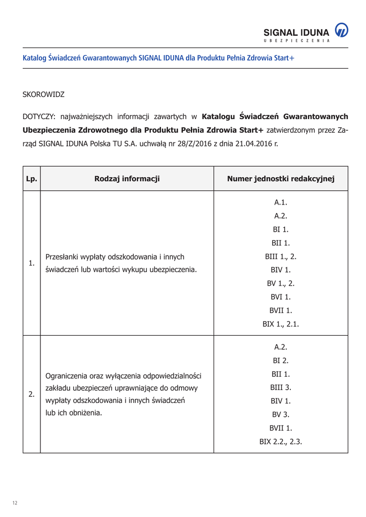 Katalog Świadczeń Gwarantowanych SIGNAL IDUNA dla Produktu Pełnia Zdrowia Start+ SKOROWIDZ DOTYCZY: najważniejszych informacji zawartych w Katalogu Świadczeń Gwarantowanych Ubezpieczenia Zdrowotnego dla Produktu Pełnia Zdrowia Start+ zatwierdzonym przez Zarząd SIGNAL IDUNA Polska TU S.A. uchwałą nr 28/Z/2016 z dnia 21.04.2016 r. Lp. Rodzaj informacji Numer jednostki redakcyjnej A.1. A.2. BI 1. BII 1. 1. Przesłanki wypłaty odszkodowania i innych świadczeń lub wartości wykupu ubezpieczenia. BIII 1., 2. BIV 1. BV 1., 2. BVI 1. BVII 1. BIX 1., 2.1. A.2. BI 2. 2. Ograniczenia oraz wyłączenia odpowiedzialności BII 1. zakładu ubezpieczeń uprawniające do odmowy BIII 3. wypłaty odszkodowania i innych świadczeń BIV 1. lub ich obniżenia. BV 3. BVII 1. BIX 2.2., 2.3. 12 A. WPROWADZENIE III. Badania diagnostyczne 1. SIGNAL IDUNA zobowiązuje się do organizacji i dostarczenia Świadczeń Medycznych wymienionych w Katalogu Świadczeń Gwarantowanych SIGNAL IDUNA dla produktu PZS+. 2. Call Center jest dostępne 24 godziny na dobę, 7 dni w tygodniu. Ubezpieczony wykorzystując Cali Center zobowiązany jest do zgłoszenia zamiaru skorzystania ze świadczeń medycznych objętych umową ubezpieczenia i uzyskania autory zacji SIGNAL IDUNA. 3. Ubezpieczenie obejmuje, niezbędne z medycznego punktu widzenia, usługi me dyczne, badania, leczenie i profilaktykę takie jak: I. Konsultacje specjalistyczne II. Refundowane wizyty domowe pediatryczne III. Badania diagnostyczne IV. Badania obrazowe V. Specjalistyczne lekarskie zabiegi ambulatoryjne VI. Ambulatoryjne zabiegi pielęgniarskie VII. Szczepienie p/grypie sezonowej dla osób dorosłych VIII. Badania Kontrolne IX. Leczenie szpitalne 1. Badania diagnostyczne to konieczne z medycznego punktu widzenia badania, niezbędne do zdiagnozowania stanu zdrowotnego, monitorowania leczenia i/lub ustalenia właściwego postępowania terapeutycznego. 2. Usługi medyczne w zakresie badań diagnostycznych przeprowadzane są na podstawie ważnego skierowania, wystawionego przez lekarza w przypadkach uzasadnionych ich wykonanie aktualnym stanem zdrowia Ubezpieczonego lub w celu wykonania badań profilaktycznych, zgodnie z aktualnie obowiązującą wiedzą medyczną. 3. Skierowanie lekarskie jest ważne pod warunkiem, że wystawione zostało w okresie ubezpieczenia i zachowuje swoją ważność przez okres 1 miesiąca od dnia jego wystawienia. 4. Usługi medyczne przysługujące Ubezpieczonemu w ramach badań diagnostycz nych: Badania laboratoryjne: Badania hematologiczne Morfologia krwi obwodowej z rozmazem B. ZAKRES PAKIETU I. Konsultacje specjalistyczne 1. Konsultacje lekarskie to usługi medyczne niezbędne do zdiagnozowania stanu zdrowotnego, podjęcia właściwej decyzji terapeutycznej i do monitorowania leczenia. Usługi medyczne w zakresie porady lekarskiej przysługujące Ubezpieczonemu to: • zebranie wywiadu chorobowego • przeprowadzenie badania lekarskiego: podmiotowego i przedmiotowego, zgodnie z aktualnie obowiązującą wiedzą medyczną, zakończone postawie niem diagnozy lub rozpoczęciem dalszego postępowania diagnostycznego • zlecenie wykonania niezbędnych badań diagnostycznych, zgodnie z aktual nie obowiązującą wiedzą medyczną i profilem danej specjalności medycznej • edukacja zdrowotna i zalecenia medyczne • wystawianie zaświadczeń o niezdolności do pracy, recept na leki, materiały opatrunkowe i inne. 2. Ubezpieczenie nie obejmuje konsultacji profesorskich. 3. Umową ubezpieczeniową objęte są konsultacje specjalistyczne z zakresu nastę pujących specjalności: • Internista • Pediatra (limit do 10 wizyt w roku polisowym) • Chirurg ogólny • Ginekolog • Okulista • Alergolog • Dermatolog • Endokrynolog • Gastroenterolog • Kardiolog • Ortopeda • Laryngolog • Neurolog • Pulmonolog • Urolog II. Refundowane wizyty domowe pediatryczne SIR 0288/0?.16 1. Maksymalnie dwie wizyty lekarza pediatry w roku polisowym przebiegające w miejscu zamieszkania Ubezpieczonego po wcześniejszym zgłoszeniu koniecz ności wykonania takiej usługi i uzyskania akceptacji jej wykonania za pośred nictwem Cali Center. Ubezpieczonemu przysługuje refundacja faktycznie ponie sionego kosztu wizyty domowej pediatrycznej jednak nie więcej niż do kwoty 100,00 zł za jedną wizytę. Wizyta domowa pediatryczna przeprowadzana jest wyłącznie, gdy Ubezpieczony ze względu na aktualny stan zdrowia nie jest w stanie przybyć do Dostawcy Usług Medycznych Sieci SIGNAL IDUNA Premium. Morfologia krwi, z pełnym różnicowaniem granulocytów Odczyn opadania krwinek czerwonych (OB) Badania biochemiczne Bilirubina bezpośrednia Bilirubina całkowita Glukoza Kreatynina Kwas moczowy Magnez całkowity (Mg) Potas (K) Sód (Na) Chlorki Amylaza Białko Creaktywne (CRP) Cholesterol HDL Cholesterol LDL Cynk (Zn) Ferrytyna Glukoza – krzywa obciążenia Mocznik Hemoglobina glikozylowana HbA1C Trójglicerydy Wapń całkowity (Ca, Ca + +) Wapń zjonizowany (Ca, Ca + +) Żelazo (TIBC) Badania enzymatyczne Aminotransferaza alaninowa (ALT) Aminotransferaza asparginowa (AST) Dehydrogenaza (LDH) Fosfataza alkaiczna (ALP) Gammaglutamylotranspeptydaza (GGTP) Katalog Świadczeń Gwarantowanych SIGNAL IDUNA dla Produktu Pełnia Zdrowia Start + 13 Kinaza fosfokreatynowa (CKMB) RTG zdjęcie kości pięty Lipaza RTG ślinianek podżuchwowych Badania układu krzepnięcia RTG oczodołu Czas częściowej tromboplastyny po aktywacji (APTT) (czas kaolinowokefalinowy) RTG – zatok Czas protrombinowy (PT) Badania hormonalne i metaboliczne Hormon tyreotropowy (TSH) Trójjodotyronina (FT3) Tyroksyna wolna (FT4) Badania moczu Badanie ogólne moczu w tym: • Białko w moczu • Bilirubina w moczu • Ciała ketonowe w moczu • Erytrocyty/hemoglobina w moczu • Leukocyty w moczu • Urobilinogen w moczu Zdjęcia rentgenowskie „duże” (z kosztem kontrastu) RTG zdjęcie biodra RTG zdjęcie bioder RTG zdjęcie bioder i miednicy u dziecka RTG zdjęc