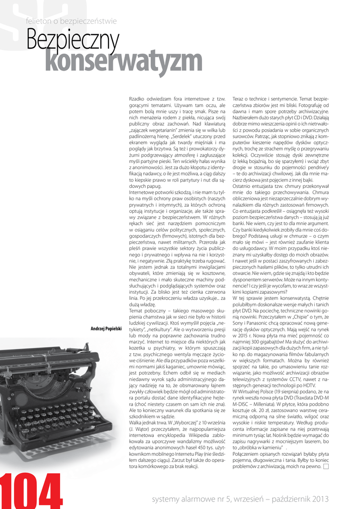 felieton o bezpieczeństwie Bezpieczny konserwatyzm Andrzej Popielski Rzadko odwiedzam fora internetowe z tzw. gorącymi tematami. Używam tam oczu, ale potem bolą mnie uszy i tracę smak. Pisze na nich menażeria rodem z piekła, nicująca swój publiczny obraz zachowań. Nad klawiaturą „zajączek wegetarianin” zmienia się w wilka lub padlinożerną hienę. „Serdelek” utuczony przed ekranem wygląda jak twardy mięśniak i ma poglądy jak brzytwa. Są też i prowokatorzy dyżurni podgrzewający atmosferę i zagłuszające myśli partyjne pieski. Ten wściekły hałas wynika z anonimowości. Jest za dużo kłopotu z identyfikacją nadawcy, o ile jest możliwa, a ciąg dalszy to kiepskie prawo w roli partytury i nut dla sądowych papug. Internetowe potworki szkodzą, i nie mam tu tylko na myśli ochrony praw osobistych (naszych prywatnych i intymnych), za których ochroną optują instytucje i organizacje, ale także sprawy związane z bezpieczeństwem. W różnych rękach sieć jest narzędziem pomocniczym w osiąganiu celów politycznych, społecznych, gospodarczych (firmowych), istotnych dla bezpieczeństwa, nawet militarnych. Przerosła jak pleśń prawie wszystkie sektory życia publicznego i prywatnego i wpływa na nie i korzystnie, i negatywnie. Złą praktykę trzeba rugować. Nie jestem jednak za totalnymi inwigilacjami obywateli, które zmieniają się w kosztowne, mechaniczne i mało skuteczne machiny podsłuchujących i podglądających systemów oraz instytucji. Za blisko jest też cienka czerwona linia. Po jej przekroczeniu władza uzyskuje... za dużą władzę. Temat poboczny – takiego masowego skupienia chamstwa jak w sieci nie było w historii ludzkiej cywilizacji. Ktoś wymyślił pojęcia „netykiety”, „netkultury”. Ale o wytworzeniu presji lub mody na poprawne zachowania trudno marzyć. Internet to miejsce dla niektórych jak kozetka u psychiatry, w którym spuszczają z tzw. psychicznego wentyla męczące życiowe ciśnienie. Ale dla przypadków poza wszelkimi normami jakiś kaganiec, umownie mówiąc, jest potrzebny. Echem odbił się w mediach niedawny wyrok sądu administracyjnego dający nadzieję na to, że obsmarowany łajnem zwykły człowiek będzie mógł od administratora portalu dostać dane identyfikacyjne hejtera (choć niestety czasem on sam ich nie zna). Ale to konieczny warunek dla spotkania się ze szkodnikiem w sądzie. Walka jednak trwa. W „Wyborczej” z 10 września (J. Wątor) przeczytałem, że najpopularniejsza internetowa encyklopedia Wikipedia zablokowała za uporczywe wandalizmy możliwość edytowania anonimowych haseł 450 tys. użytkownikom mobilnego Internetu Play (nie śledziłem dalszego ciągu). Zarzut był także do operatora komórkowego za brak reakcji. Teraz o technice i sentymencie. Temat bezpieczeństwa zbiorów jest mi bliski. Fotografuję od dawna i mam spore potrzeby archiwizacyjne. Nazbierałem dużo starych płyt CD i DVD. Działają dobrze mimo wieszczenia opinii o ich nietrwałości z powodu posiadania w sobie organicznych surowców. Patrząc, jak stopniowo znikają z komputerów kieszenie napędów dysków optycznych, trochę ze strachem myślę o przegrywaniu kolekcji. Oczywiście stosuję dyski zewnętrzne (z lekką bojaźnią, bo się sparzyłem) i wciąż zbyt drogie w stosunku do pojemności pendrive’y – te do archiwizacji chwilowej. Jak dla mnie macierz dyskowa jest pojęciem z innej bajki. Ostatnio entuzjasta tzw. chmury przekonywał mnie do takiego przechowywania. Chmura obliczeniowa jest niezaprzeczalnie dobrym wynalazkiem dla różnych zastosowań firmowych. Co entuzjasta podkreślił – osiągnęła też wysoki poziom bezpieczeństwa danych – stosują ją już banki. Nie wiem, czy jest to dla mnie argument. Czy banki kiedykolwiek zrobiły dla mnie coś dobrego? Podstawą usługi w chmurze – o czym mało się mówi – jest również zaufanie klienta do usługodawcy. W moim przypadku ktoś nieznany mi uzyskałby dostęp do moich obrazów. I nawet jeśli w postaci zaszyfrowanych i zabezpieczonych hasłami plików, to tylko utrudni ich otwarcie. Nie wiem, gdzie się znajdą i kto będzie dysponentem serwerów. Może na innym kontynencie? I czy jeśli je wycofam, to wraz ze wszystkimi kopiami zapasowymi? W tej sprawie jestem konserwatystą. Chętnie polubiłbym doskonalsze wersje małych i tanich płyt DVD. Na pociechę, techniczne nowinki gonią nowinki. Przeczytałem w „Chipie” o tym, że Sony i Panasonic chcą opracować nową generację dysków optycznych. Mają wejść na rynek w 2015 r. Nowa płyta ma mieć pojemność co najmniej 300 gigabajtów! Ma służyć do archiwizacji kopii zapasowych dla dużych firm, a nie tylko np. do magazynowania filmów fabularnych w większych formatach. Można by również spojrzeć na takie, po umasowieniu tanie rozwiązanie, jako możliwość archiwizacji obrazów telewizyjnych z systemów CCTV, nawet z następnych generacji technologii po HDTV. W Wirtualnej Polsce (19 sierpnia) podano, że na rynek weszła nowa płyta DVD (Traxdata DVD-M M-DISC – Milleniata). W płytce, która podobno kosztuje ok. 20 zł, zastosowano warstwę ceramiczną odporną na silne światło, wilgoć oraz wysokie i niskie temperatury. Według producenta informacje zapisane na niej przetrwają minimum tysiąc lat. Nośnik będzie wymagać do zapisu nagrywarki z mocniejszym laserem, bo to „obróbka w kamieniu” . Połączeniem opisanych rozwiązań byłaby płyta pojemna, długowieczna i tania. Byłby to koniec problemów z archiwizacją, moich na pewno. systemy alarmowe nr 5, wrzesień – październik 2013