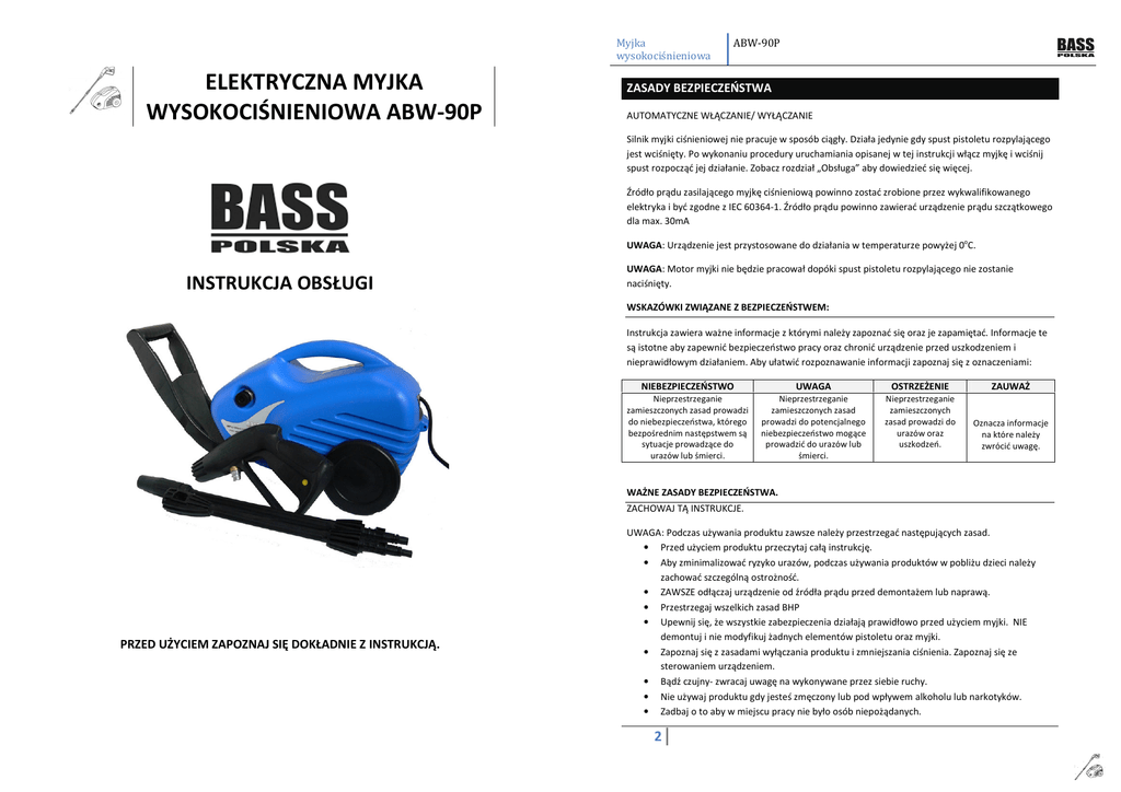 Myjka wysokociśnieniowa ELEKTRYCZNA MYJKA WYSOKOCIŚNIENIOWA ABW-90P ABW-90P ZASADY BEZPIECZEŃSTWA AUTOMATYCZNE WŁĄCZANIE/ WYŁĄCZANIE Silnik myjki ciśnieniowej nie pracuje w sposób ciągły. Działa jedynie gdy spust pistoletu rozpylającego jest wciśnięty. Po wykonaniu procedury uruchamiania opisanej w tej instrukcji włącz myjkę i wciśnij spust rozpocząć jej działanie. Zobacz rozdział „Obsługa” aby dowiedzieć się więcej. Źródło prądu zasilającego myjkę ciśnieniową powinno zostać zrobione przez wykwalifikowanego elektryka i być zgodne z IEC 60364-1. Źródło prądu powinno zawierać urządzenie prądu szczątkowego dla max. 30mA UWAGA: Urządzenie jest przystosowane do działania w temperaturze powyżej 0oC. INSTRUKCJA OBSŁUGI UWAGA: Motor myjki nie będzie pracował dopóki spust pistoletu rozpylającego nie zostanie naciśnięty. WSKAZÓWKI ZWIĄZANE Z BEZPIECZEŃSTWEM: Instrukcja zawiera ważne informacje z którymi należy zapoznać się oraz je zapamiętać. Informacje te są istotne aby zapewnić bezpieczeństwo pracy oraz chronić urządzenie przed uszkodzeniem i nieprawidłowym działaniem. Aby ułatwić rozpoznawanie informacji zapoznaj się z oznaczeniami: NIEBEZPIECZEŃSTWO UWAGA OSTRZEŻENIE ZAUWAŻ Nieprzestrzeganie zamieszczonych zasad prowadzi do niebezpieczeństwa, którego bezpośrednim następstwem są sytuacje prowadzące do urazów lub śmierci. Nieprzestrzeganie zamieszczonych zasad prowadzi do potencjalnego niebezpieczeństwo mogące prowadzić do urazów lub śmierci. Nieprzestrzeganie zamieszczonych zasad prowadzi do urazów oraz uszkodzeń. Oznacza informacje na które należy zwrócić uwagę. WAŻNE ZASADY BEZPIECZEŃSTWA. ZACHOWAJ TĄ INSTRUKCJE. PRZED UŻYCIEM ZAPOZNAJ SIĘ DOKŁADNIE Z INSTRUKCJĄ. UWAGA: Podczas używania produktu zawsze należy przestrzegać następujących zasad. • Przed użyciem produktu przeczytaj całą instrukcję. • Aby zminimalizować ryzyko urazów, podczas używania produktów w pobliżu dzieci należy zachować szczególną ostrożność. • ZAWSZE odłączaj urządzenie od źródła prądu przed demontażem lub naprawą. • Przestrzegaj wszelkich zasad BHP • Upewnij się, że wszystkie zabezpieczenia działają prawidłowo przed użyciem myjki. NIE demontuj i nie modyfikuj żadnych elementów pistoletu oraz myjki. • Zapoznaj się z zasadami wyłączania produktu i zmniejszania ciśnienia. Zapoznaj się ze sterowaniem urządzeniem. • Bądź czujny- zwracaj uwagę na wykonywane przez siebie ruchy. • Nie używaj produktu gdy jesteś zmęczony lub pod wpływem alkoholu lub narkotyków. • Zadbaj o to aby w miejscu pracy nie było osób niepożądanych. 2 Myjka wysokociśnieniowa • • • ABW-90P Nie pochylaj się nad myjką i zawsze stój na stabilnym podłożu podczas pracy. Uzywaj odpowiedniego antypoślizgowego obuwia. Przestrzegaj zasad konserwacji zamieszczonych w instrukcji. Używaj środka czyszczącego dołączonego do myjki lub polecanego przez producenta. Myjka wysokociśnieniowa • ABW-90P Nie obsługuj maszyny gdy jakaś część działa nieprawidłowo lub jest źle podłączona (rączka, pistolet, dysza) UWAGA: OBSŁUGA URZĄDZEŃ Z PODWÓJNĄ IZOLACJĄ. W produktach z podwójnie izolowanych, system izolacji jest zastosowany zamiast uziemienia. Nie powinno się uziemiać produktu. Naprawa urządzeń podwójnie izolowanych wymaga dużej ostrożności i znajomości systemu i powinna być wykonywana przez osoby wykwalifikowane. Wymieniane części w urządzeniach podwójnie izolowanych muszą być takie same jak części oryginalne. Produkty podwójnie izolowane są oznaczone napisem „Double Isulation” lub są oznaczone rysunkiem pokazanym (Rys 1): UWAGA: Uszkodzenia sprzętu. • Zawsze włącz źródło wody zanim włączysz myjkę. Uruchomienie pompy bez wody prowadzi do poważnego uszkodzenia urządzenia. • Nie korzystaj z myjki gdy zdjęta jest osłona wejścia wody. Utrzymuj osłonę w czystości, bez brudu i osadów. • Nie uruchamiaj myjki gdy jakaś część jest zepsuta lub jej brakuje. Sprawdzaj sprzęt regularnie i niezwłocznie napraw lub wymień zużyte elementy. • Używaj jedynie dyszy dołączonej do zestawu. • Nigdy nie zostawiaj buławy bez opieki gdy maszyna jest uruchomiona. • Nie próbuj zmieniać ustawień fabrycznych. Może to doprowadzić do uszkodzenia sprzętu i utraty gwarancji. • Zawsze mocno trzymaj pistolet rozpylający podczas uruchamiania i używania myjki. • Nie pozwól aby myjka pracowała więcej niż minutę z zamkniętym spustem. Powoduje to narastanie temperatury i może doprowadzić do uszkodzenia sprzętu. • Myjka nie jest przystosowana do pompowania gorącej wody. Nie podłączaj myjki pod ciepłą wodę ponieważ skróci to znacząco żywotność urządzenia. • Nie przechowuj myjki na zewnątrz gdy jest niska temperatura. Pompa może ulec poważnym uszkodzeniom. • Zwolnij spust gdy zmieniasz ciśnienie z wysokiego na niskie aby chronić maszynę przed uszkodzeniem. • Wąż wysokociśnieniowy, złącza oraz połączenia są ważne dla bezpieczeństwa urządzenia. Używaj jedynie elementów polecanych przez producenta. • Nie używaj myjki gdy kabel zasilający lub inna ważna część jest uszkodzona. Na przykład zabezpieczenia, wąż wysokociśnieniowy, spust pistoletu. • Bądź świadomy siły odrzutu jaką wytwarza strumień wody podczas pracy myjki. UWAGA: Nie używaj ciśnienia, które przekracza ciśnienie robocze elementu myjki (węże, złączki itp.) będącego pod ciśnieniem. Upewnij się, że cały sprzęt i akcesoria są przystosowane do maksymalnego ciśnienia roboczego myjki. OSTRZEŻENIE: Utrzymuj wąż z dala od ostro zakończonych przedmiotów. Osłona węża może ulec uszkodzeniu. Regularnie sprawdzaj wąż i wymień jeśli jest uszkodzony. Nie próbuj naprawiać uszkodzonego węża. UWAGA: Ryzyko eksplozji. Nigdy nie rozpylaj łatwopalnych płynów i nie używaj myjki wysokoci