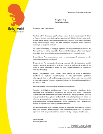 Warszawa, 1 czerwca 2012 roku Prezydent Rosji Pan Władimir Putin Szanowny Panie Prezydencie! Fundacja „PRO – Prawo do życia” walczy o prawo do życia nienarodzonych dzieci w Polsce. Nie jest nam obojętny los najmniejszych dzieci w innych państwach. Wasz kraj jest, niestety, na jednym z pierwszych miejsc na świecie pod względem liczby dokonywanych aborcji. Żal nam milionów rosyjskich dzieci corocznie zabijanych w rosyjskich klinikach. Jak się dowiedzieliśmy, w ubiegłym tygodniu nasi rosyjscy koledzy skierowali do Pana petycję, w której przywódca Ruchu antyaborcyjnego „Wojownicy Życia” Dmitrij Baranow prosi, aby korzystając z prawa inicjatywy ustawodawczej: 1) zainicjował Pan wprowadzenie zmian w obowiązujących ustawach w celu zniesienia dopuszczalności aborcji; 2) zainicjował Pan wprowadzenie normy prawnej, która jednoznacznie określi moment poczęcia jako granicę, od której dziecko w łonie matki uznaje się za żywe, a zatem posiadające prawo do życia zagwarantowane w Konstytucji Federacji Rosyjskiej. Petycja „Wojowników Życia” zawiera także prośbę do Pana o wniesienie zapytania do Trybunłu Konstytucyjnego w celu sprawdzenia zgodności z Konstytucją Ustawy „O podstawowych zasadach ochrony zdrowia obywateli w Federacji Rosyjskiej” (Ustawa Rosyjskiej Federacji Nr 323 z 21 listopada 2011 r., art. 53, p. 1, p.4). Bardzo prosimy o zwrócenie uwagi na wspomnianą petycję! Ponadto, chcielibyśmy poinformować Pana, iż rosyjskim obrońcom życia niejednokrotnie odmawiano pozwolenia na pikiety pod Dumą Państwową i Zgromadzeniem Ustawodawczym Sankt-Petersburga. Rosyjscy obrońcy życia nie mają przecież zamiaru zgłaszać podczas tych akcji żądań politycznych, zależy im tylko na przedstawieniu swojego stanowiska deputowanym. Tymczasem, jak dowiedzieliśmy się od naszych kolegów z Ruchu „Wojownicy Życia”, powody, dla których im się odmawia, nie mają podstaw prawnych. My, polscy obrońcy życia, możemy swobodnie pikietować pod Sejmem. Prosimy Pana, jako gwaranta Konstytucji oraz praw i swobód obywateli Rosji, aby, zgodnie z prawem, mieli taką możliwość nasi rosyjscy koledzy – rosyjscy obrońcy życia. Z poważaniem, Mariusz Dzierżawski