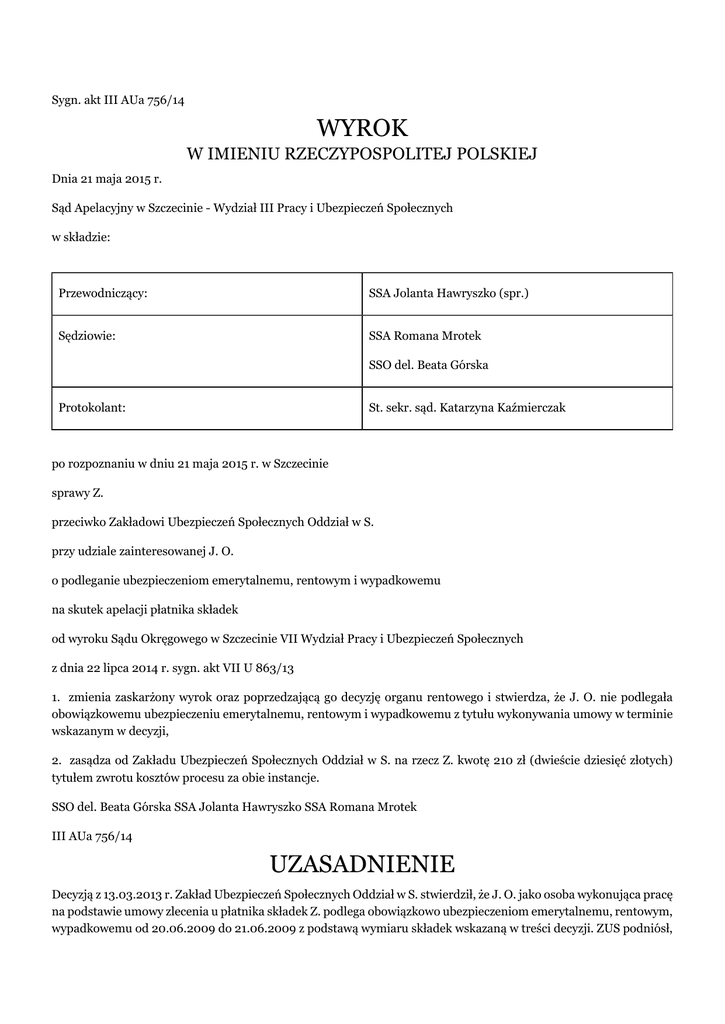 Sygn. akt III AUa 756/14 WYROK W IMIENIU RZECZYPOSPOLITEJ POLSKIEJ Dnia 21 maja 2015 r. Sąd Apelacyjny w Szczecinie - Wydział III Pracy i Ubezpieczeń Społecznych w składzie: Przewodniczący: SSA Jolanta Hawryszko (spr.) Sędziowie: SSA Romana Mrotek SSO del. Beata Górska Protokolant: St. sekr. sąd. Katarzyna Kaźmierczak po rozpoznaniu w dniu 21 maja 2015 r. w Szczecinie sprawy Z. przeciwko Zakładowi Ubezpieczeń Społecznych Oddział w S. przy udziale zainteresowanej J. O. o podleganie ubezpieczeniom emerytalnemu, rentowym i wypadkowemu na skutek apelacji płatnika składek od wyroku Sądu Okręgowego w Szczecinie VII Wydział Pracy i Ubezpieczeń Społecznych z dnia 22 lipca 2014 r. sygn. akt VII U 863/13 1. zmienia zaskarżony wyrok oraz poprzedzającą go decyzję organu rentowego i stwierdza, że J. O. nie podlegała obowiązkowemu ubezpieczeniu emerytalnemu, rentowym i wypadkowemu z tytułu wykonywania umowy w terminie wskazanym w decyzji, 2. zasądza od Zakładu Ubezpieczeń Społecznych Oddział w S. na rzecz Z. kwotę 210 zł (dwieście dziesięć złotych) tytułem zwrotu kosztów procesu za obie instancje. SSO del. Beata Górska SSA Jolanta Hawryszko SSA Romana Mrotek III AUa 756/14 UZASADNIENIE Decyzją z 13.03.2013 r. Zakład Ubezpieczeń Społecznych Oddział w S. stwierdził, że J. O. jako osoba wykonująca pracę na podstawie umowy zlecenia u płatnika składek Z. podlega obowiązkowo ubezpieczeniom emerytalnemu, rentowym, wypadkowemu od 20.06.2009 do 21.06.2009 z podstawą wymiaru składek wskazaną w treści decyzji. ZUS podniósł, że J. O. łączyła we wskazanym okresie z Z. umowa o świadczenie usług, do której stosuje się przepisy o umowie zlecenia, ponieważ czynności powierzone w ramach analizowanej umowy - przygotowanie i wykonanie prezentacji rzemiosła wikliniarskiego podczas imprezy Noc Kupały - W poszukiwaniu tradycji wspólnego P. - wymagały jedynie starannego działania. Z decyzją nie zgodził się płatnik składek Z., który w odwołaniu wniósł o jej zmianę przez ustalenie, że J. O., jako osoba wykonująca pracę na podstawie umowy zlecenia, nie podlegała obowiązkowemu ubezpieczeniu emerytalnemu, rentowemu i wypadkowemu w okresie objętym zaskarżoną decyzją. Płatnik zarzucił organowi rentowemu niewyjaśnienie wszystkich istotnych dla sprawy okoliczności, w szczególności, że zawarto umowę z twórcą i umowa winna odbywać się wyłącznie na podstawie przepisów wynikających z ustawy prawo autorskie i prawa pokrewne; w trakcie realizacji zakwestionowanej umowy zainteresowana musiała nie tylko być animatorem interaktywnie uczestniczącym w prezentacji dawnych zwyczajów i technik wyrobu dawnego rzemiosła, ale nadto musiała wytwarzać w czasie rzeczywistym konkretne „dzieła” np. wypleść koszyk. W odpowiedzi na odwołanie organ rentowy wniósł o jego oddalenie. Sąd Okręgowy w Szczecinie VII Wydział Pracy i Ubezpieczeń Społecznych postanowieniem z 12.08.2013 sąd wezwał do udziału w sprawie J. O. w charakterze strony zainteresowanej, natomiast wyrokiem z 22 lipca 2014 oddalił odwołanie i zasądził na rzecz Zakładu Ubezpieczeń Społecznych Oddział w S. 60 zł zwrotu kosztów zastępstwa procesowego. Sąd okręgowy ustalił, że płatnik składek Z. prowadzi działalność gospodarczą w zakresie wspierania twórczości artystycznej, rozpowszechniania kultury i sztuki oraz badania, dokumentowania i propagowania dziejów i historycznej roli Z. Książąt (...), miasta S. i województwa (...). W okresie przesilenia letniego organizuje dwudniową imprezę plenerową pod nazwą Noc Kupały, w trakcie której prezentowane są dawne rzemiosła przez m.in. kowali, cieśli, osoby wypalające podpłomyki, wędzarzy ryb, garncarzy, wikliniarzy. Zainteresowana J. O. zawarła z Z. Książąt (...) w (...).06.2009 r. umowę nr (...) o dzieło, której przedmiotem było przygotowanie i prezentacja rzemiosła wikliniarskiego podczas imprezy Noc Kupały – W poszukiwaniu tradycji wspólnego P., za wynagrodzeniem 1.500 zł, ustalono wykonanie w okresie 20.06.2009/ 21.06.2009. Za wykonanie umowy J. O. otrzymała umówione wynagrodzenie. W ramach umowy zainteresowana dawała pokazy wykonywania dawnego rzemiosła na oczach publiczności, uczyła jak wykonywać prezentowane prace. Sąd okręgowy nie uwzględnił odwołania jako podstawę wskazując art. 6 ust. 1 pkt 4 ustawy 13.10.1998 r. o systemie ubezpieczeń społecznych (Dz. U. 2009 r., Nr 205, poz. 1585 ze zm.), który stanowi, że obowiązkowo ubezpieczeniom emerytalnemu i rentowym podlegają osoby fizyczne, które na obszarze Rzeczypospolitej Polskiej wykonują pracę na podstawie umowy agencyjnej lub umowy zlecenia albo innej umowy o świadczenie usług, do której zgodnie z Kodeksem cywilnym stosuje się przepisy dotyczące zlecenia, zwanymi dalej "zleceniobiorcami", oraz osobami z nimi współpracującymi, z zastrzeżeniem ust. 4. Osoby podlegające ubezpieczeniom emerytalnemu i rentowym podlegają obowiązkowo ubezpieczeniu wypadkowemu (art. 12 ust. 1 ustawy). Stosownie do treści art. 13 pkt 2 ww. ustawy, obowiązkowo ubezpieczeniom emerytalnemu, rentowym i wypadkowemu podlegają osoby wykonujące pracę nakładczą oraz zleceniobiorcy - od dnia oznaczonego w umowie jako dzień rozpoczęcia jej wykonywania do dnia rozwiązania lub wygaśnięcia tej umowy. Skoro przepis art. 6 ustawy o systemie ubezpieczeń społecznych wymieniając osoby fizyczne, które obowiązkowo podlegają ubezpieczeniom emerytalnemu i rentowym, nie obejmuje tą kategorią osób wykonujących pracę na podstawie umów o dzieło, niewątpliwym jest, że osoby te nie podlegają obowiązkowo ubezpieczeniom emerytalnemu i rentowym oraz wypadkowemu. Sąd okręgowy na podstawie art. 627 k.c. rozważył istotę umowy o dzieła oraz na podstawie art. 750 k.c. umowę o świadczenie usług; rozważył też zastosowania zasady wyrażonej w art. 6 k.c. Wskazał ostatecznie, że przez brak stawiennict