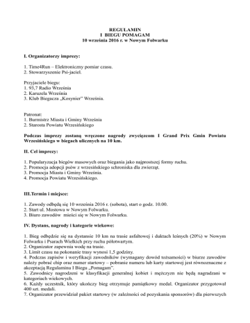 REGULAMIN I BIEGU POMAGAM 10 września 2016 r. w Nowym Folwarku I. Organizatorzy imprezy: 1. Time4Run – Elektroniczny pomiar czasu. 2. Stowarzyszenie Psi-jaciel. Przyjaciele biegu: 1. 93,7 Radio Września 2. Karuzela Września 3. Klub Biegacza „Kosynier” Września. Patronat: 1. Burmistrz Miasta i Gminy Września 2. Starosta Powiatu Wrzesińskiego Podczas imprezy zostaną wręczone nagrody zwycięzcom I Grand Prix Gmin Powiatu Wrzesińskiego w biegach ulicznych na 10 km. II. Cel imprezy: 1. Popularyzacja biegów masowych oraz biegania jako najprostszej formy ruchu. 2. Promocja adopcji psów z wrzesińskiego schroniska dla zwierząt. 3. Promocja Miasta i Gminy Września. 4. Promocja Powiatu Wrzesińskiego. III.Termin i miejsce: 1. Zawody odbędą się 10 września 2016 r. (sobota), start o godz. 10.00. 2. Start ul. Mostowa w Nowym Folwarku. 3. Biuro zawodów mieści się w Nowym Folwarku. IV. Dystans, nagrody i kategorie wiekowe: 1. Bieg odbędzie się na dystansie 10 km na trasie asfaltowej i duktach leśnych (20%) w Nowym Folwarku i Psarach Wielkich przy ruchu półotwartym. 2. Organizator zapewnia wodę na trasie. 3. Limit czasu na pokonanie trasy wynosi 1,5 godziny. 4. Podczas zapisów i weryfikacji zawodników (wymagany dowód tożsamości) w biurze zawodów należy pobrać chip oraz numer startowy – pobranie numeru lub karty startowej jest równoznaczne z akceptacją Regulaminu I Biegu „Pomagam”. 5. Zawodnicy nagrodzeni w klasyfikacji generalnej kobiet i mężczyzn nie będą nagradzani w kategoriach wiekowych. 6. Każdy uczestnik, który ukończy bieg otrzymuje pamiątkowy medal. Organizator przygotował 400 szt. medali. 7. Organizator przewidział pakiet startowy (w zależności od pozyskania sponsorów) dla pierwszych 400 zawodników, którzy w biurze zawodów odbiorą numer startowy. 8. Po biegu organizator zapewnia ciepły posiłek oraz napoje. 9. Kategorie wiekowe: K, M - 20 /16 - 29 lat/ K, M - 30 /30 - 39 lat/ K, M - 40 /40 - 49 lat/ K, M - 50 /50 - 59 lat/ K, M - 60 /60 - 69 lat K, M - 70 /70 i więcej lat O przynależności do poszczególnych kategorii decyduje rocznik urodzenia. 10. Nagrody w klasyfikacji generalnej kobiet i mężczyzn oraz dla trzech najlepszych w każdej kategorii wiekowej – statuetki i puchary. 11. Dodatkowa klasyfikacja dla kobiet i mężczyzn zamieszkałych na terenie Powiatu Wrzesińskiego. VII. Uczestnictwo: 1.W celu weryfikacji każdy zawodnik musi zgłosić się osobiście 10 września 2016 r. w biurze zawodów. 2. W biegu mogą brać udział wszyscy uczestnicy, którzy do dnia biegu, tj. 10 września 2016 r. ukończyli 16 rok życia. 3.Uczestnicy biegu mogą biec ze swoimi Psi-jacielami, które będą w kagańcach. 4. Zawodnicy powyżej 18 roku życia podpisują oświadczenie o biegu na własną odpowiedzialność. (Zawodnicy zobowiązani są do przedstawieni zaświadczenia lekarskiego o zdolności do udziału w biegach długodystansowych lub do podpisania oświadczenia udziału na własną odpowiedzialność). Osoby w wieku 16-18 lat (które w dniu biegu, tj. 10 września 2016 r. nie osiągnęły jeszcze pełnoletności) zobowiązane są do posiadania pozwolenia na udział od rodziców lub prawnych opiekunów, z ich podpisem i nr PESEL. Warunkiem dopuszczenia ich do startu jest obecność rodzica lub opiekuna wraz z dowodem osobistym w momencie weryfikacji zawodnika w biurze zawodów. 5.Każdy zawodnik musi wyrazić zgodę na przetwarzanie danych osobowych dla celów weryfikacji i umieszczenia w komunikacie końcowym. 6.Każdy zawodnik ma obowiązek zapoznania się z regulaminem biegu i zobowiązany jest do jego przestrzegania. Pobranie numeru startowego jest równoznaczne z akceptacją regulaminu biegu. 7.Organizator nie ubezpiecza zawodników na czas biegu. 8.Organizator nie zabezpiecza noclegów. VIII. Sprawy finansowe: 1.Opłata startowa wynosi: 38 zł dla osób, które dokonują zgłoszenia i wpłaty do 5 września 2016 r., 50 zł dla osób, które dokonują zgłoszenia i wpłaty w sekretariacie w dniu zawodów, 15 zł dla Psich-przyjaciół (koszty medalu i nr startowego). 2. Opłatę startową należy wpłacać na konto firmy prowadzącej zapisy: T4R Marcin Chwiłkowski, Gutowo Małe, ul. Powidzka 17, 62-300 Września, bank ING 31 1050 1852 1000 0092 0919 6642 lub poprzez aplikację PayU. Organizator, odpowiadając na apel o pomoc, w opłacie startowej przewidział kwotę 5 zł od zawodnika jako darowiznę na rzecz Stowarzyszenia Psi-jaciel z przeznaczeniem na wsparcie działań tego Stowarzyszenia w działaniach związanych ze wspomaganiem działalności wrzesińskiego schroniska dla zwierząt. 3. W tytule wpłaty/przelewu bankowego należy wpisać imię i nazwisko, datę urodzenia, przynależność klubową i miejsce zamieszkania uczestnika, którego opłata startowa dotyczy. 4. Wpłacona opłata startowa nie podlega zwrotowi. 5. Koszty organizacyjne ponoszą organizatorzy. IX. Zgłoszenia: 1. Ustalony został limit 400 uczestników. Za osobę zgłoszoną uważa się osobę, która wypełniła i przesłała formularz zgłoszeniowy oraz dokonała opłaty startowej. W momencie zgłoszenia i dokonania opłaty startowej przez 400 osób lista startowa zostanie zamknięta. Przewiduje się dodatkowe miejsca dla zaproszonych uczestników, gości i przedstawicieli sponsorów. 2. Zgłoszeń można dokonywać drogą elektroniczną poprzez wypełnienie odpowiedniego formularza na stronie: www.time4run.com.pl do 5 września 2016 r. do godz. 24.00 lub w dniu zawodów w biurze w Nowym Folwarku. 3. Numer startowy i pakiet należy odebrać w sekretariacie zawodów w godzinach 8:00 – 9:00 w dniu biegu. X. Postanowienia końcowe: 1.Wyniki biegu dostępne będą dla wszystkich po zakończeniu imprezy na tablicy ogłoszeń oraz na stronie internetowej Time4Run. 2.Pomiar czasu dokonywany będzie za pomocą chipów. Brak chipa podczas biegu skutkować będzie dyskwalifikacją. 3.Zawody odbędą się bez względu na warunki atmosferyczne. 4.Org
