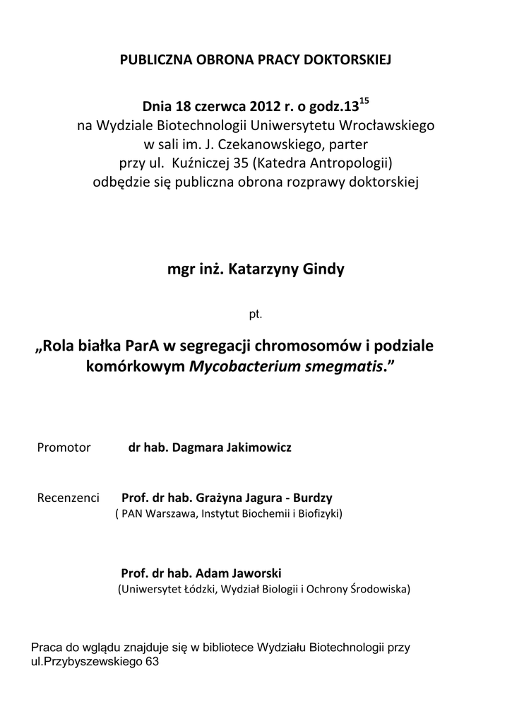 Obrona pracy doktorskiej - Wydział Biotechnologii, UWr